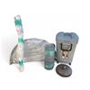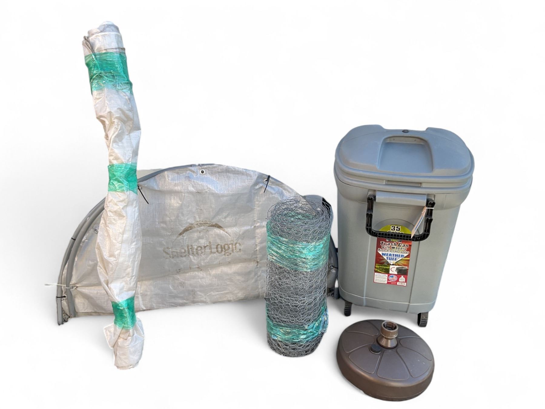 Garden Lot.. Mighty Tuff 35 Gallon Garbage Can, Chicken Wire Approx 2' X 25', Shelter Logic Garden Cover/ Shelter 4' X 4', Umbrella Stand