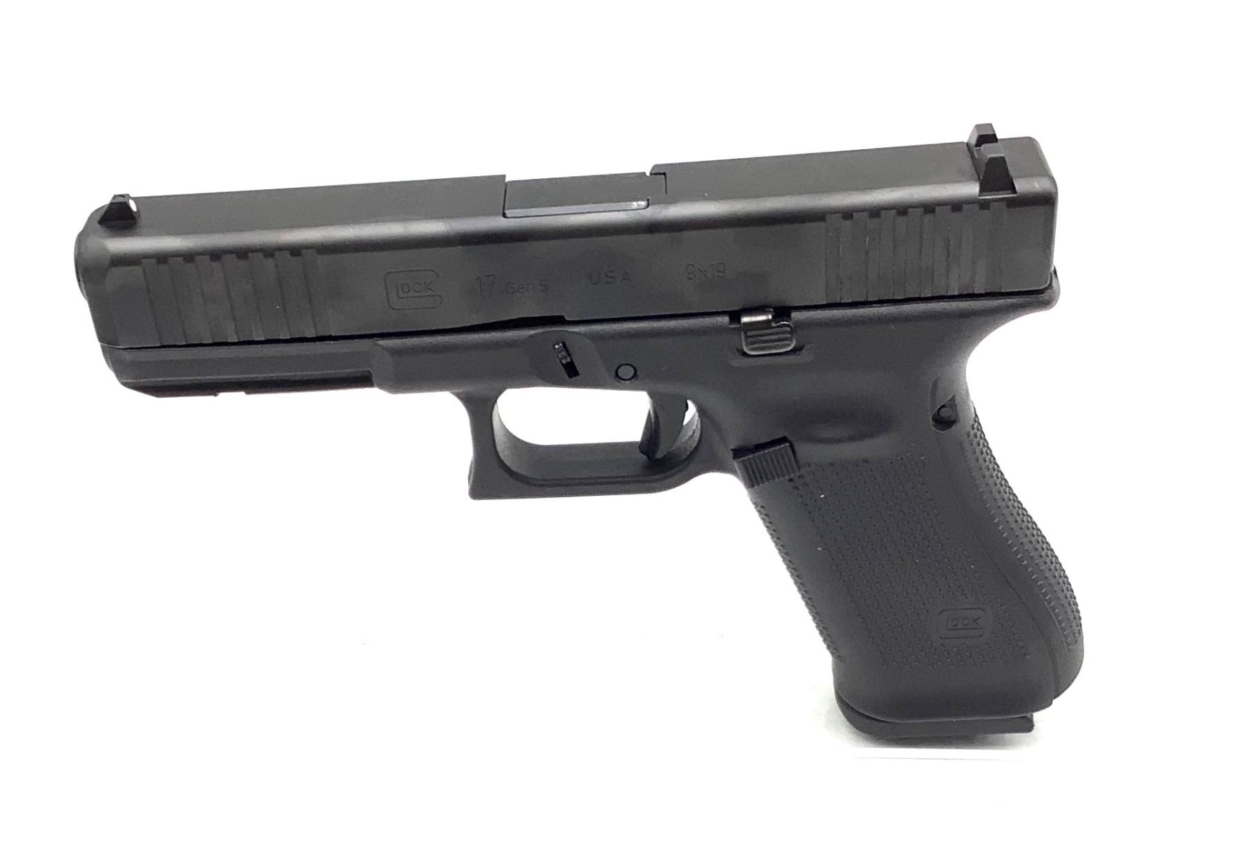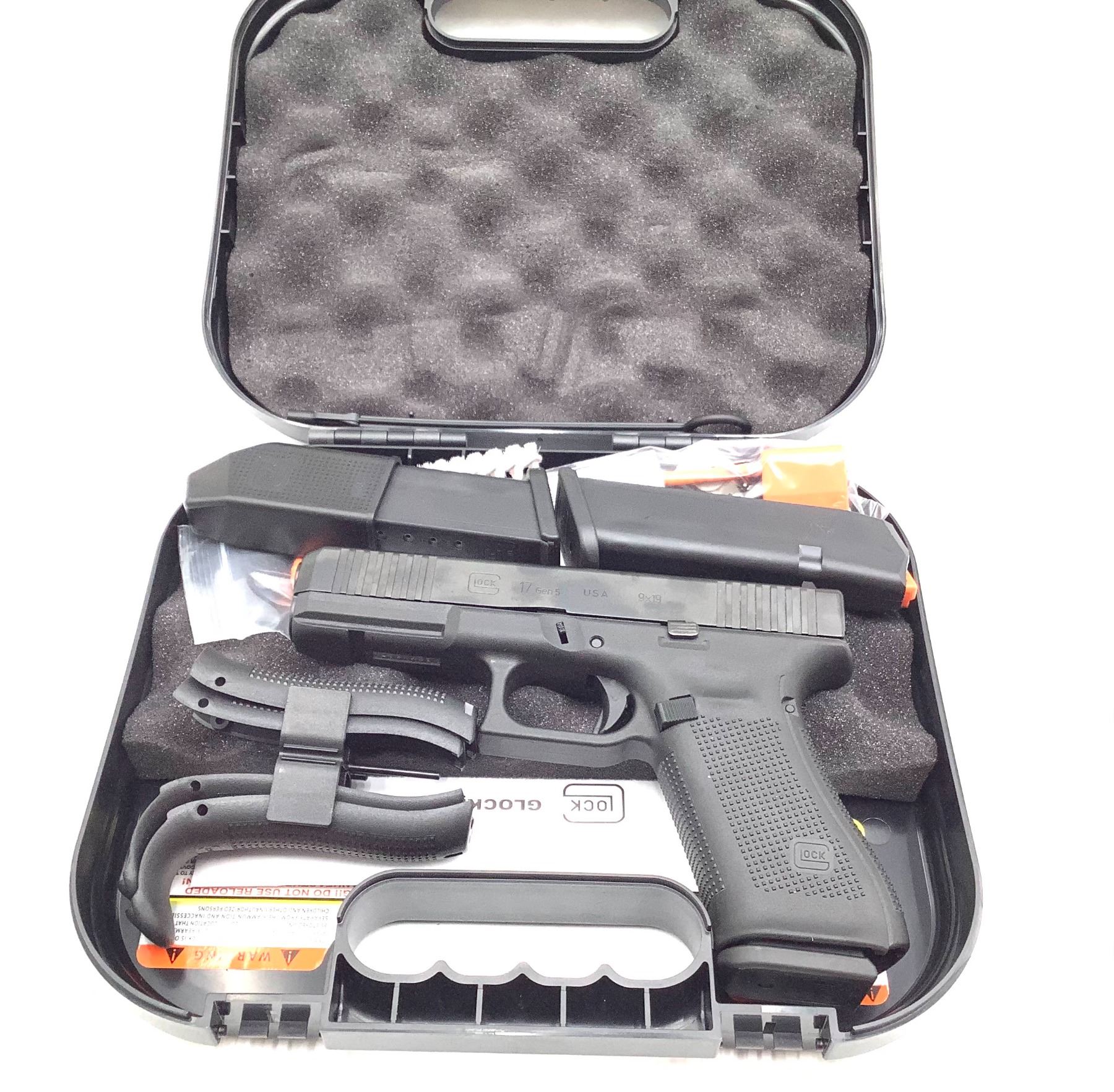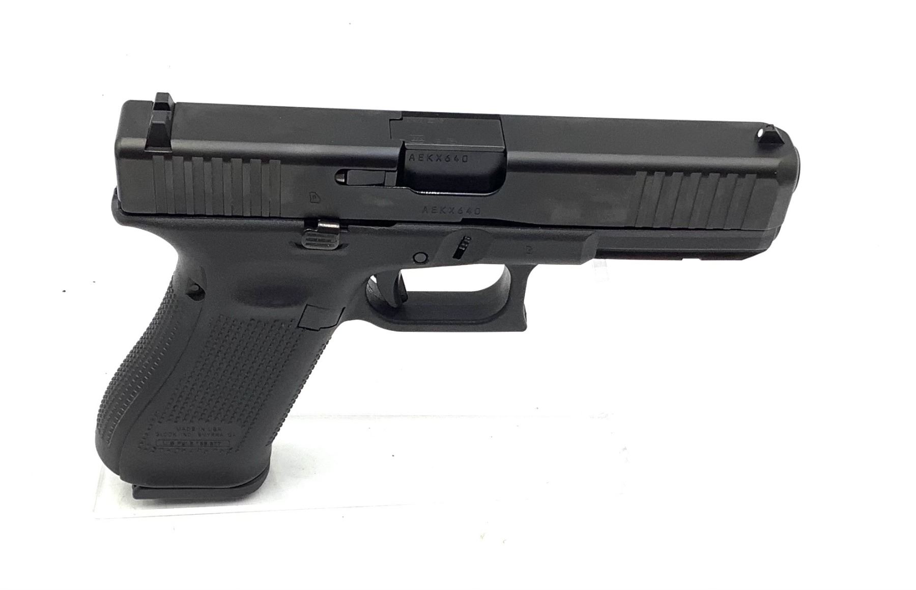 A new in case Glock 17 Gen 5 Semi Auto 9 MM Pistol, comes with mag loader, lock, cleaning brush and 3 magazine. This is a restricted firearm.