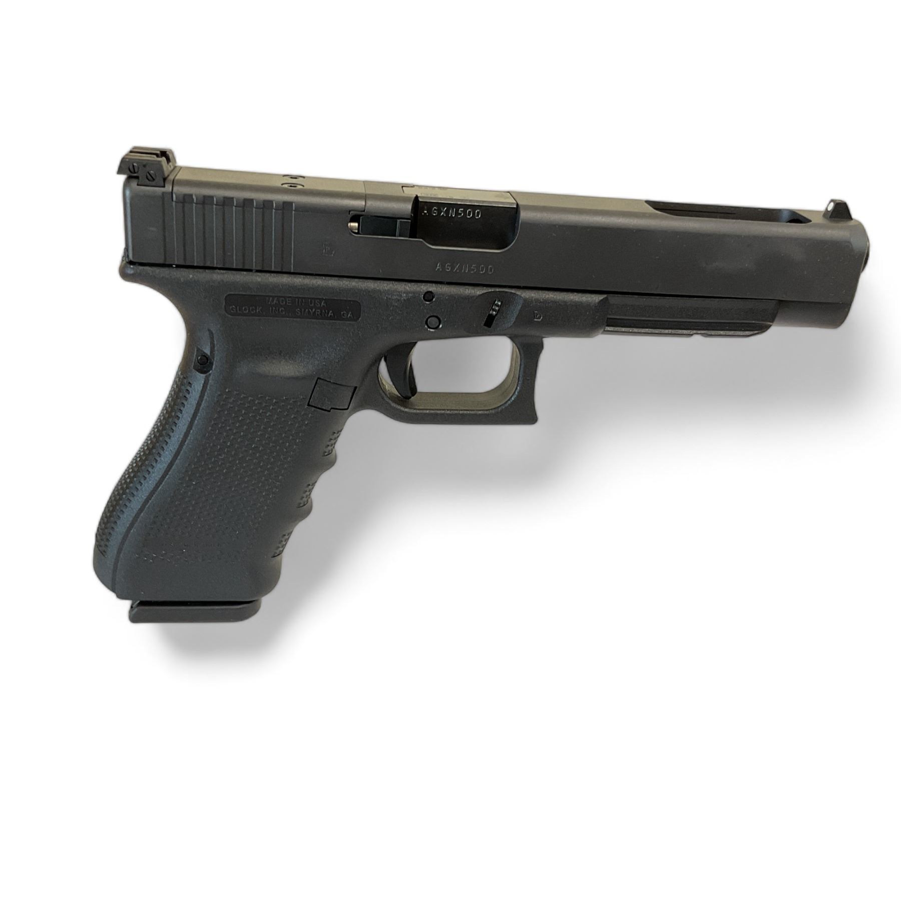 Glock G34 Gen 4 Semi Auto Pistol 9MM 5.3" Barrel Restricted, New. Includes 2 detachable magazines, interchangeable back strap and plastic case.