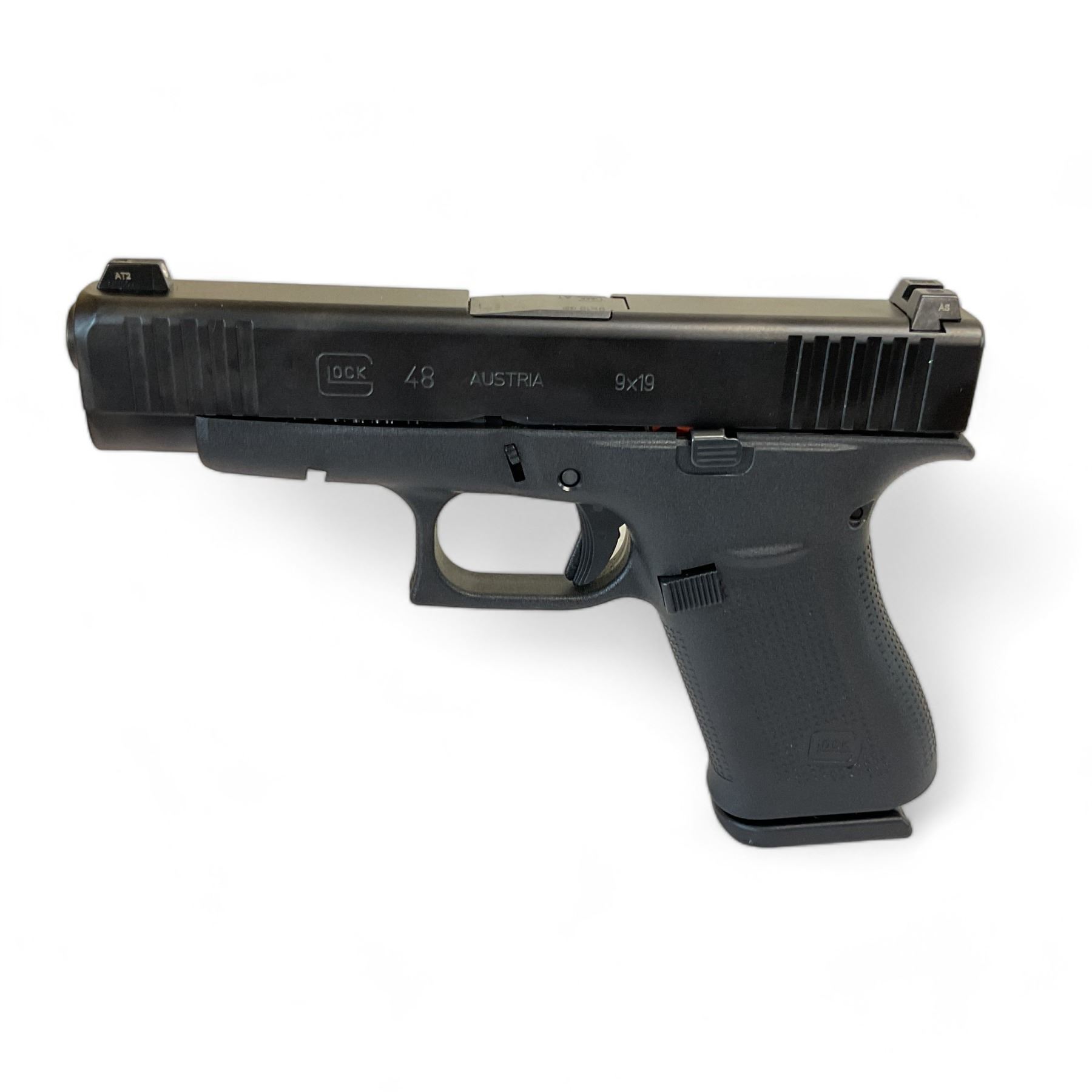 Glock G48 Semi Auto Pistol 9MM 4.25" Barrel, Restricted. Includes 2 detachable magazines and plastic hard case.
