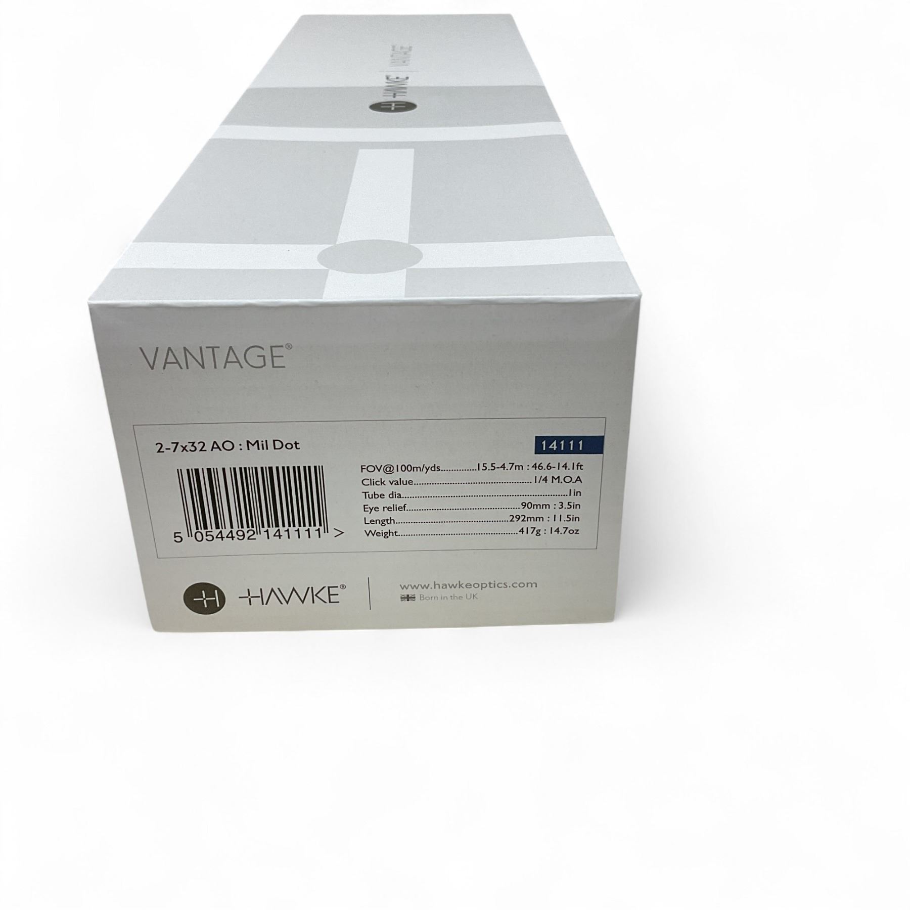 Hawke Vantage 2-7x32mm AO Scope, Mil Dot Reticle, 1" Tube, New