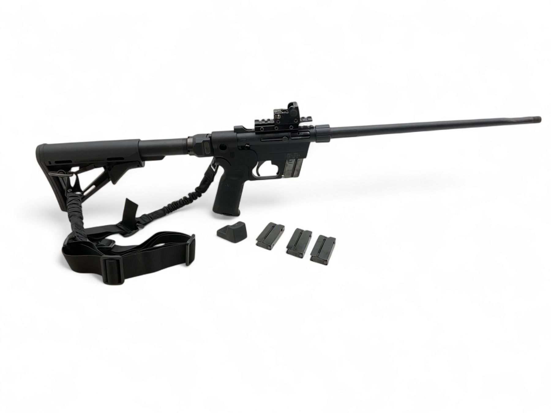 Henry AR7 Takedown US Survival Rifle Semi Auto .22LR 16" Threaded Barrel Custom Stock With Red Dot Sight. Comes with 4 detachable magazines. Haga Defense stock adapter installed with Magpul CTR adjustable stock. Barrel has been ground down at front and no front sight present. Rail riser installed with holographic red dot sight. Also includes sling. This is a non-restricted firearm.