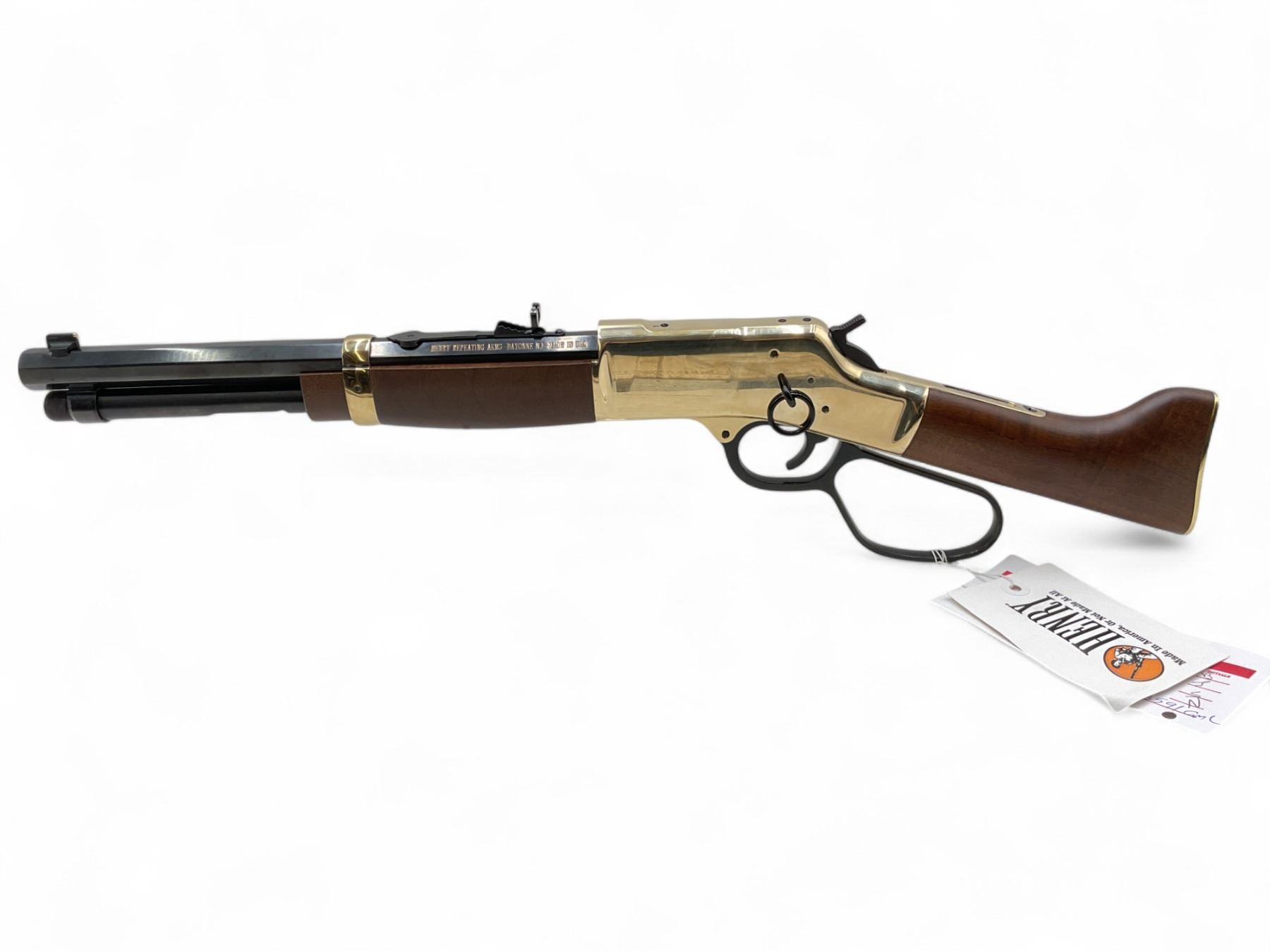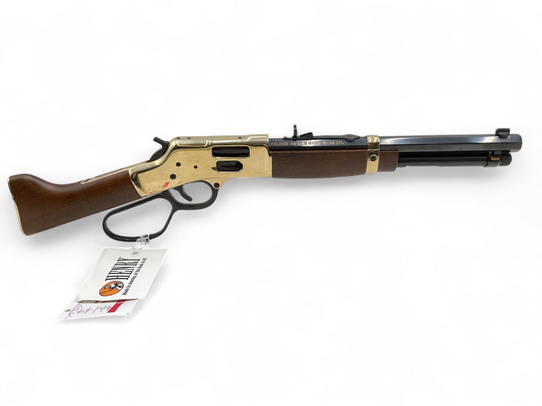 Henry Big Boy Lever Action Rifle .44 Mag 12" Octagon Barrel Side Gate Blued Mares Leg Stock, New. Tubular magazine, brass receiver with saddle ring. Fixed front sight, adjustable rear sight. This is a non-restricted firearm.