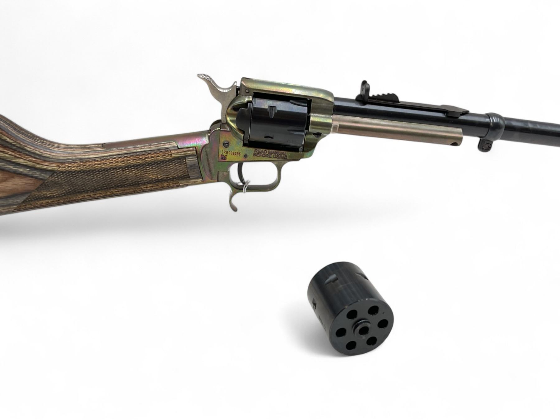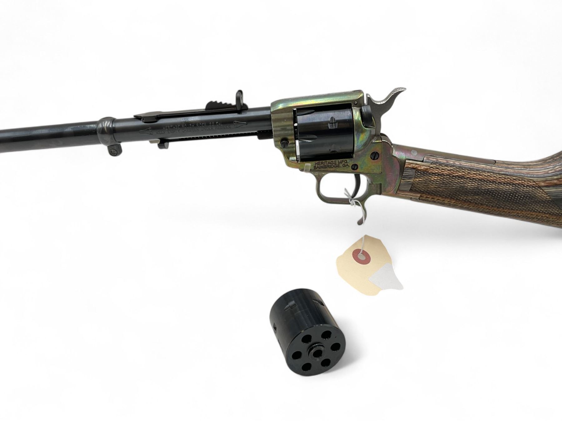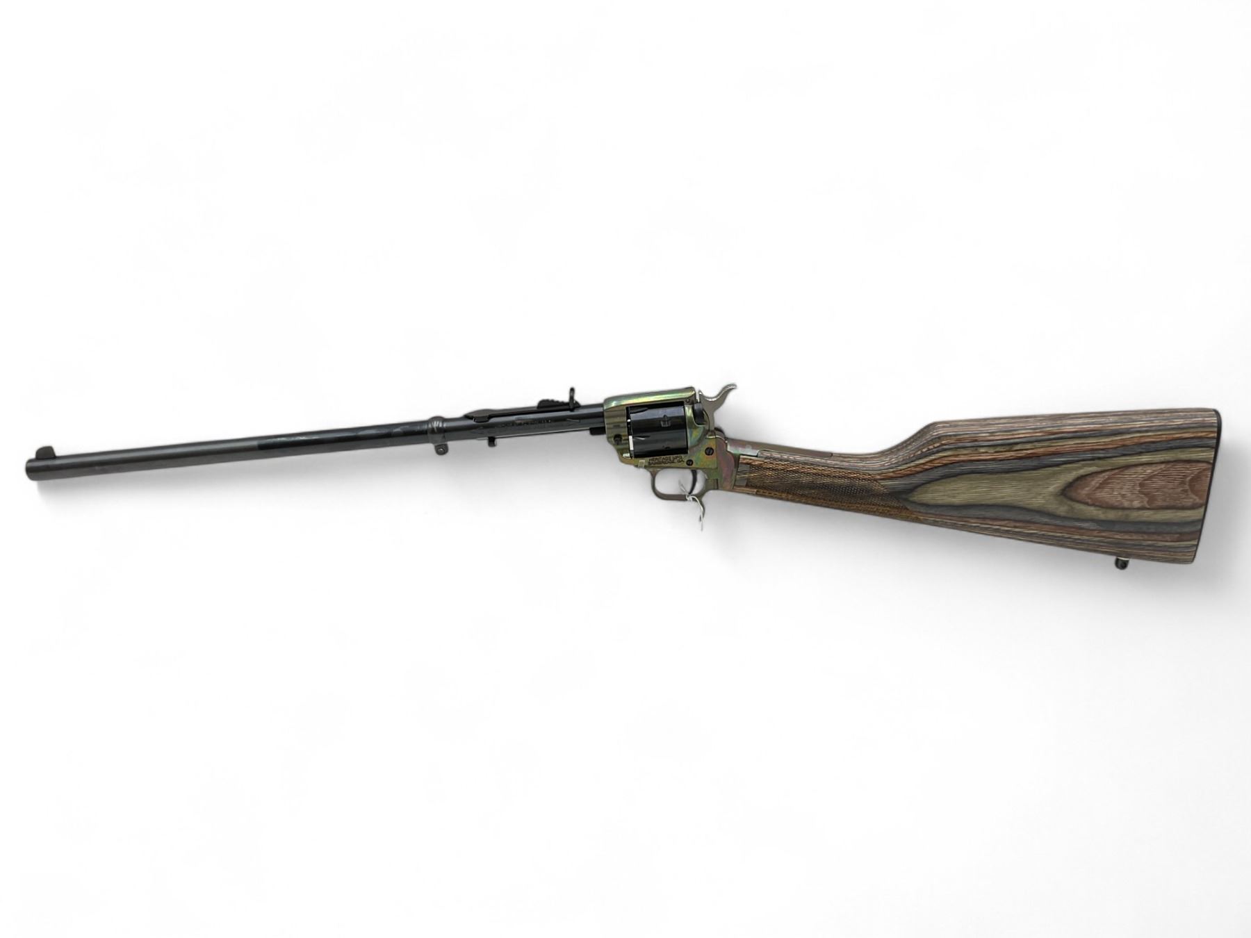Heritage Rough Rider Rancher Single Action Revolver Rifle 22LR / .22 WMR 16" Barrel Laminate Stock. 6 round .22LR cylinder and 6 round .22 WMR cylinder. Factory open sights. This is a non-restricted firearm.
