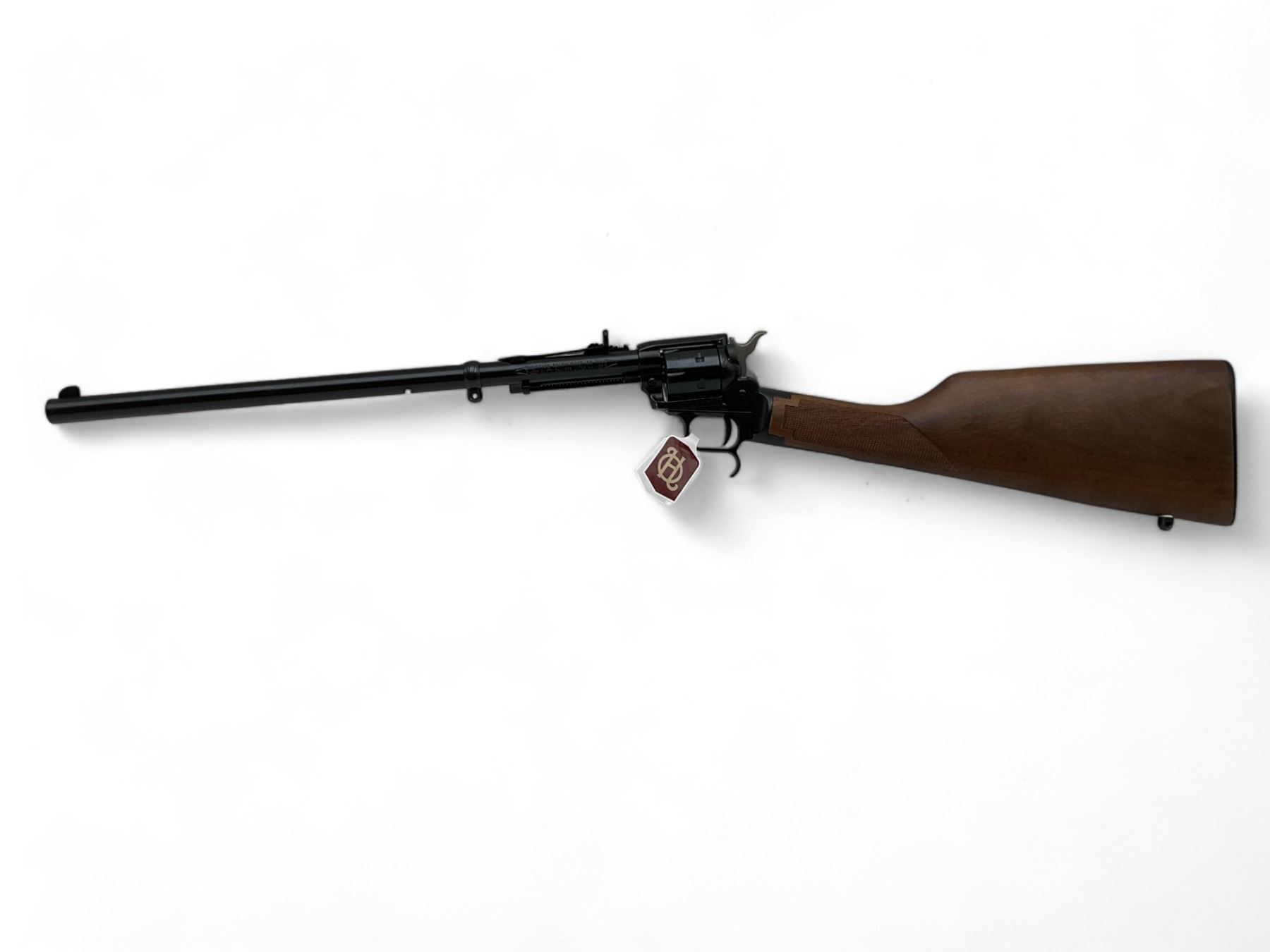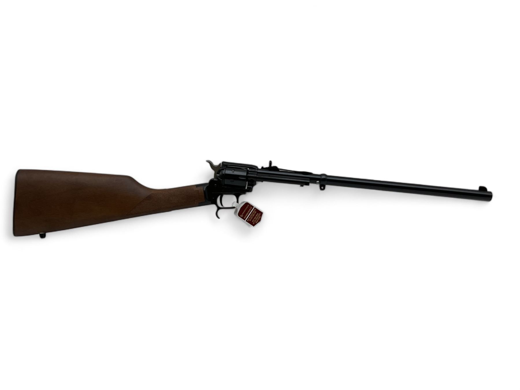 Heritage Rough Rider Revolver Rancher Carbine 22LR 16" Barrel Wood Stock, New. 6 round capacity, buck horn sights. Leather sling included. This is a non-restricted firearm.
