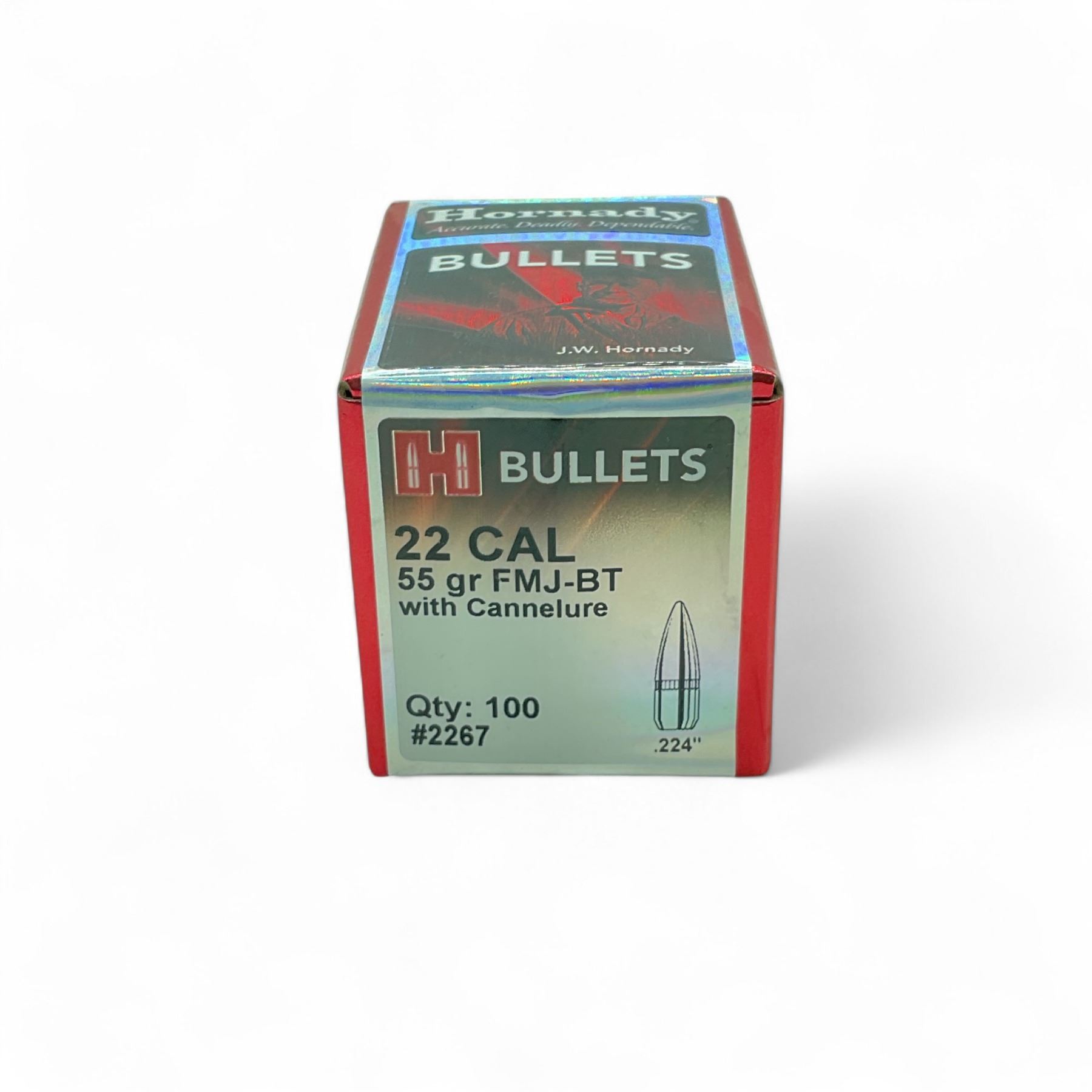 Hornady 22 Cal .224" 55 Grain FMJ-BT with Cannelure Projectiles, 100 Qty