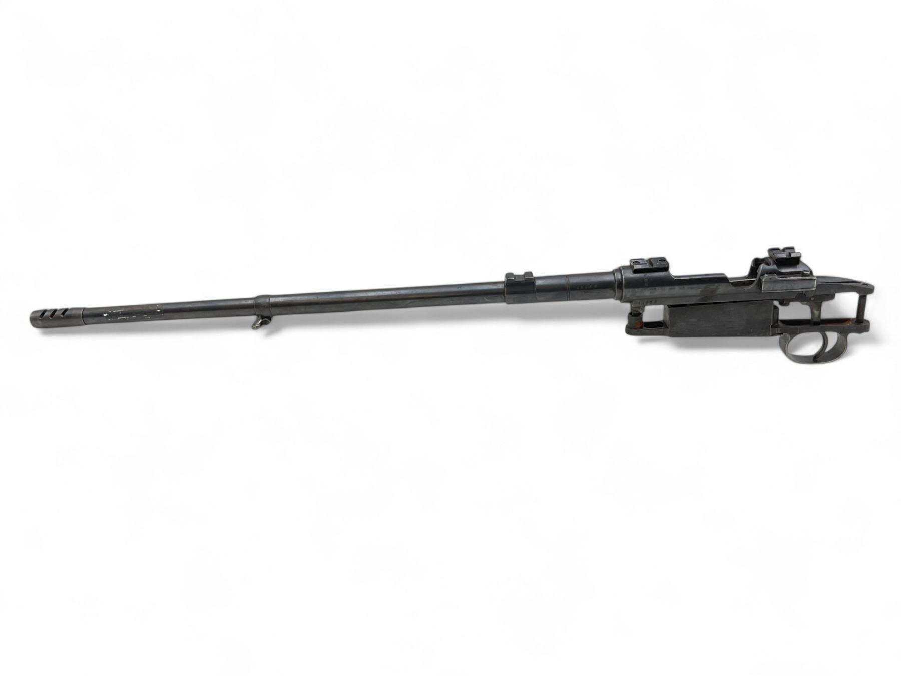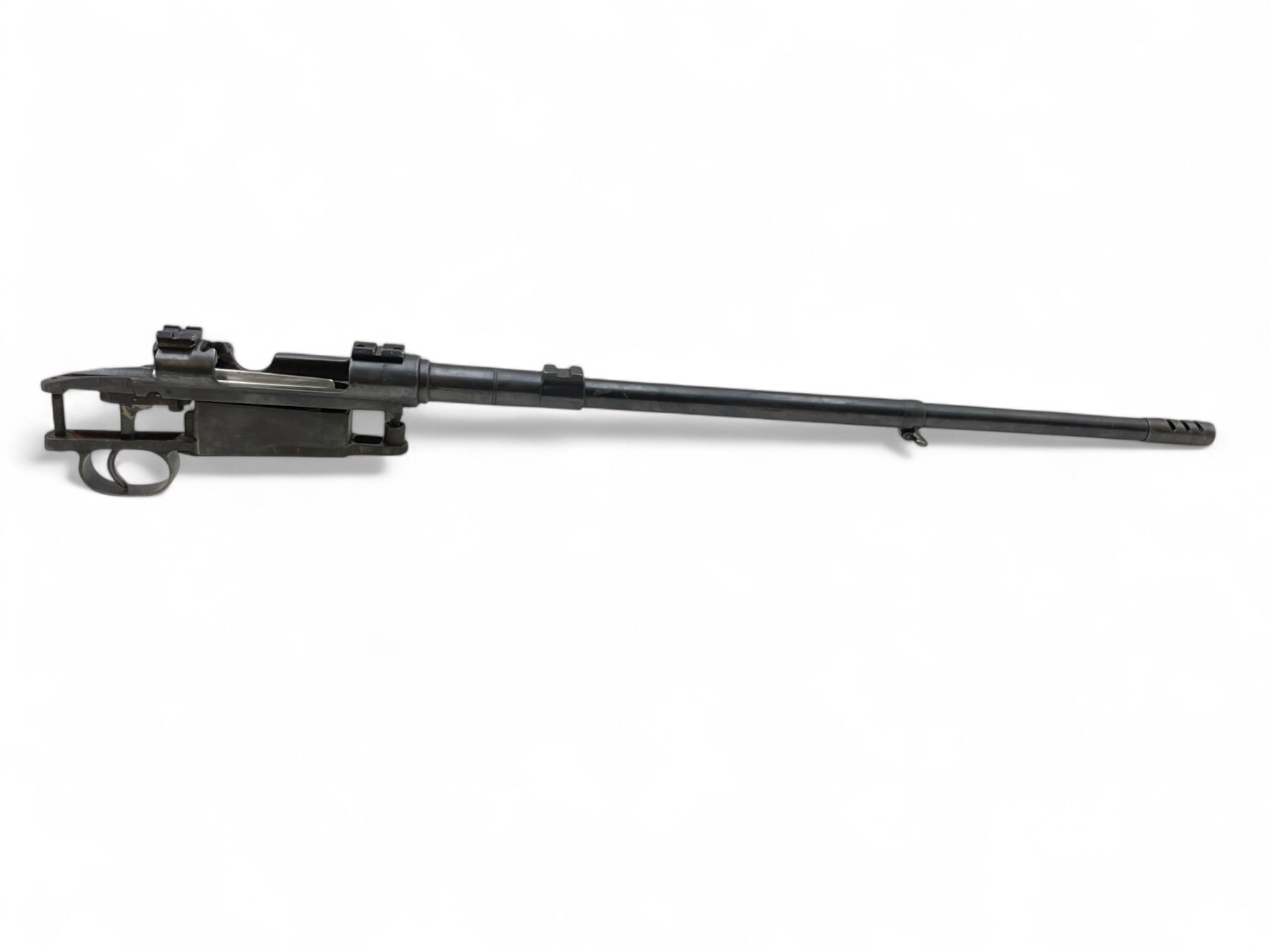 Husqvarna M96 Barreled Action 9.3X57 20" Barrel. Barrel has pinned on muzzle brake. No sights; receiver drilled and tapped with bases installed. Includes trigger components, internal magazine assembly and trigger guard with base plate. This is a non-restricted firearm.