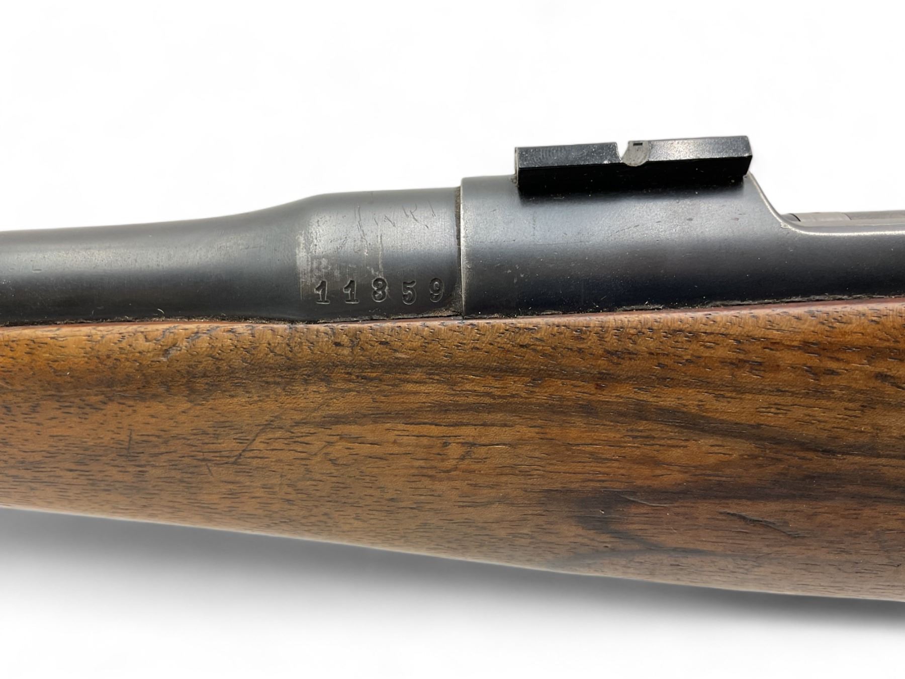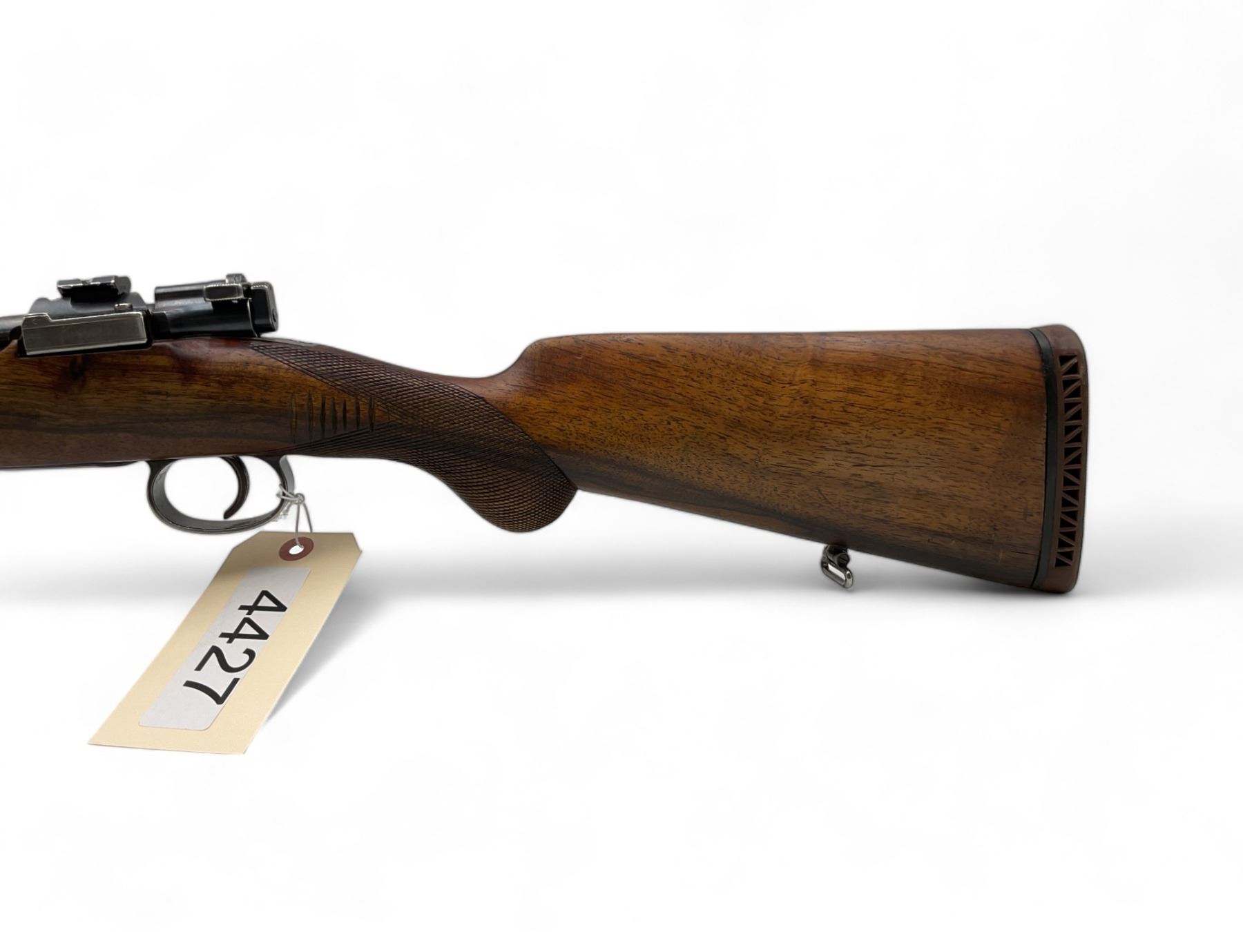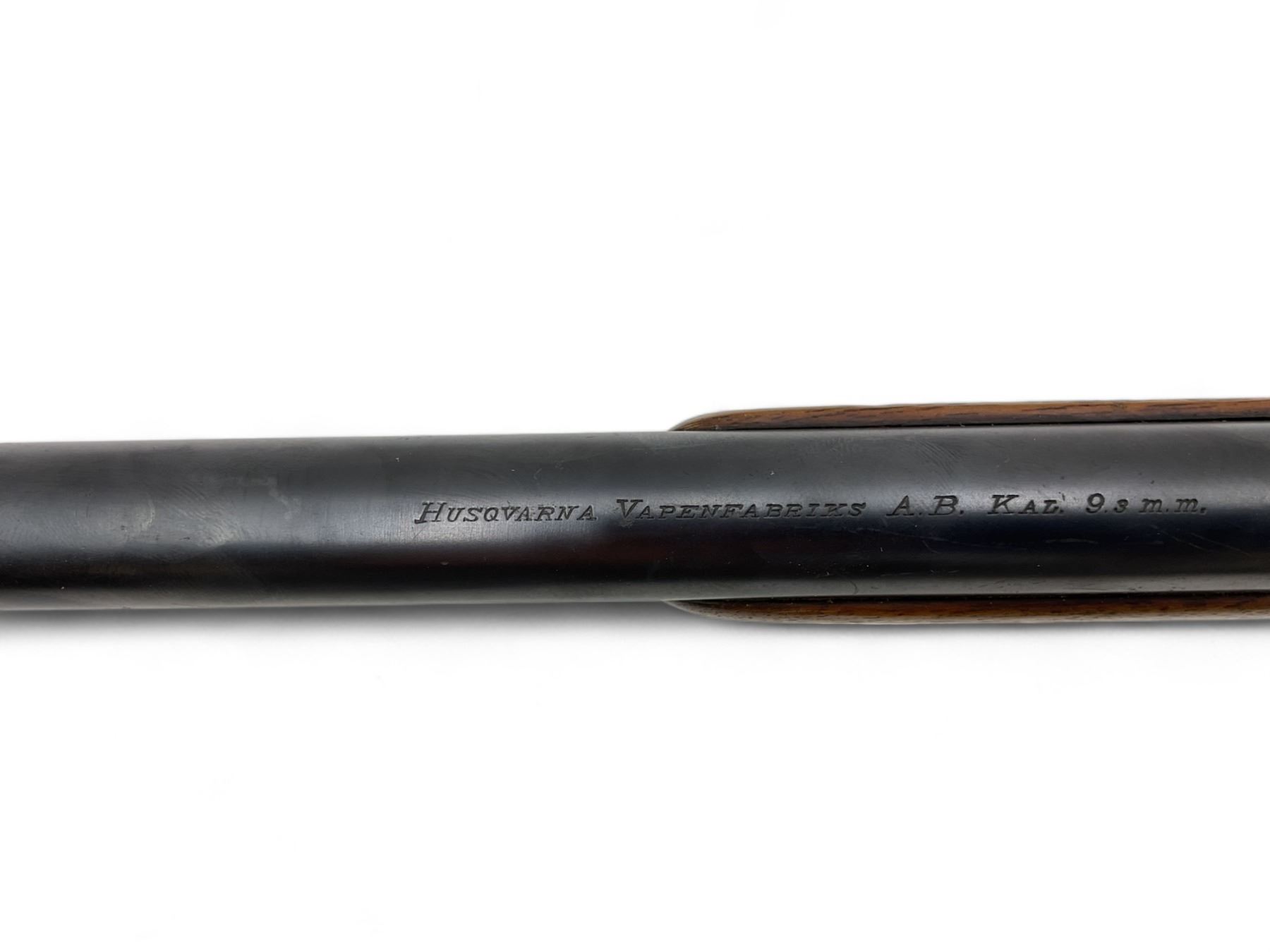 Husqvarna M96 Sporter Bolt Action Rifle 9.3X57 24" Barrel Wood Stock. Internal magazine, factory open sights. Receiver drilled and tapped with bases installed. Aftermarket rubber butt pad installed. This is a non-restricted firearm.