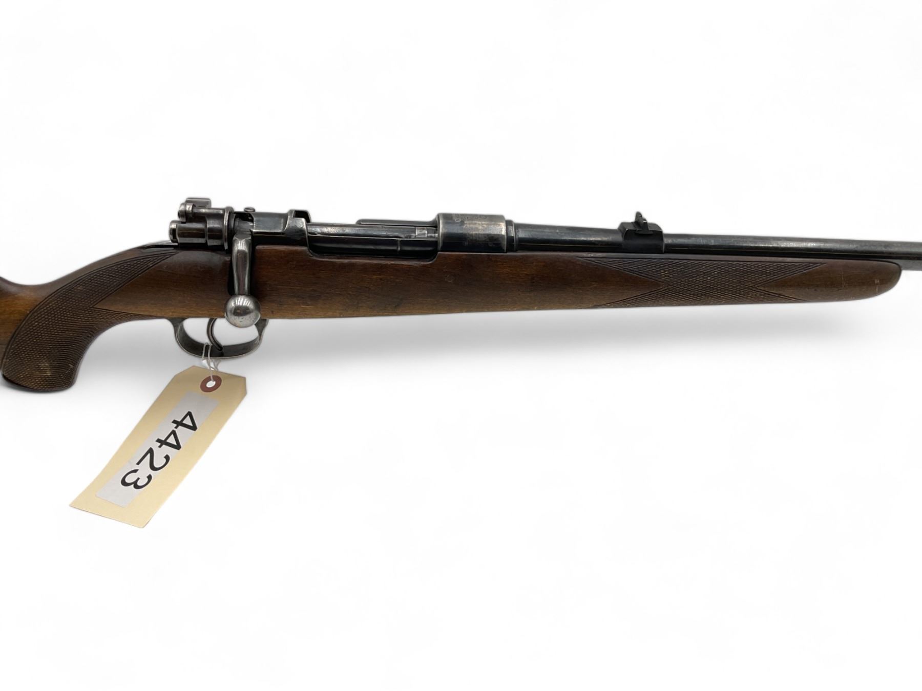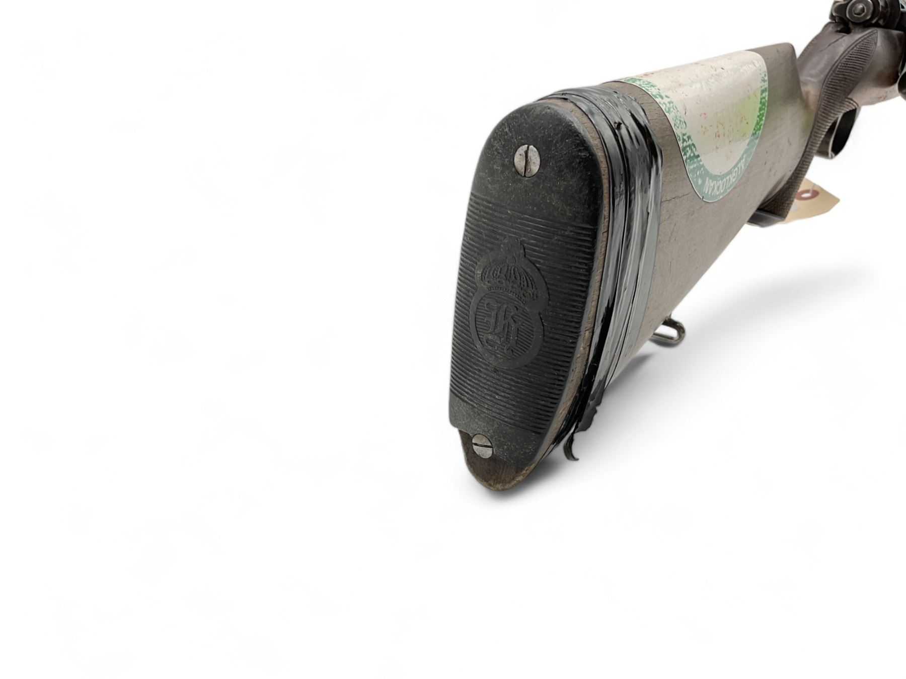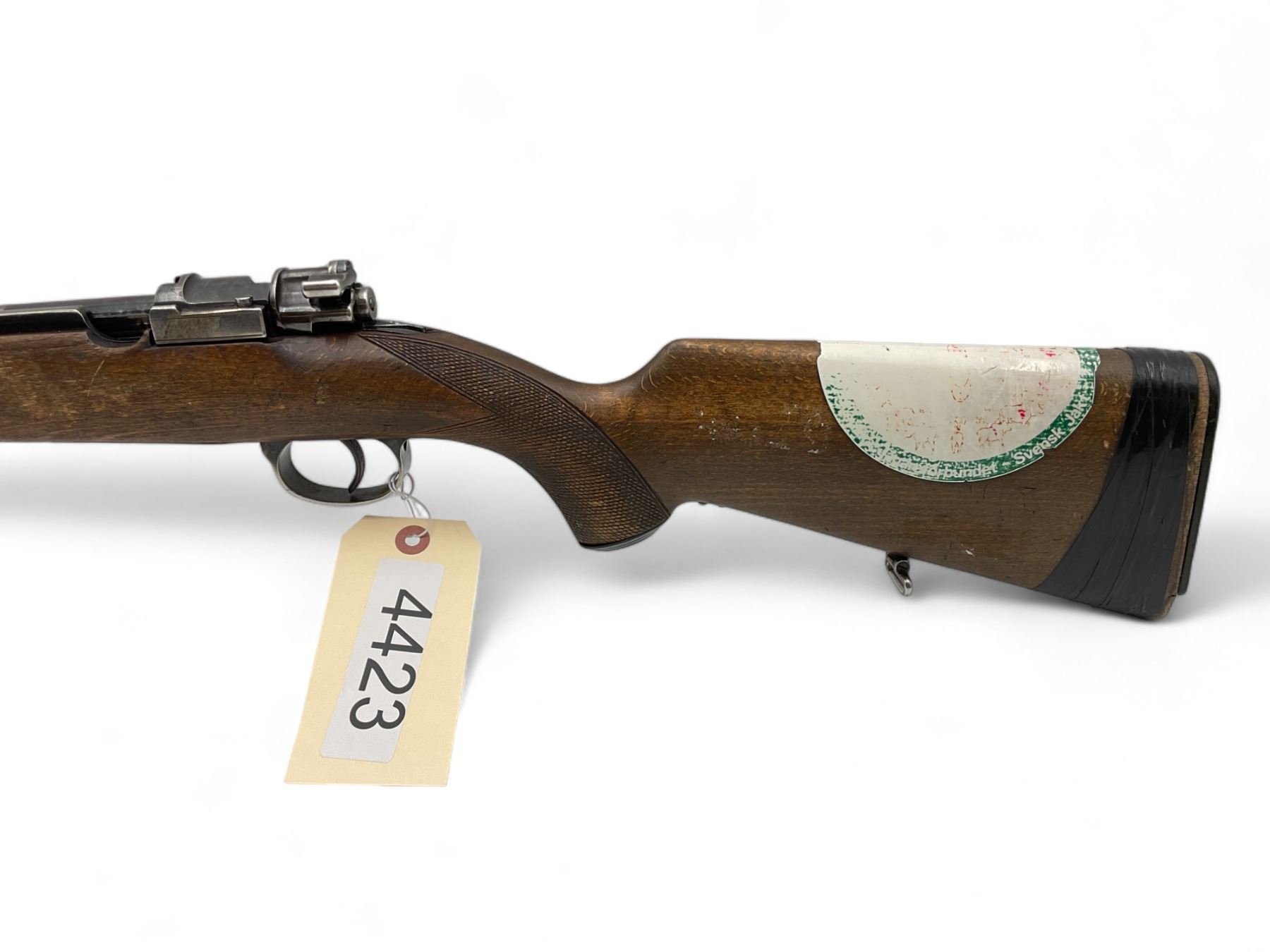 Husqvarna M98 Bolt Action Rifle 8MM Mauser 24" Barrel Wood Stock. Internal magazine with base plate; fixed open sights. Stock is cracked and several places and taped at rear. Plastic butt plate is cracked and broken. This is a non-restricted firearm.