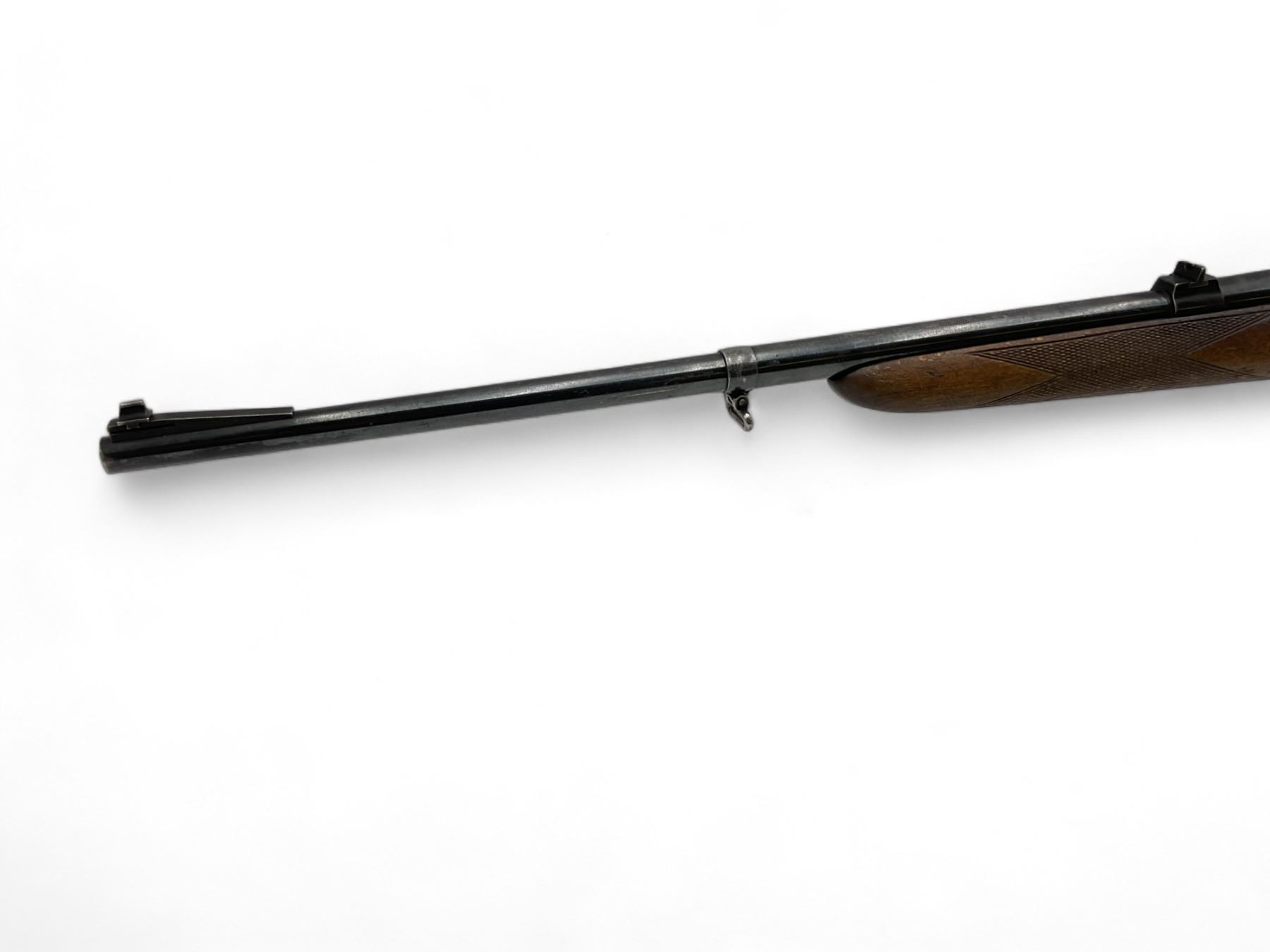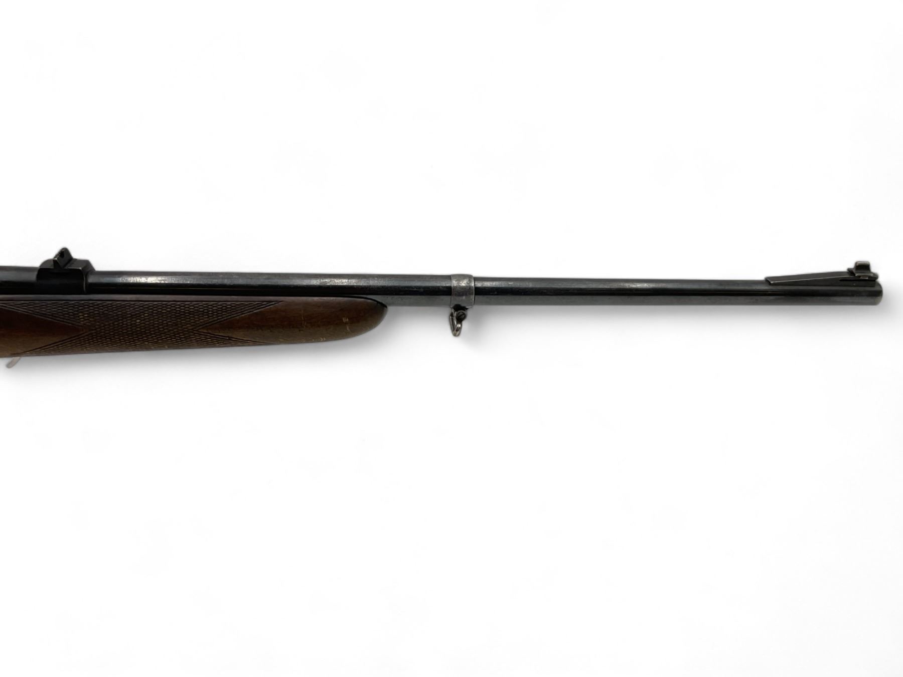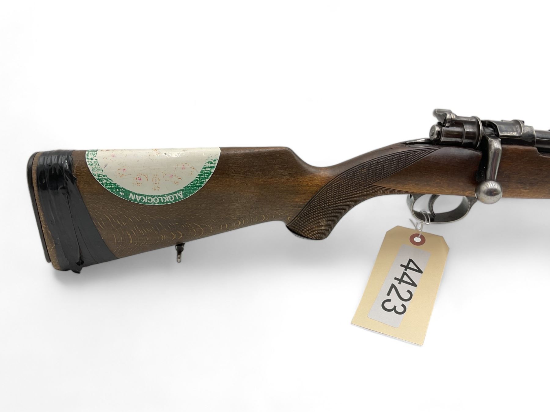 Husqvarna M98 Bolt Action Rifle 8MM Mauser 24" Barrel Wood Stock. Internal magazine with base plate; fixed open sights. Stock is cracked and several places and taped at rear. Plastic butt plate is cracked and broken. This is a non-restricted firearm.
