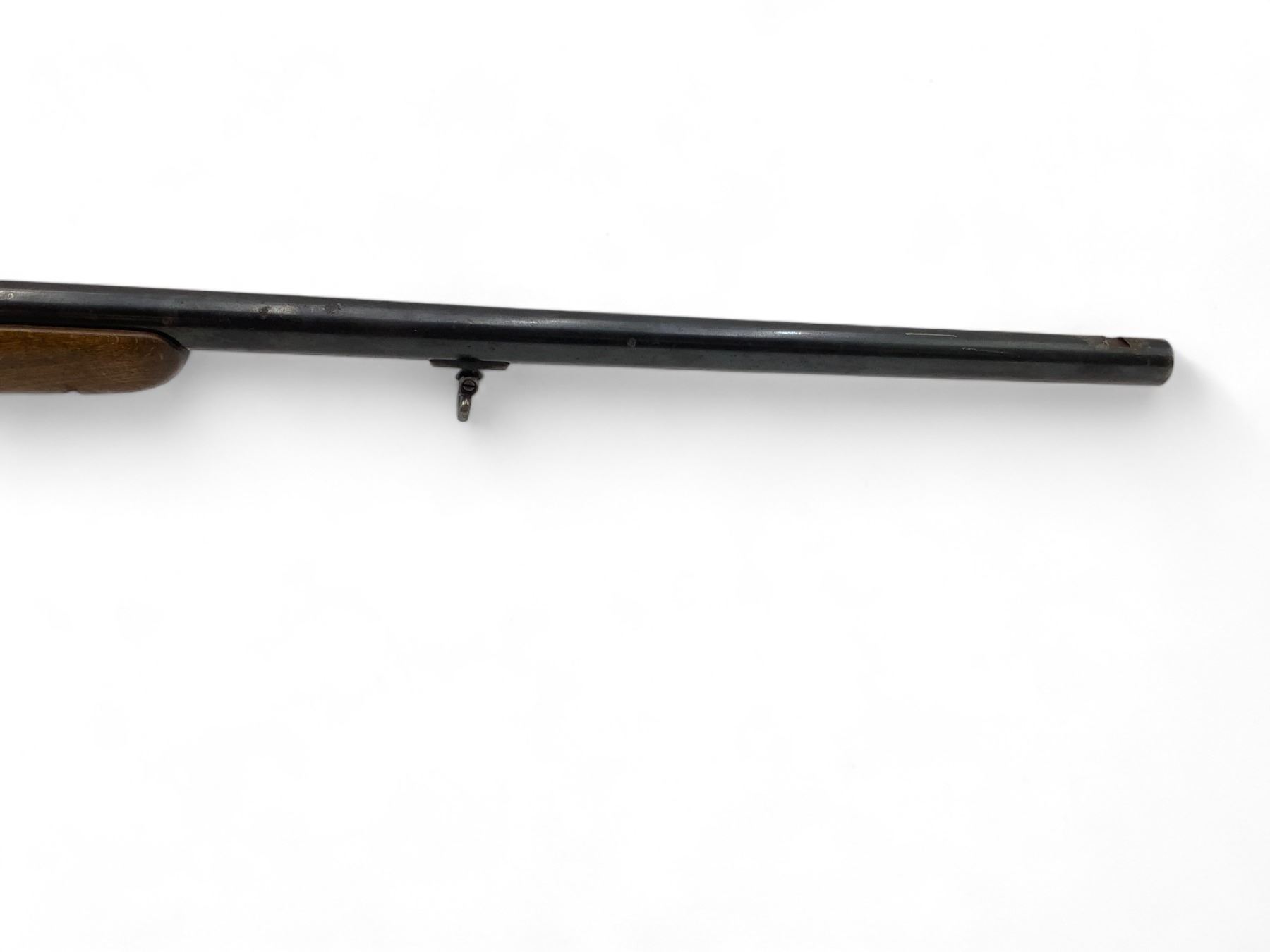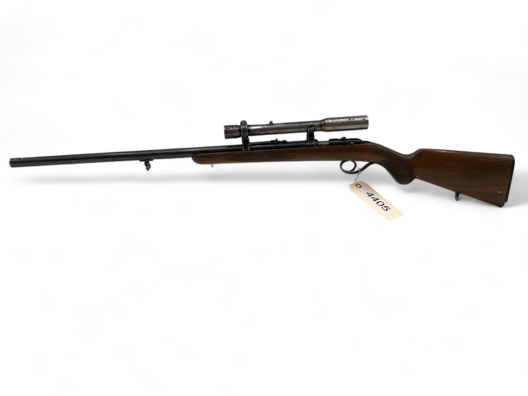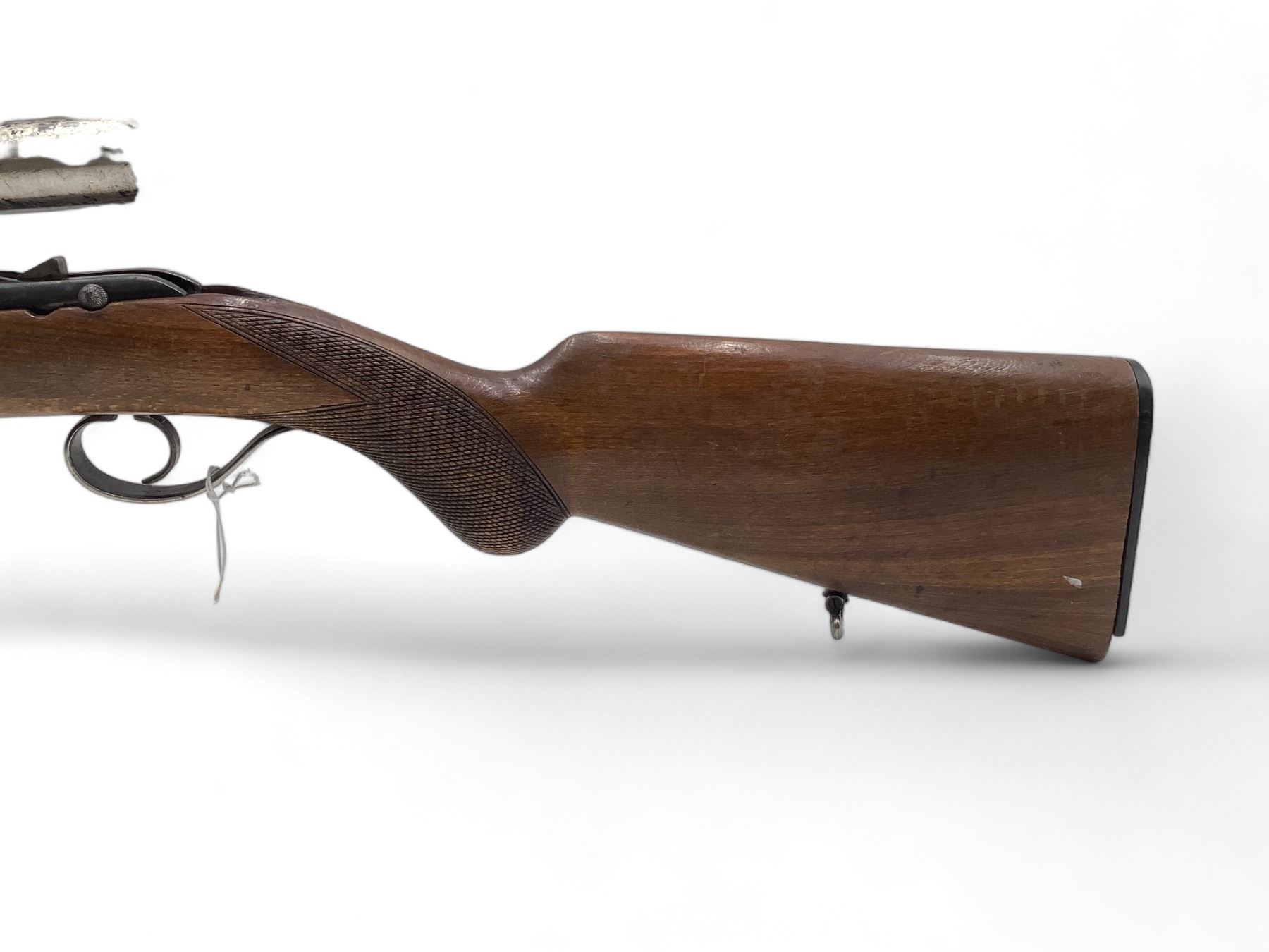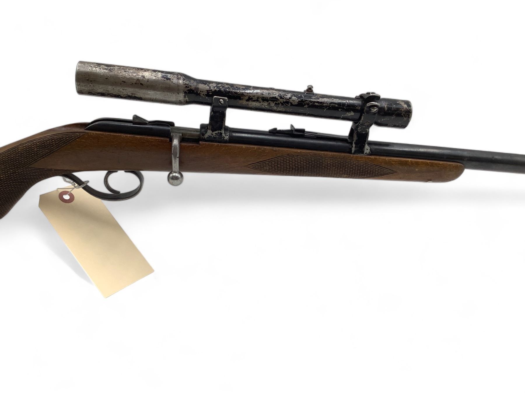 Husqvarna Single Shot Rifle 22LR 25" Barrel Wood Stock With Optic. Plastic buttplate cracked and missing a piece. Optic mounts appear to be soldered to barrel. Unknown optic brand and magnification. This is a non-restricted firearm.