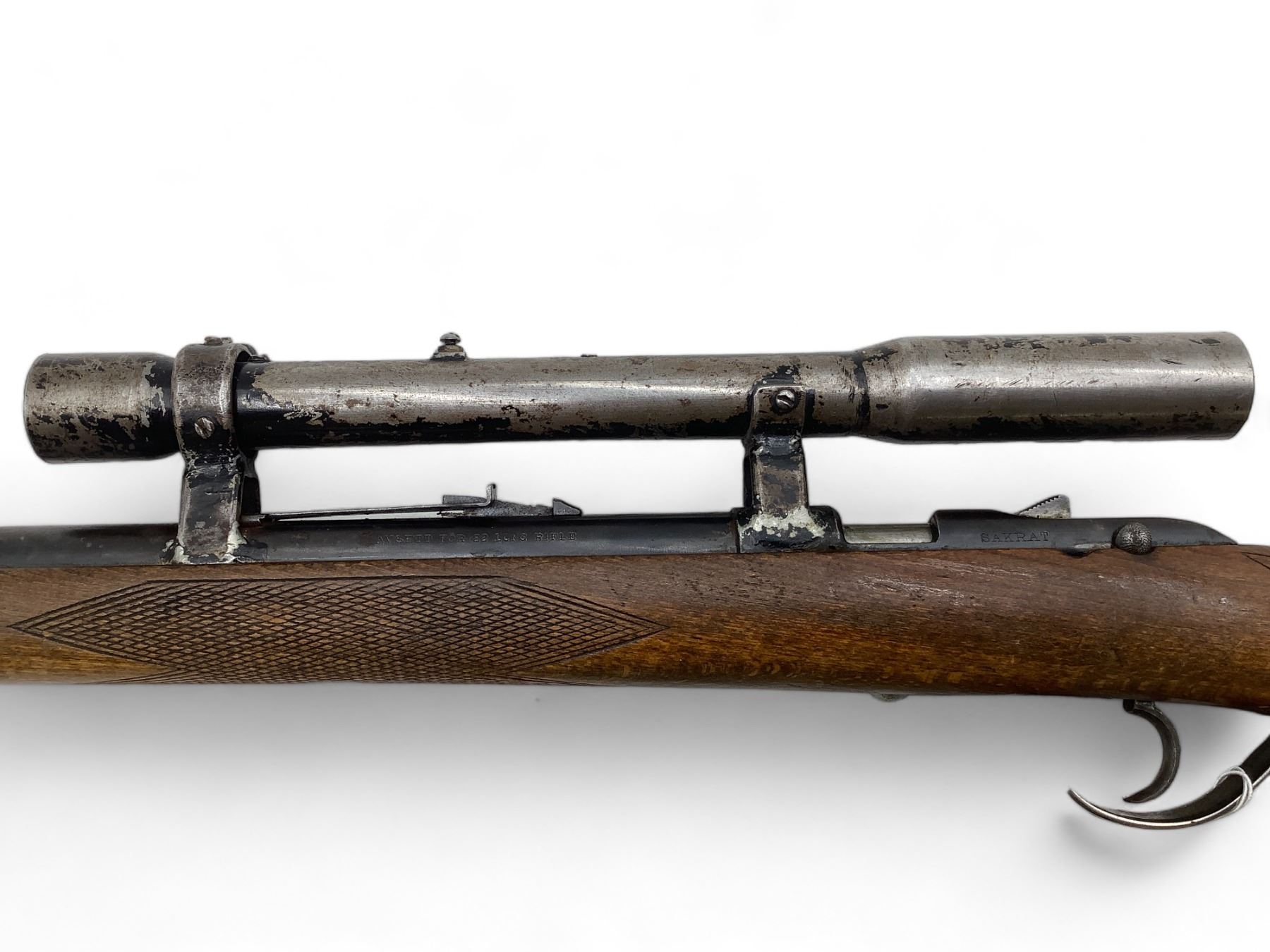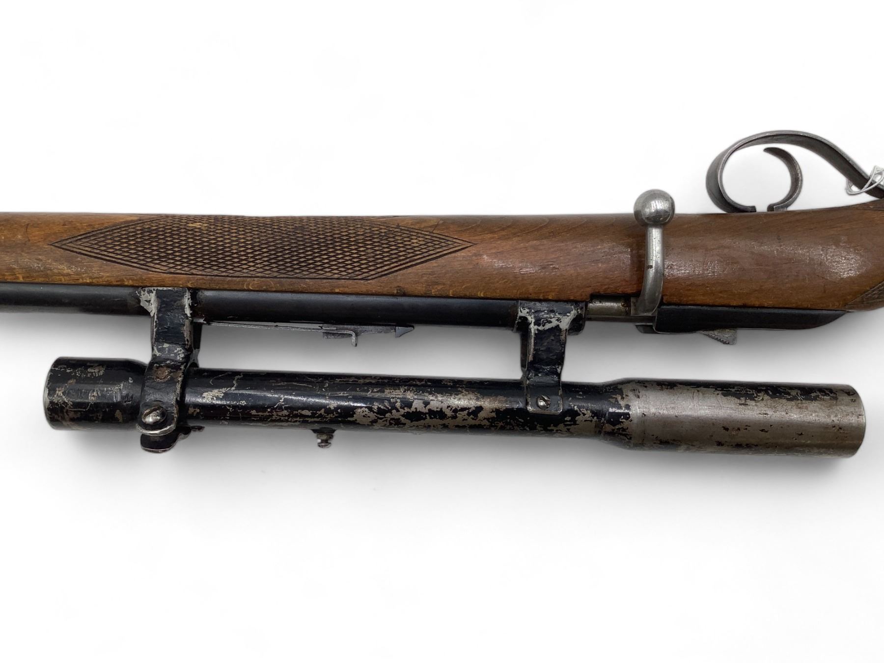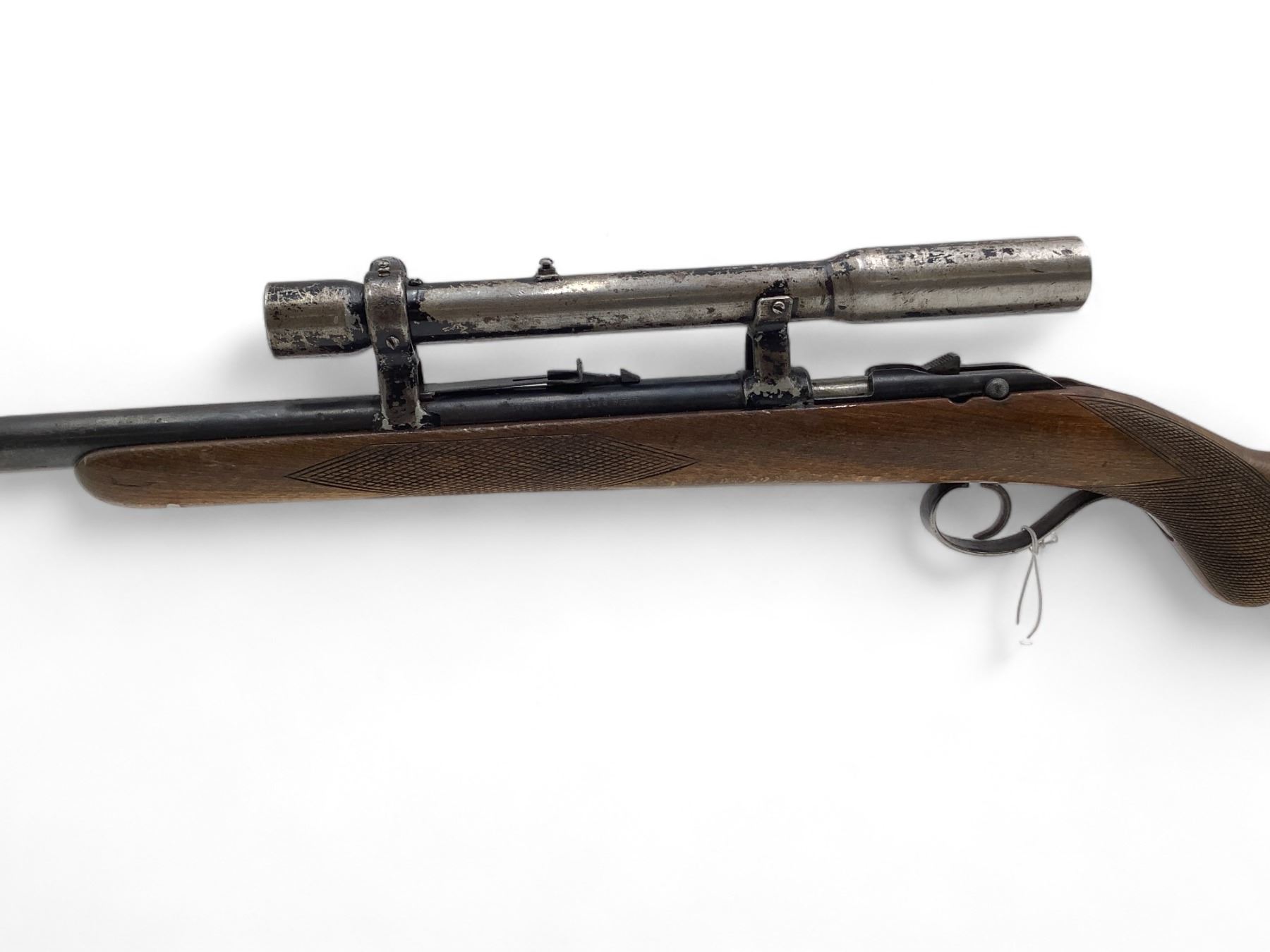Husqvarna Single Shot Rifle 22LR 25" Barrel Wood Stock With Optic. Plastic buttplate cracked and missing a piece. Optic mounts appear to be soldered to barrel. Unknown optic brand and magnification. This is a non-restricted firearm.
