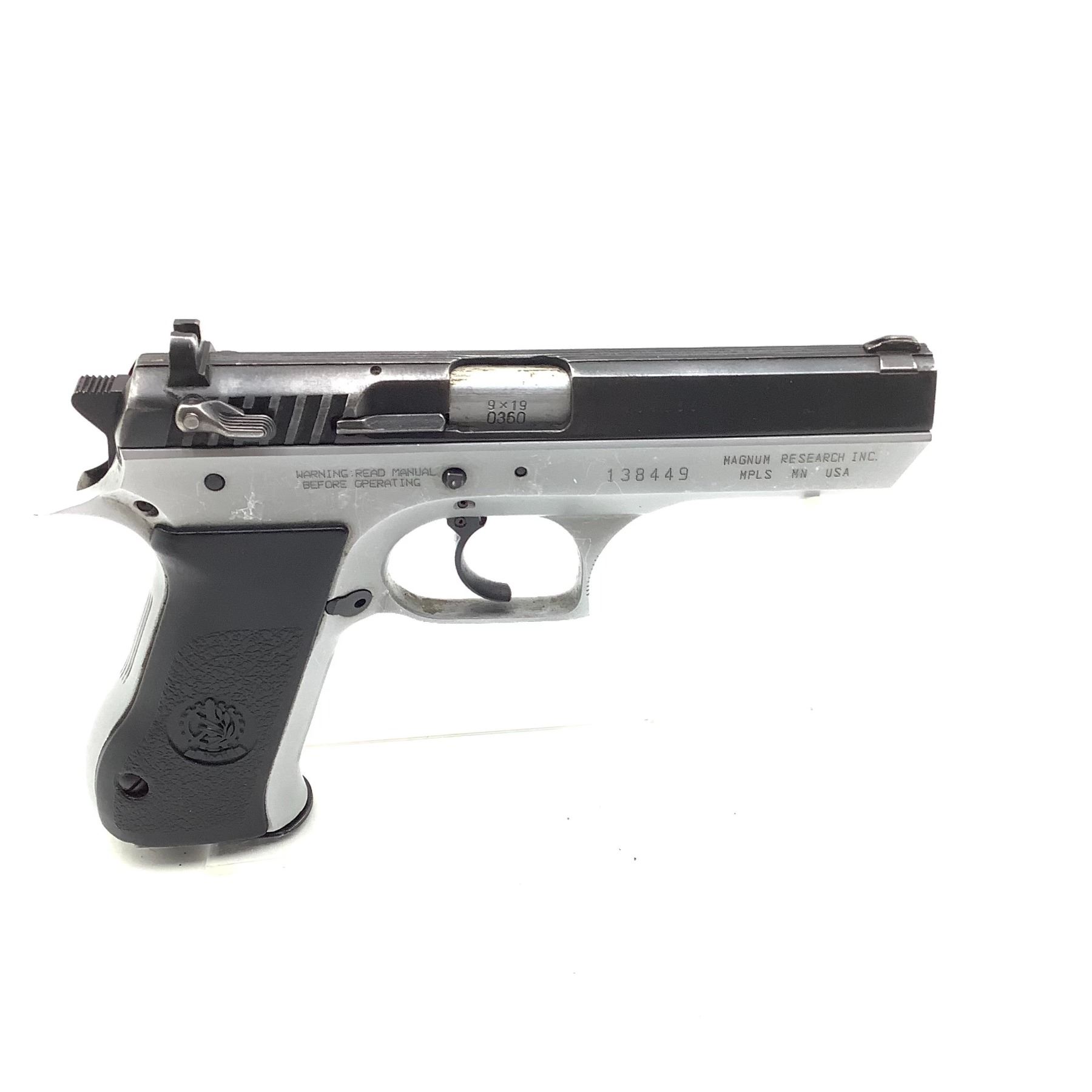 A IMI Desert Eagle Semi Auto Pistol 9mm 4.25" Barrel Two Tone, Restricted. Includes one magazine. This is a restricted firearm.
