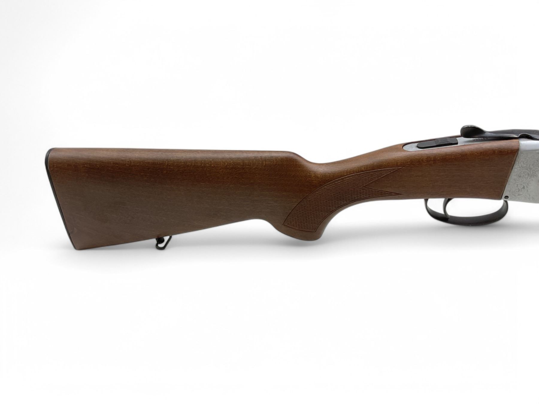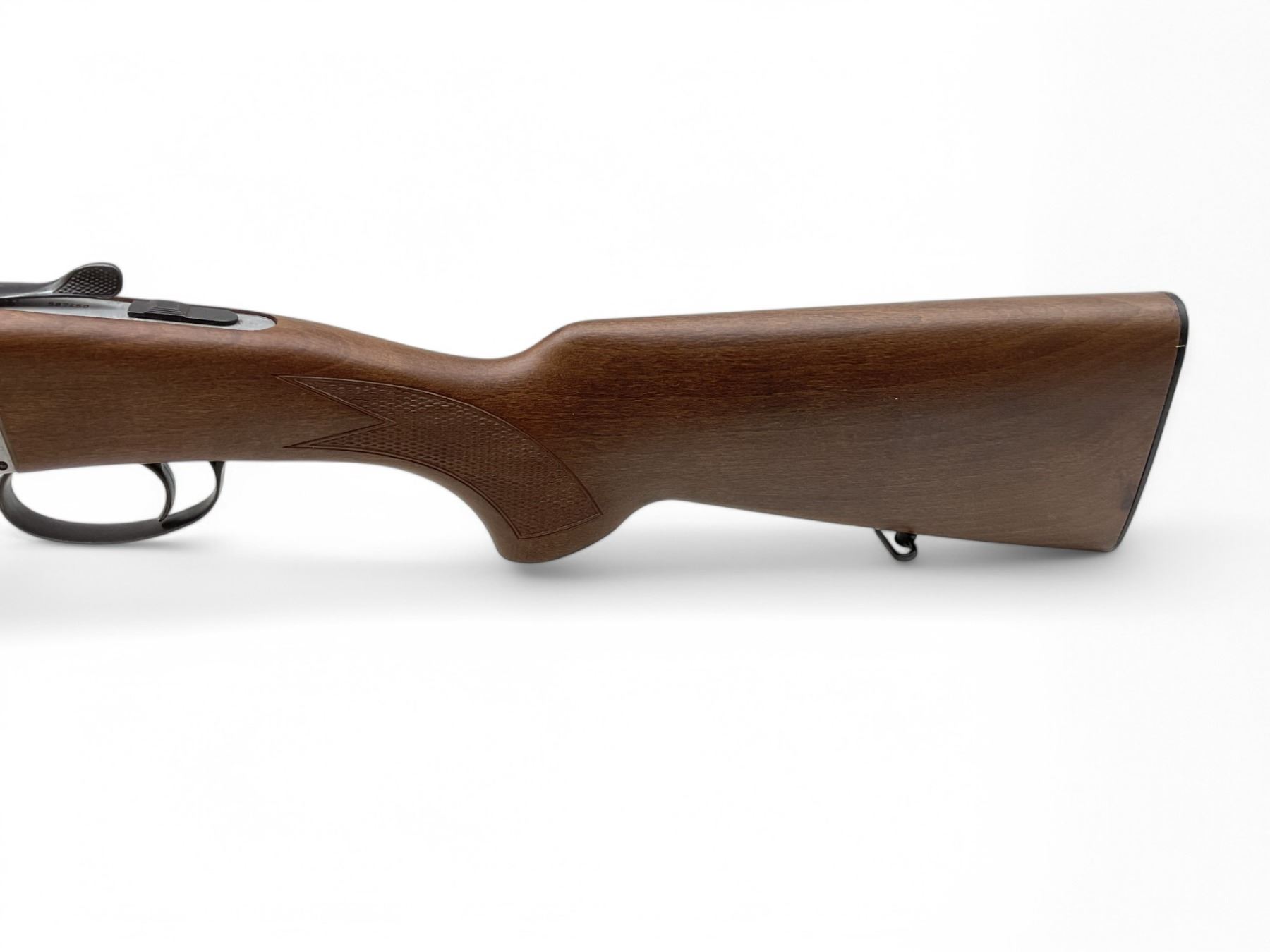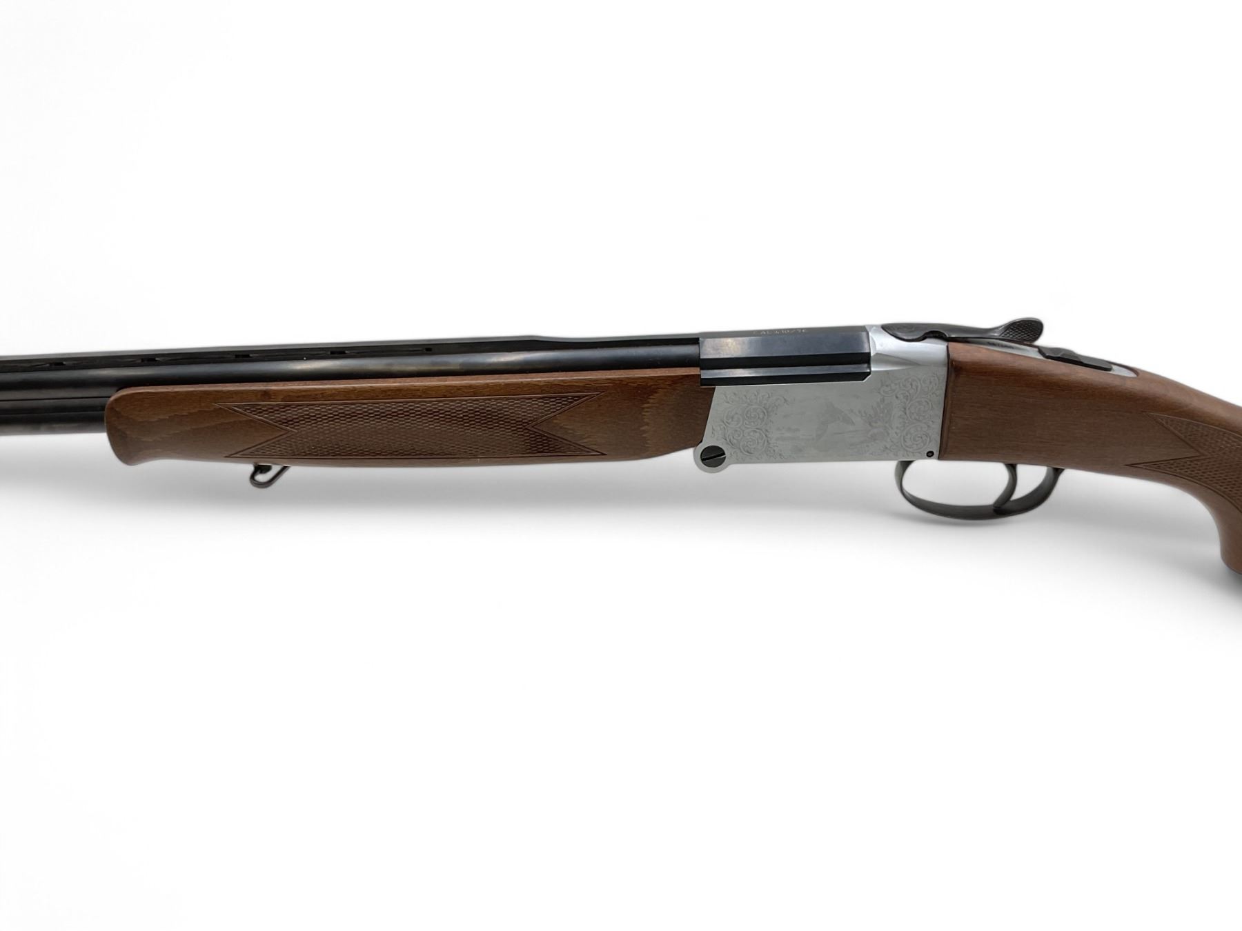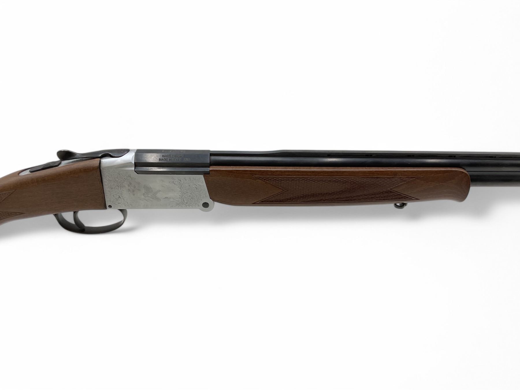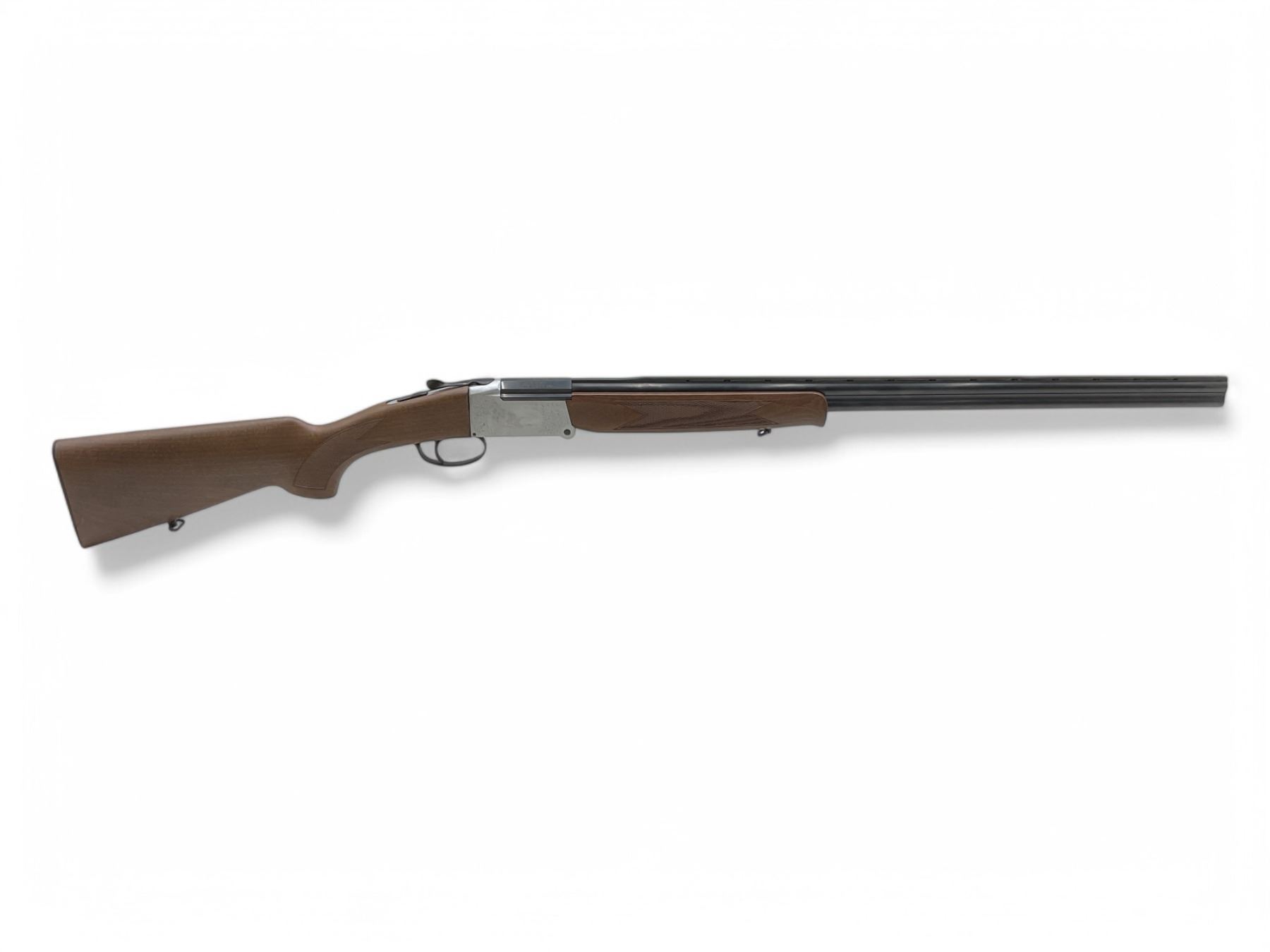 Investarm Over Under Folding 410 Shotgun 3" Chambers 28" Barrels Wood Stock. Vent rib; missing bead sight. Fixed chokes, single trigger. Gun is very stiff to open. This is a non-restricted firearm.