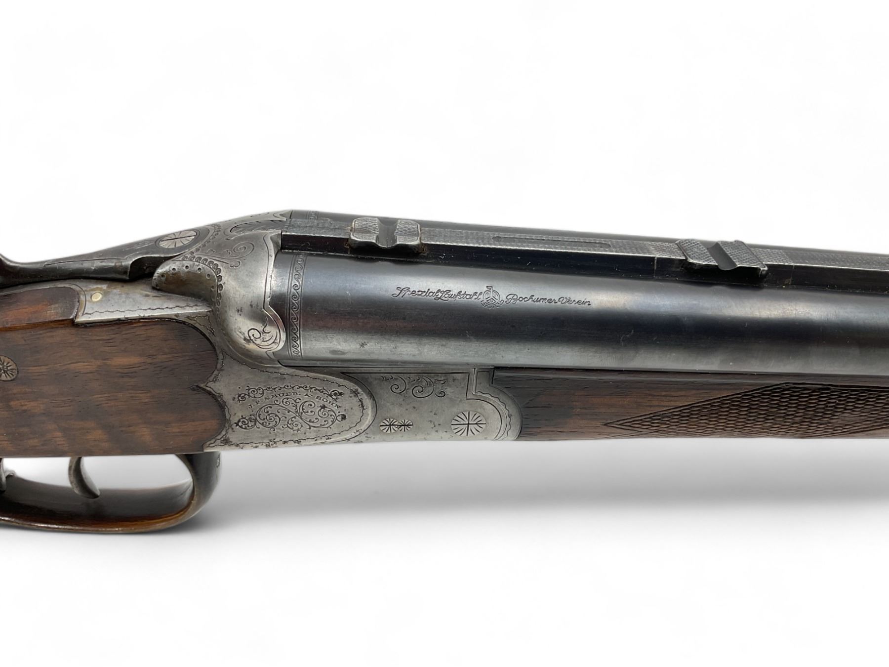 JP Sauer And Son Drilling Combination Gun 16Ga and 8X57JRS 24" Barrel Wood Stock. Front sight present, no rear sight. 16Ga barrels have fixed chokes. This is a non-restricted firearm.