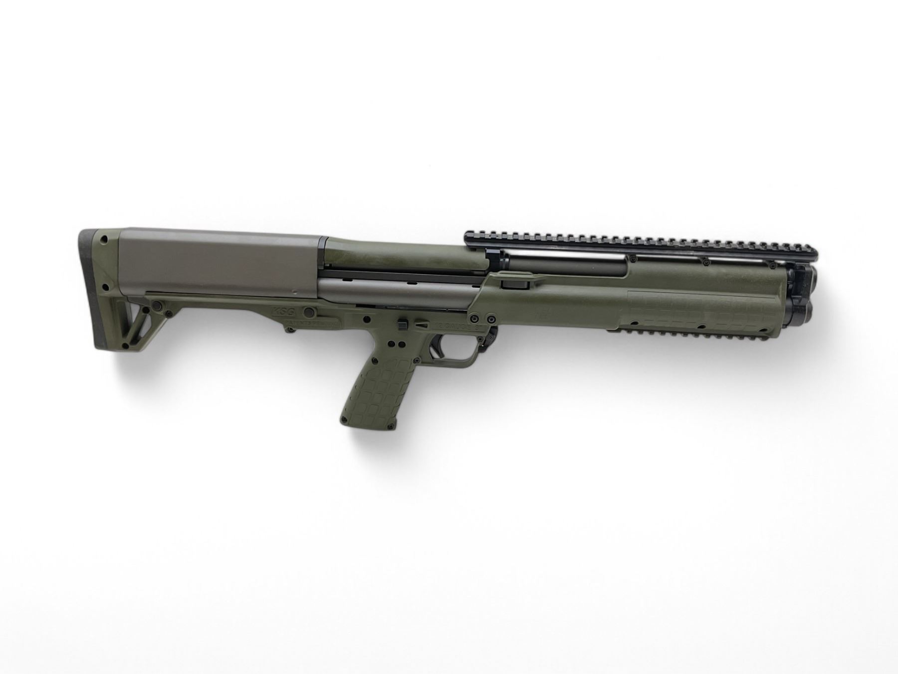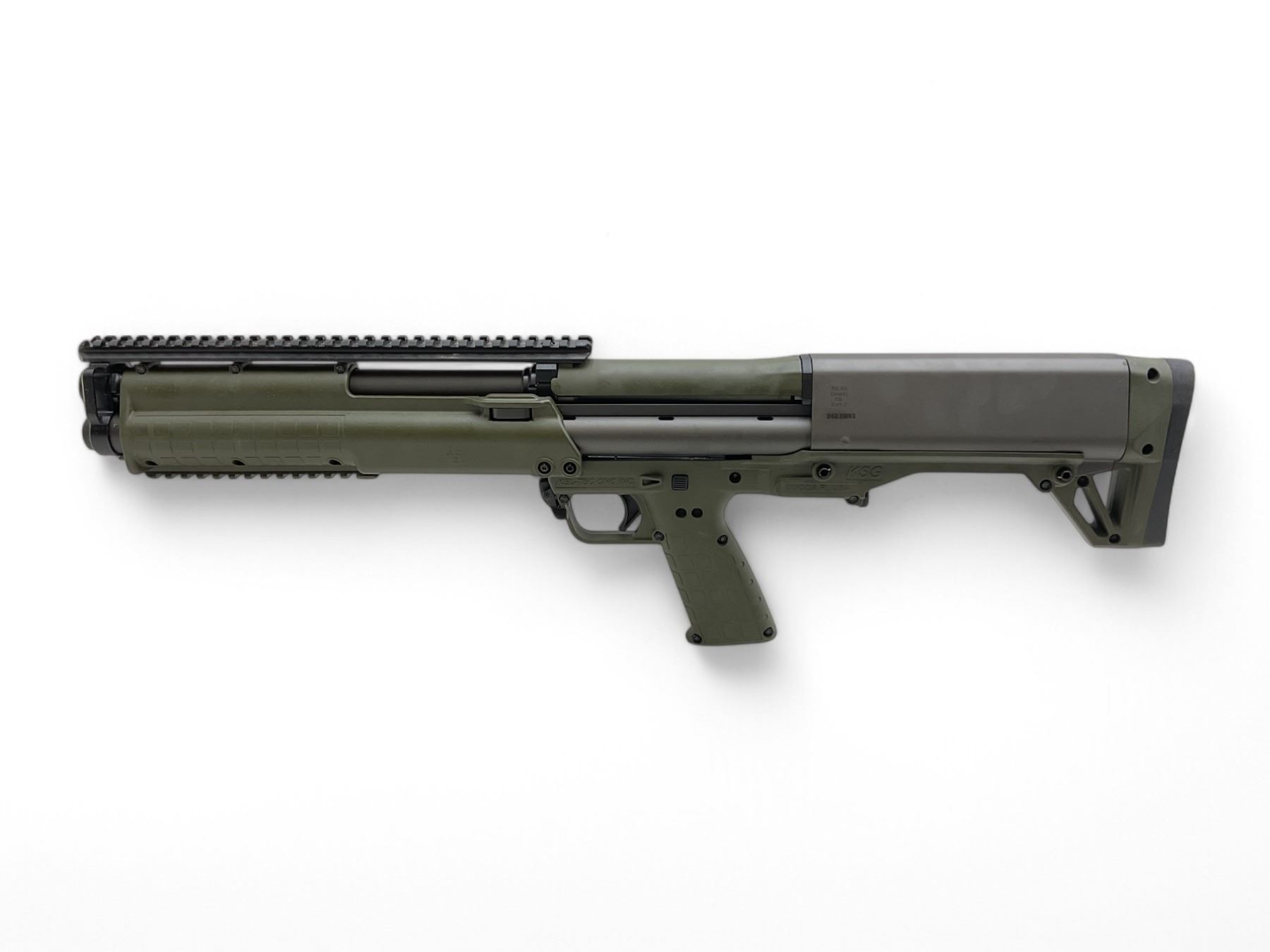Kel-Tec KSG Tactical Pump Action 12Ga Shotgun 18.5" Barrel Green, New. Fixed choke, comes with top side pic rail. This is a non-restricted firearm.