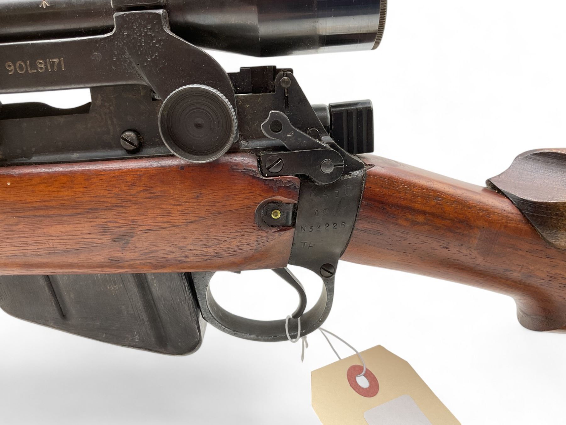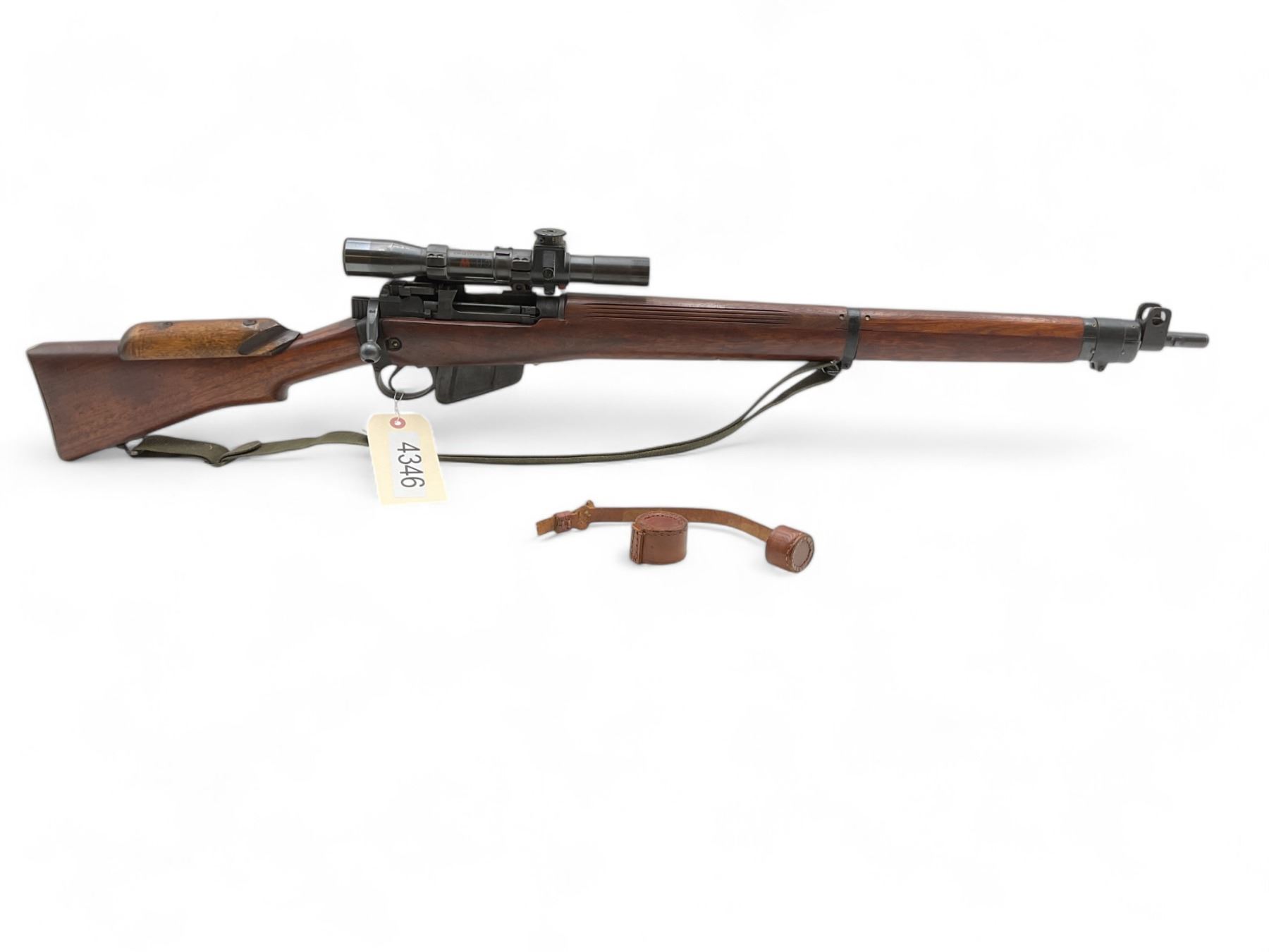 A British Lee-Enfield No. 4 Mk. 1 TR marked bolt-action sniper rifle manufactured by Birmingham Small Arms (BSA). 25" barrel with bright bore chambered in .303 British. Fitted with a Canadian REL (Research Enterprises Limited) No. 32 Mk.3 scope. Bolt and firearm serial numbers are matching. The scope is nice and clear. Magazine is not serialized (which was primarily a wartime Canadian Army armourers' make-work project). TR stamped on the butt socket. The leather strap for the lense covers is broken. Includes a Canadian Pattern 1951 rifle sling.