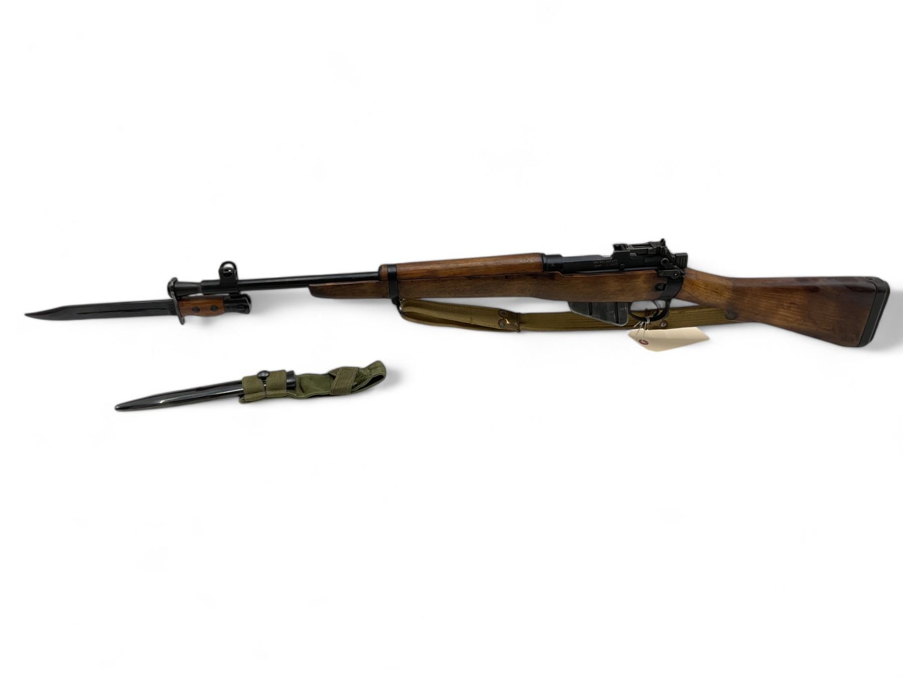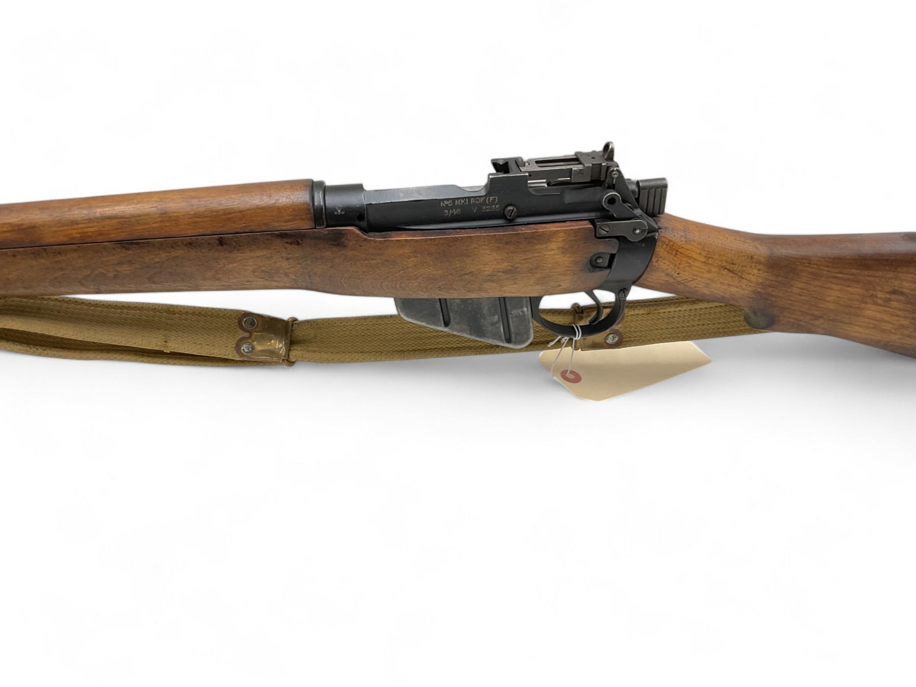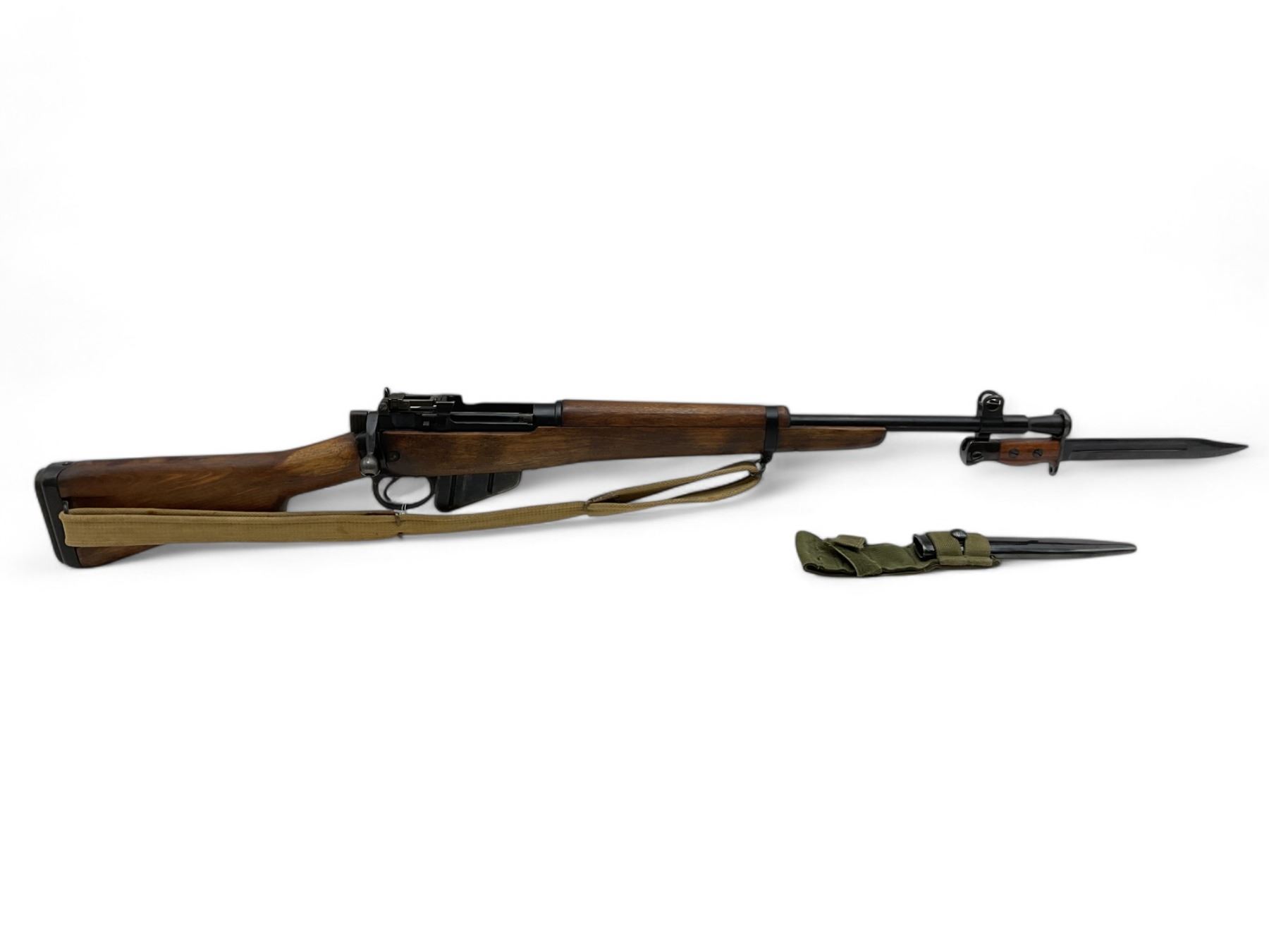 A 1946 Royal Ordnance Factory Fazakerley (Liverpool) Lee-Enfield No. 5 Mk. I Jungle Carbine bolt-action service carbine. 18.75" barrel with strong rifling, chambered in 303 British. Wood stock, includes bayonet and scabbard and original sling. Includes one detachable magazine.
