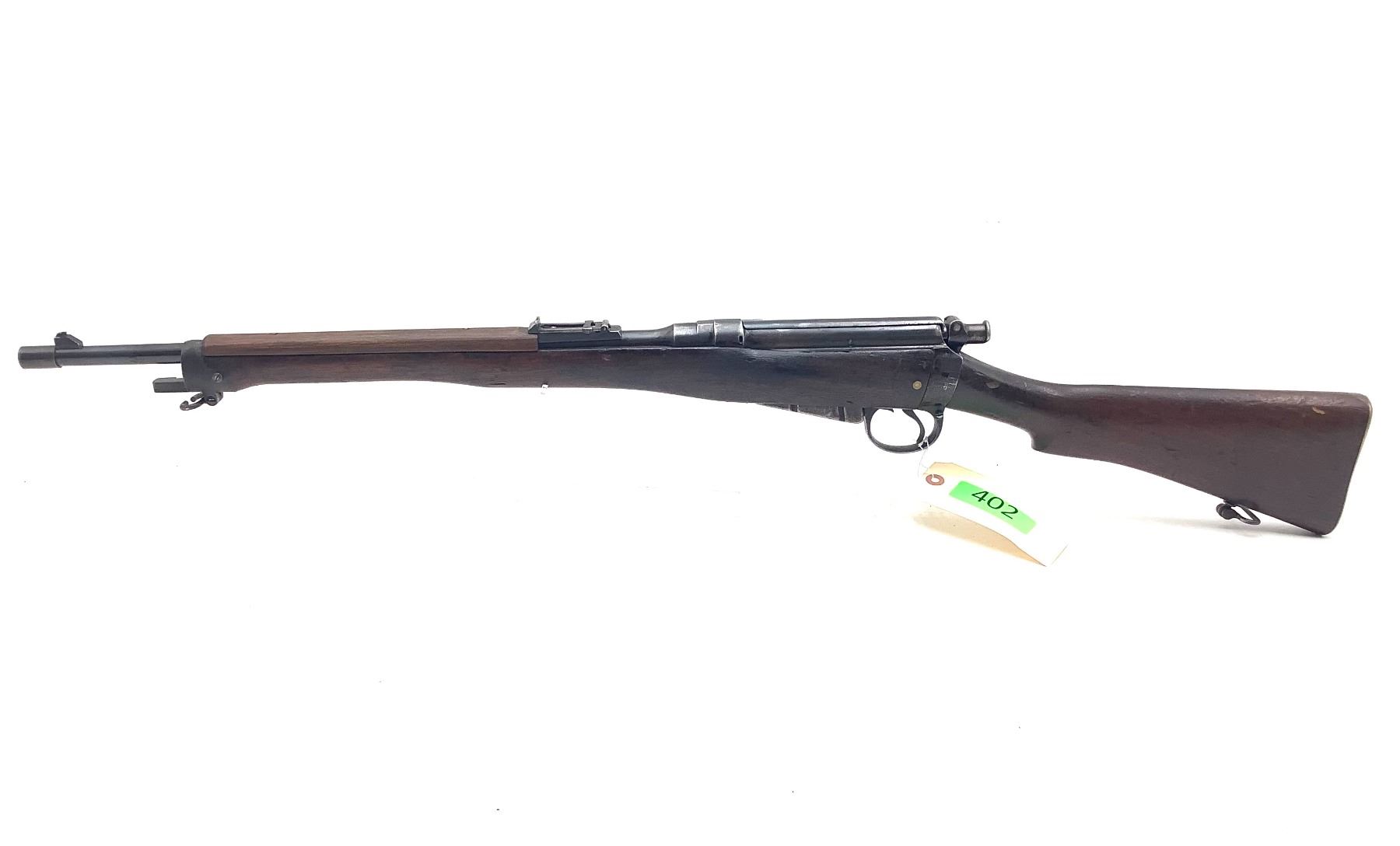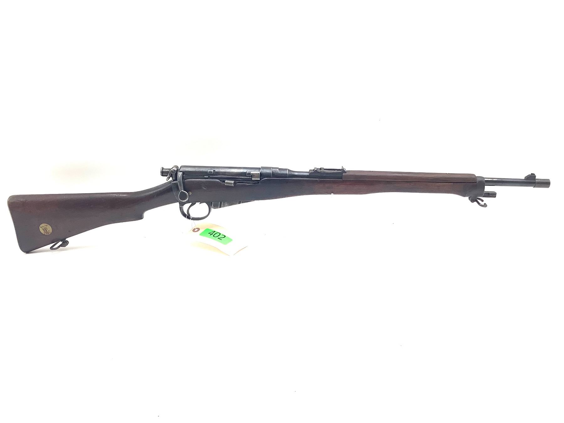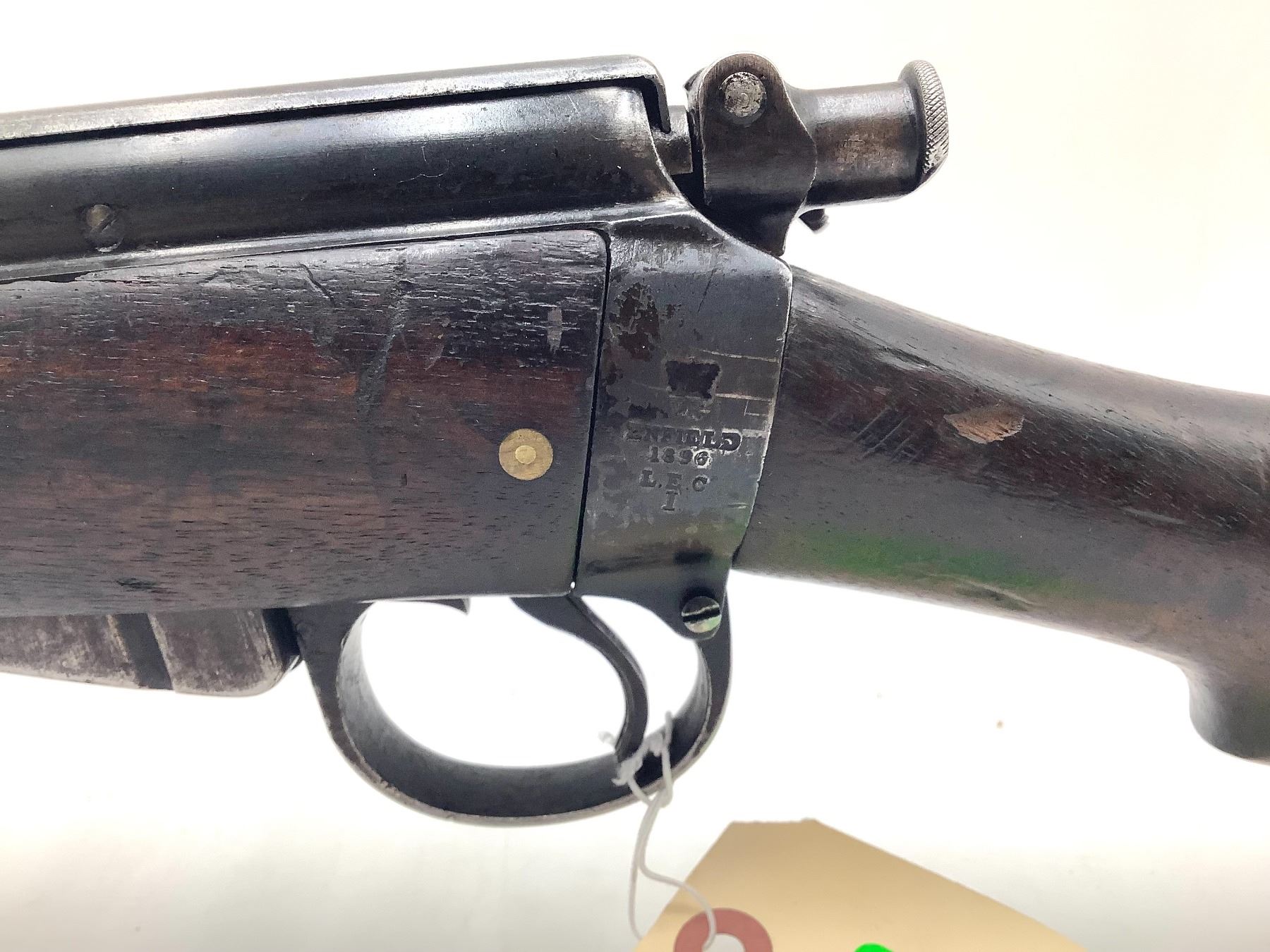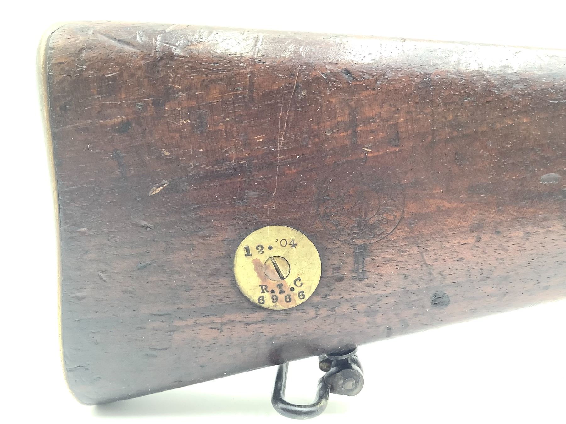 A Lee-Enfield Royal Irish Constabulary carbine. 21" barrel with a frosted bore chambered for .303 British. Wood Stock. Factory open sights, detachable 6-round magazine. Matching serial numbers on bolt, barrel and receiver. The stock disk shows that this carbine was taken into RIC service in December of 1904 and had an RIC control number 6966.