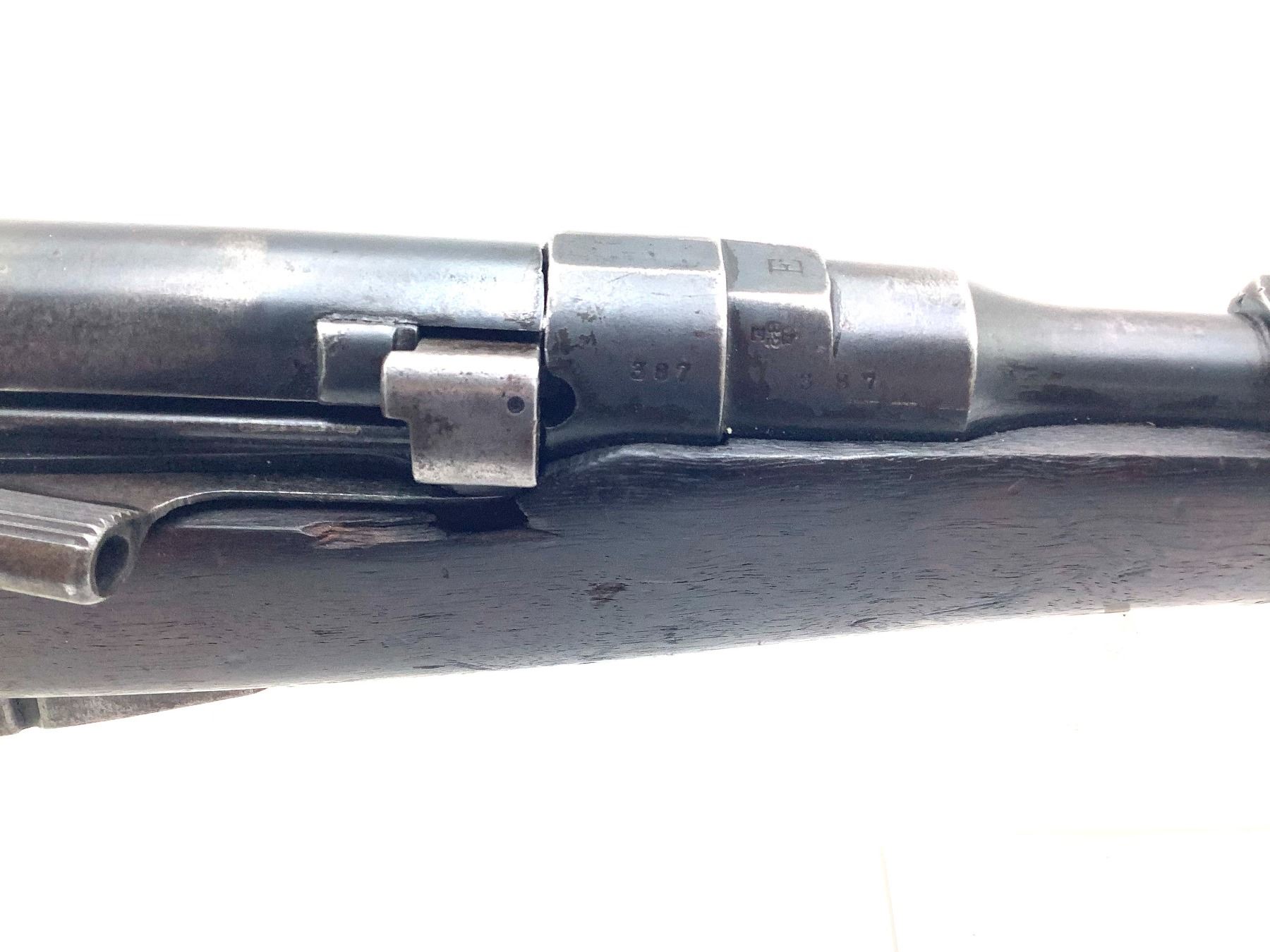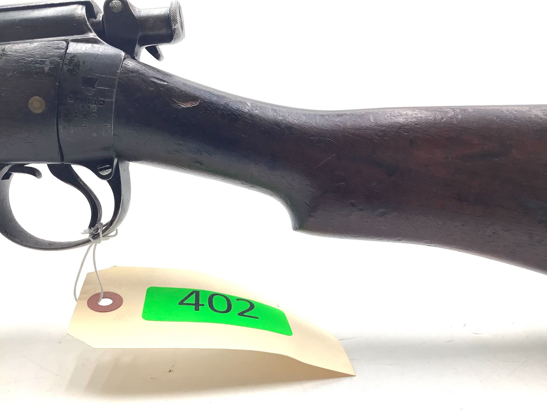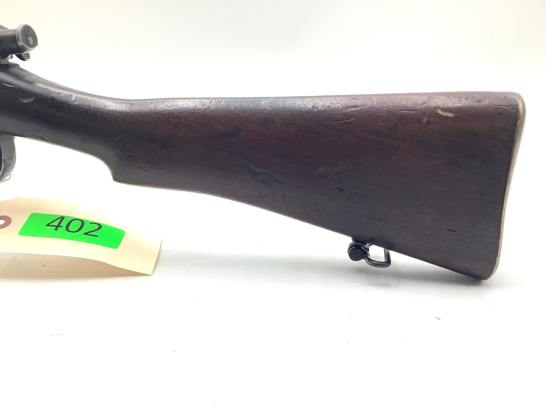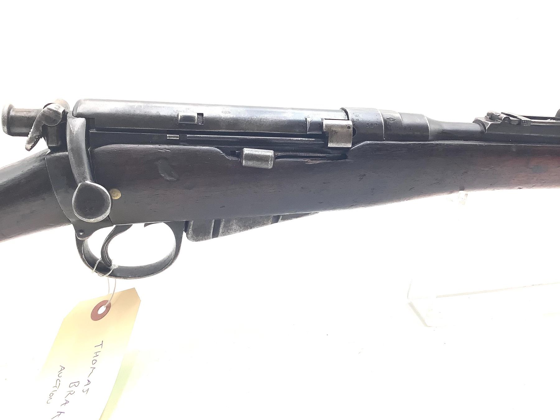 A Lee-Enfield Royal Irish Constabulary carbine. 21" barrel with a frosted bore chambered for .303 British. Wood Stock. Factory open sights, detachable 6-round magazine. Matching serial numbers on bolt, barrel and receiver. The stock disk shows that this carbine was taken into RIC service in December of 1904 and had an RIC control number 6966.
