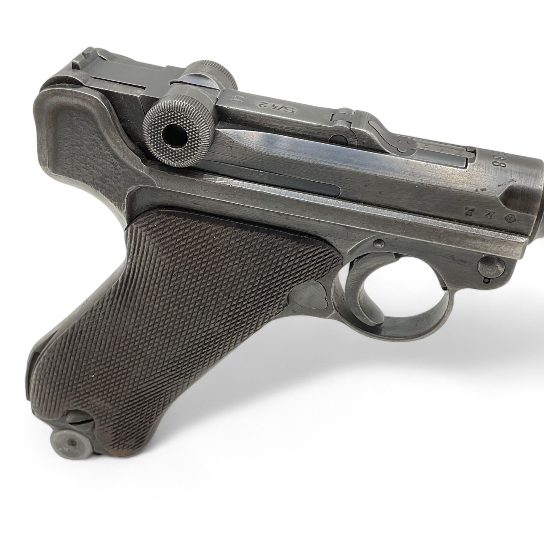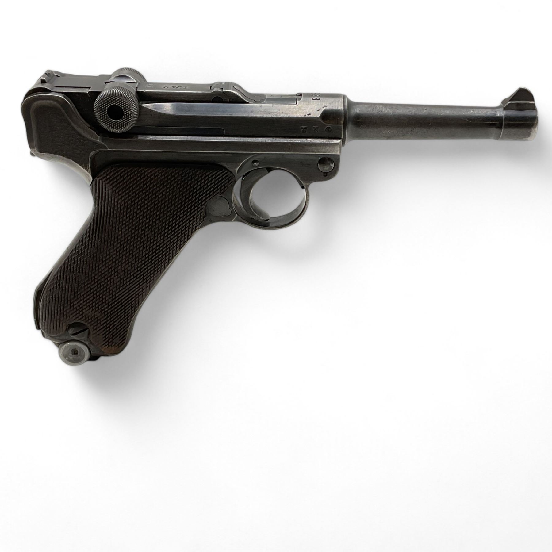 Luger Semi Auto Pistol 9MM 4" Barrel, Prohibited. Fixed sights, German marks present.