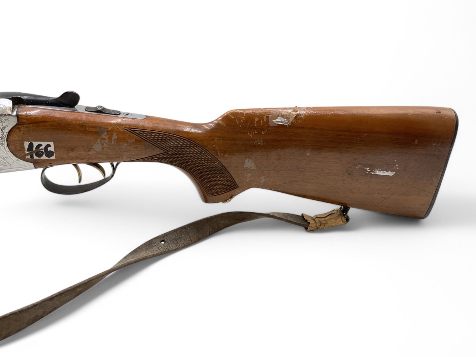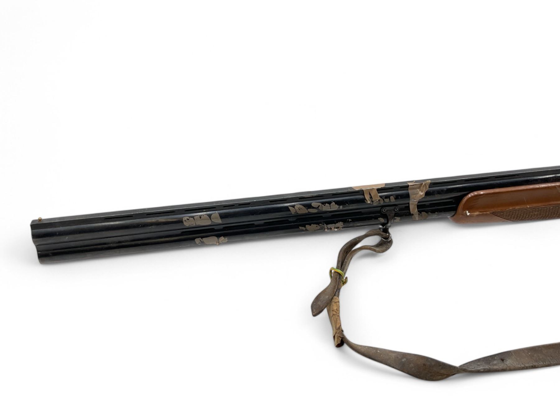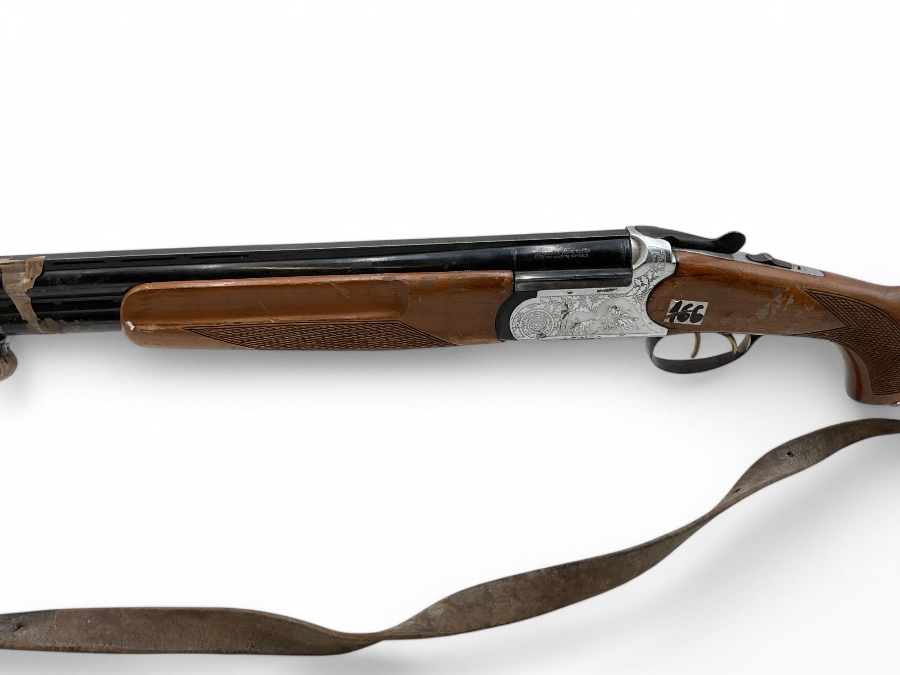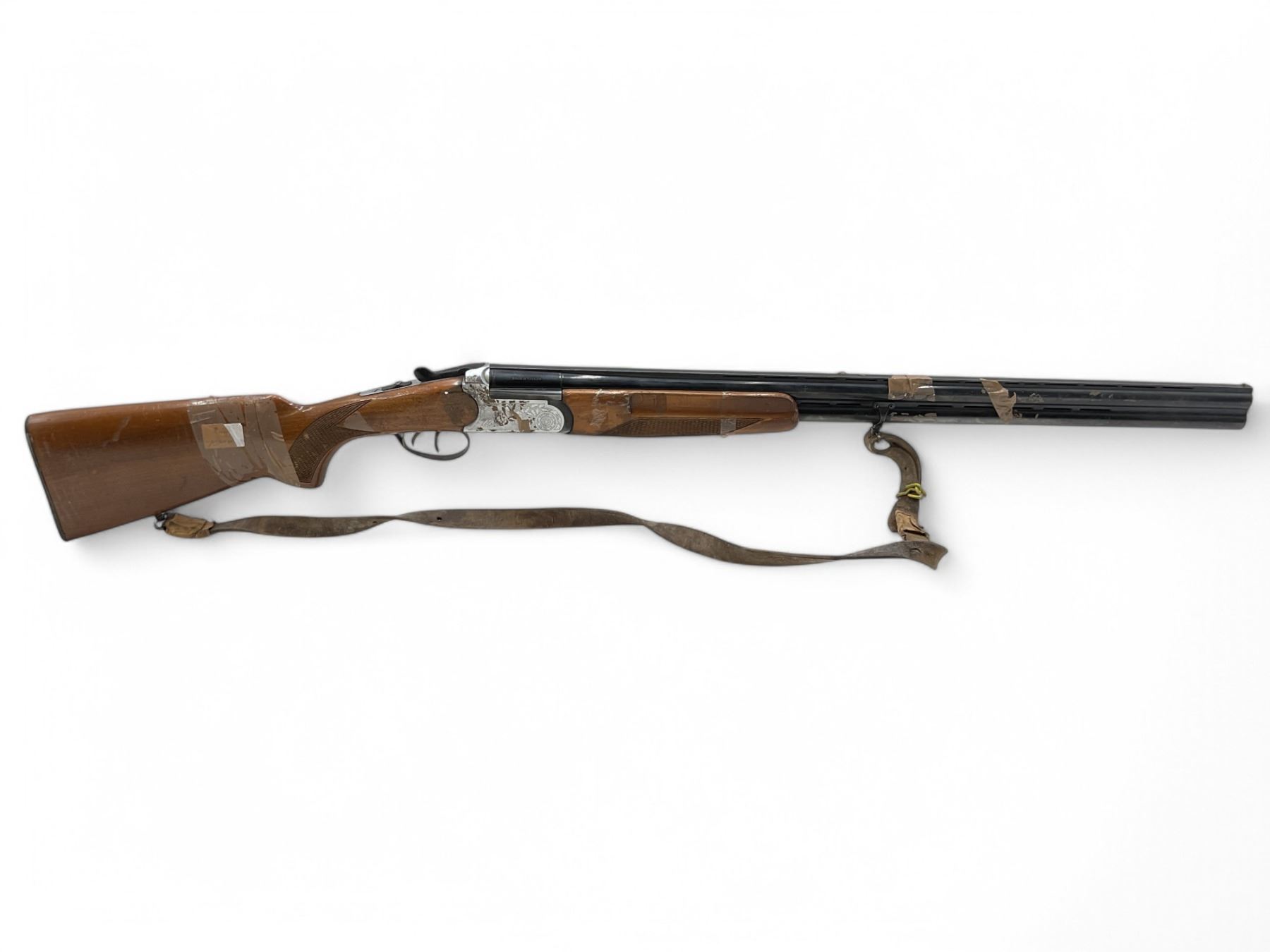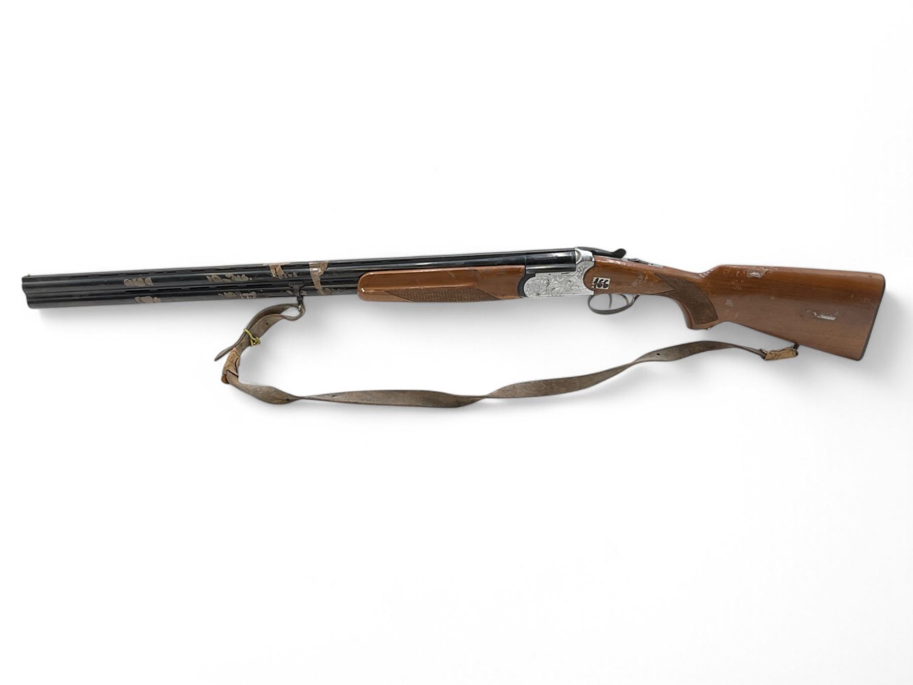Makina Over Under Shotgun 12Ga 2.75" Chambers 30" Barrels Wood Stock. Vent rib with bead sight; fixed chokes. Forend and rear stock cracked in several places. This is a non-restricted firearm.