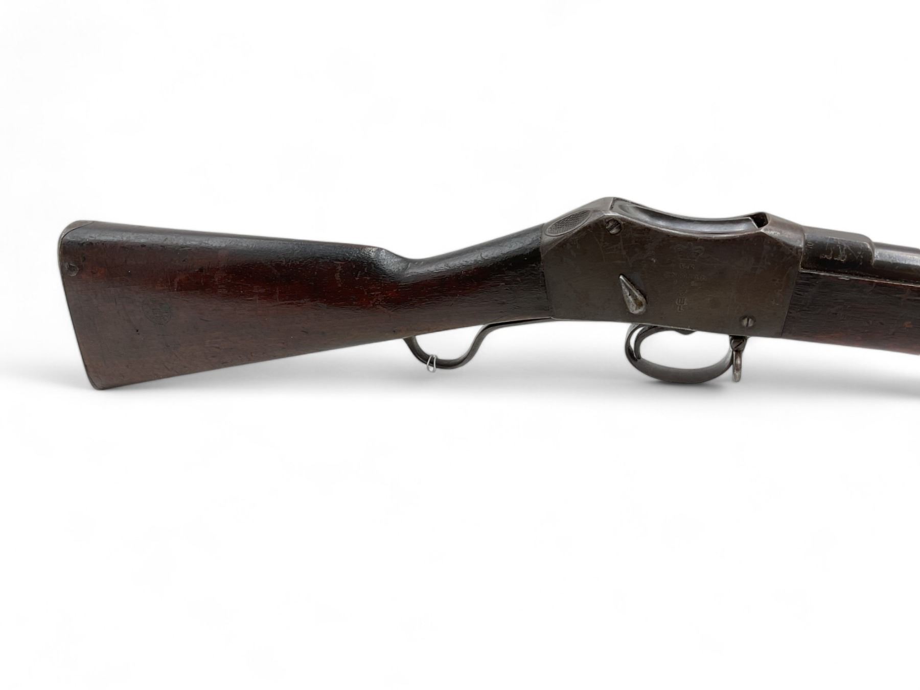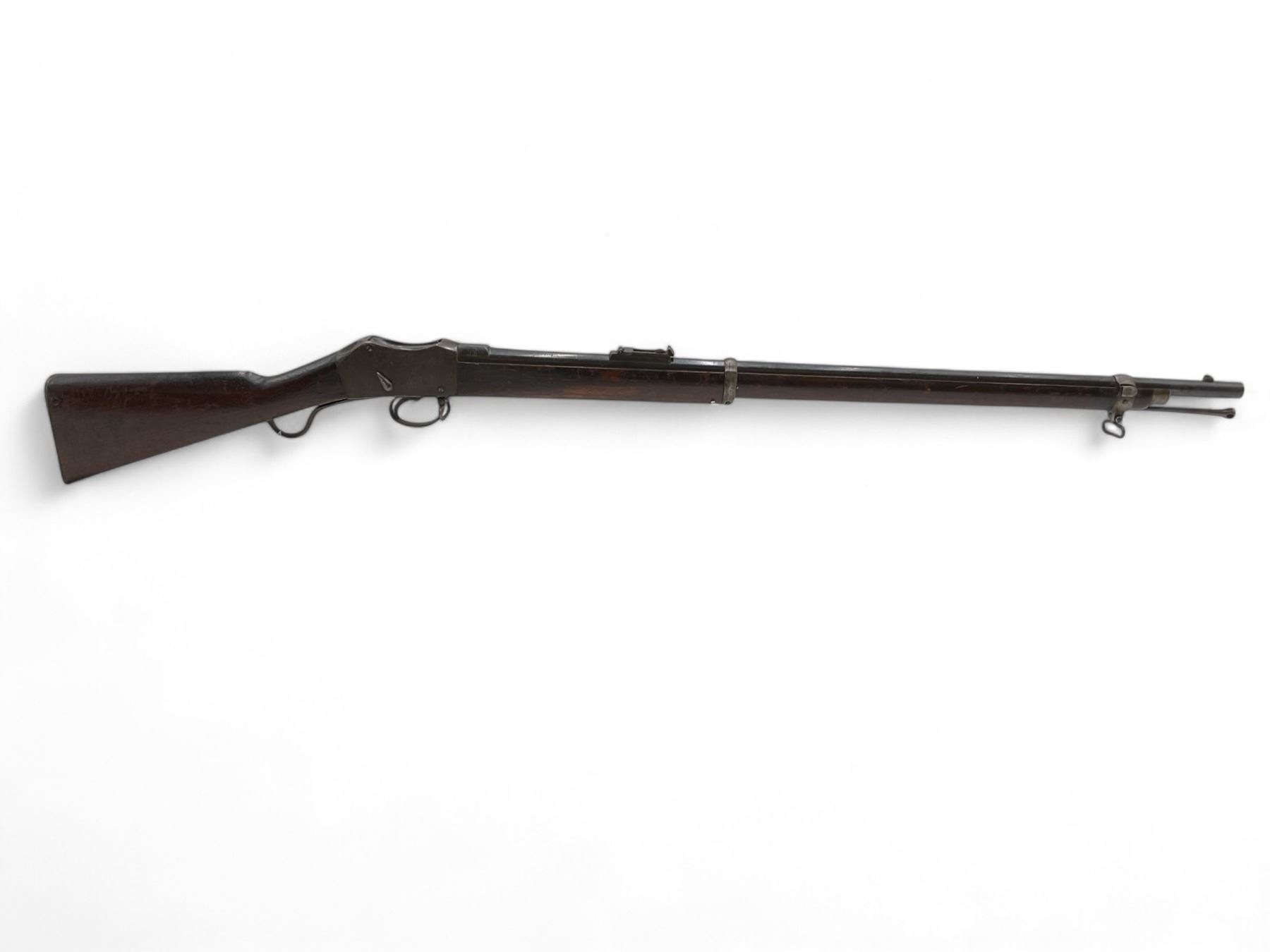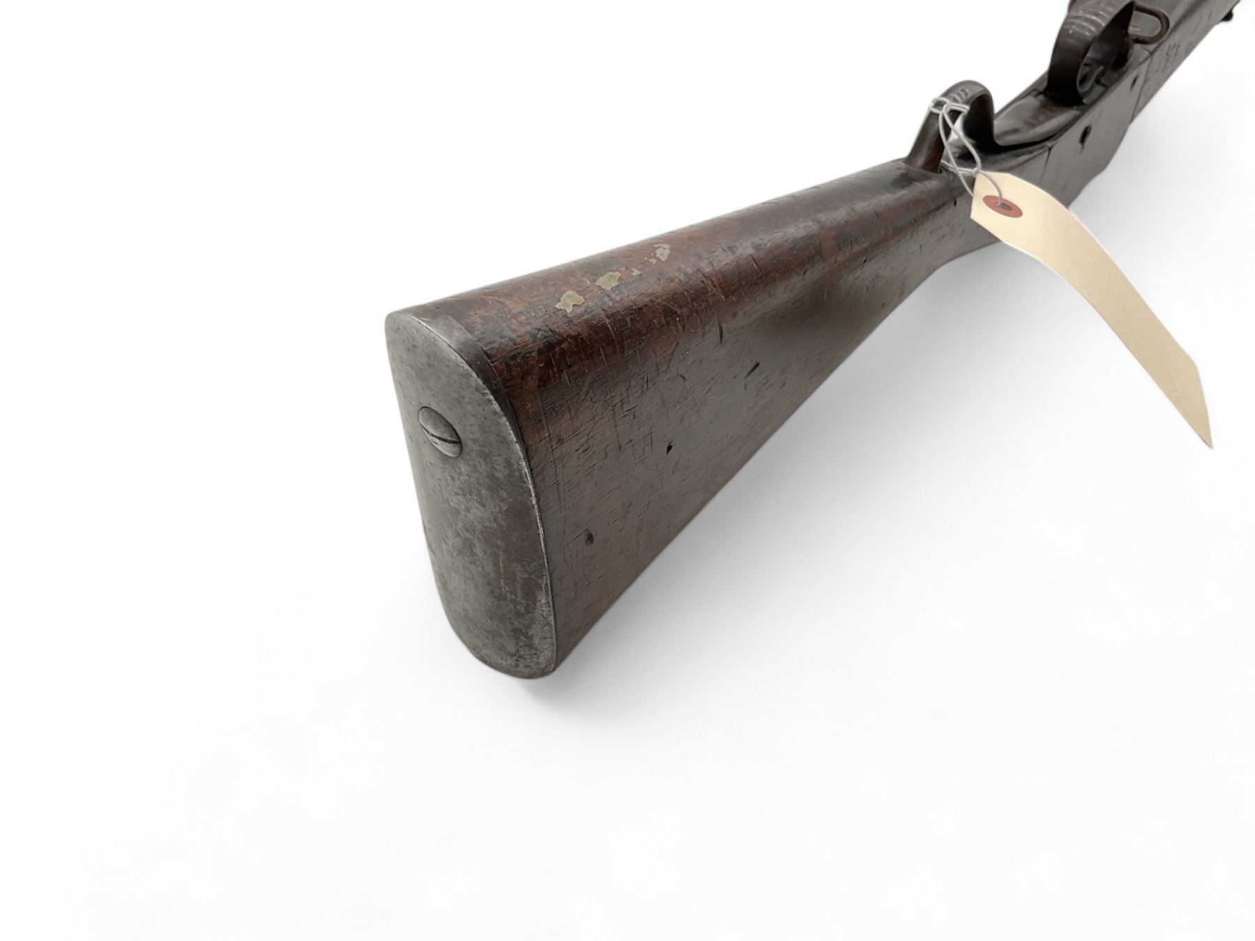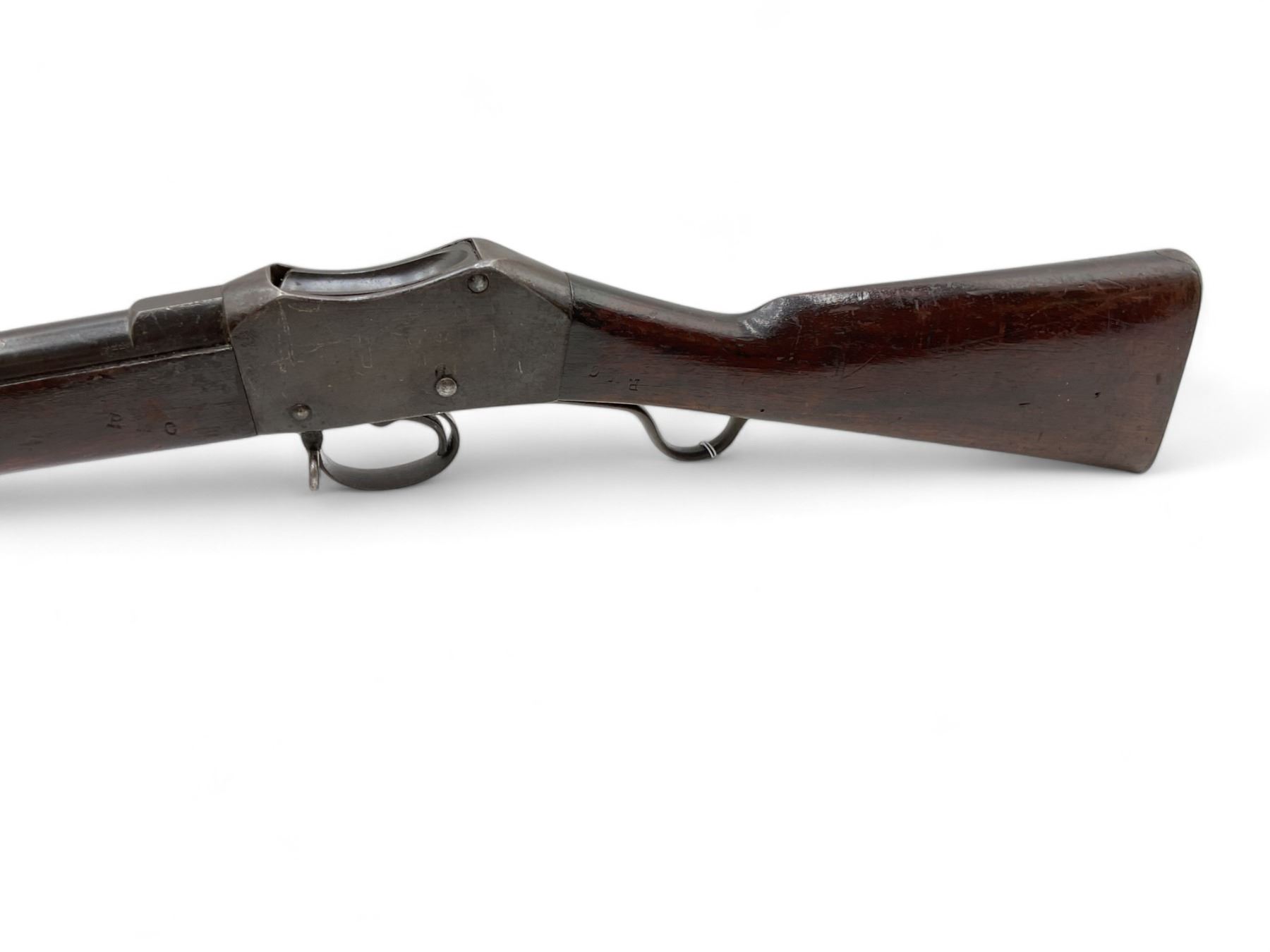 An 1882 Martini-Henry Mark III single-shot rifle chambered in .577/450 Boxer. 33" barrel with good black powder bore. Wood stock with "RMC" marking stamped into the small of the butt. Factory open sights. These were some of the small number of Martini-Henry rifles that were actually issued for use by the Canadian Militia: most Martini-Henry rifles in Canada were used for rifle competition. The Royal Military College of Canada was established in 1876 to train officers for Canada's military.