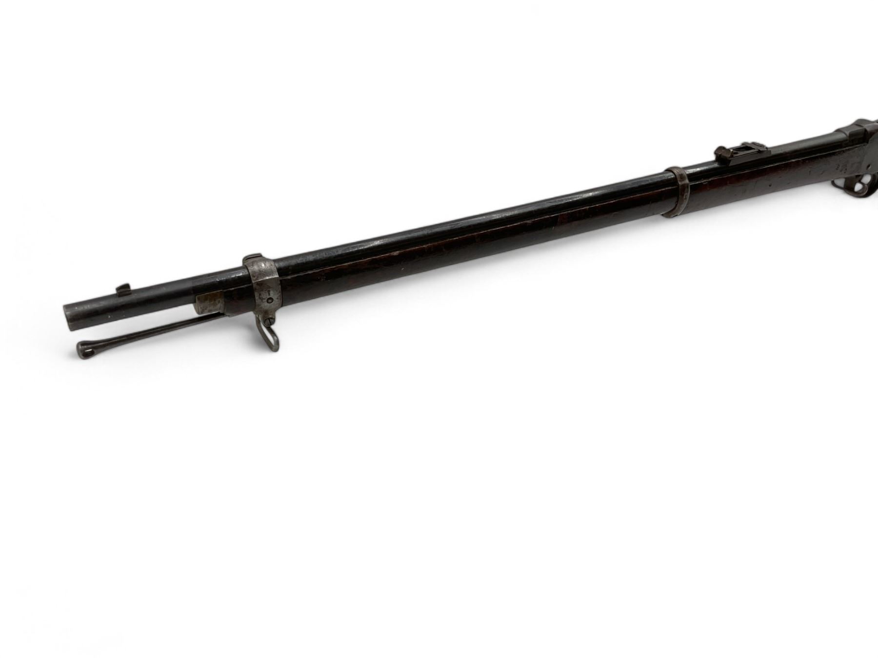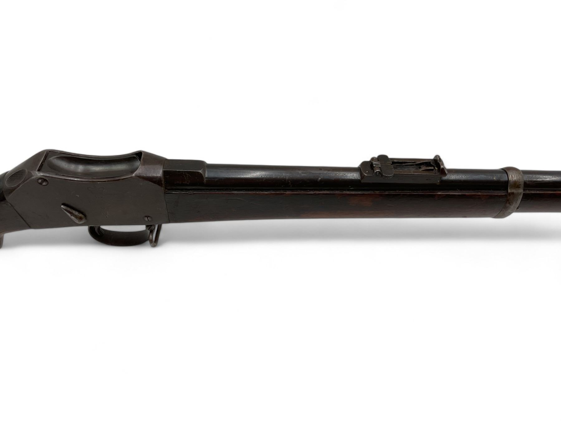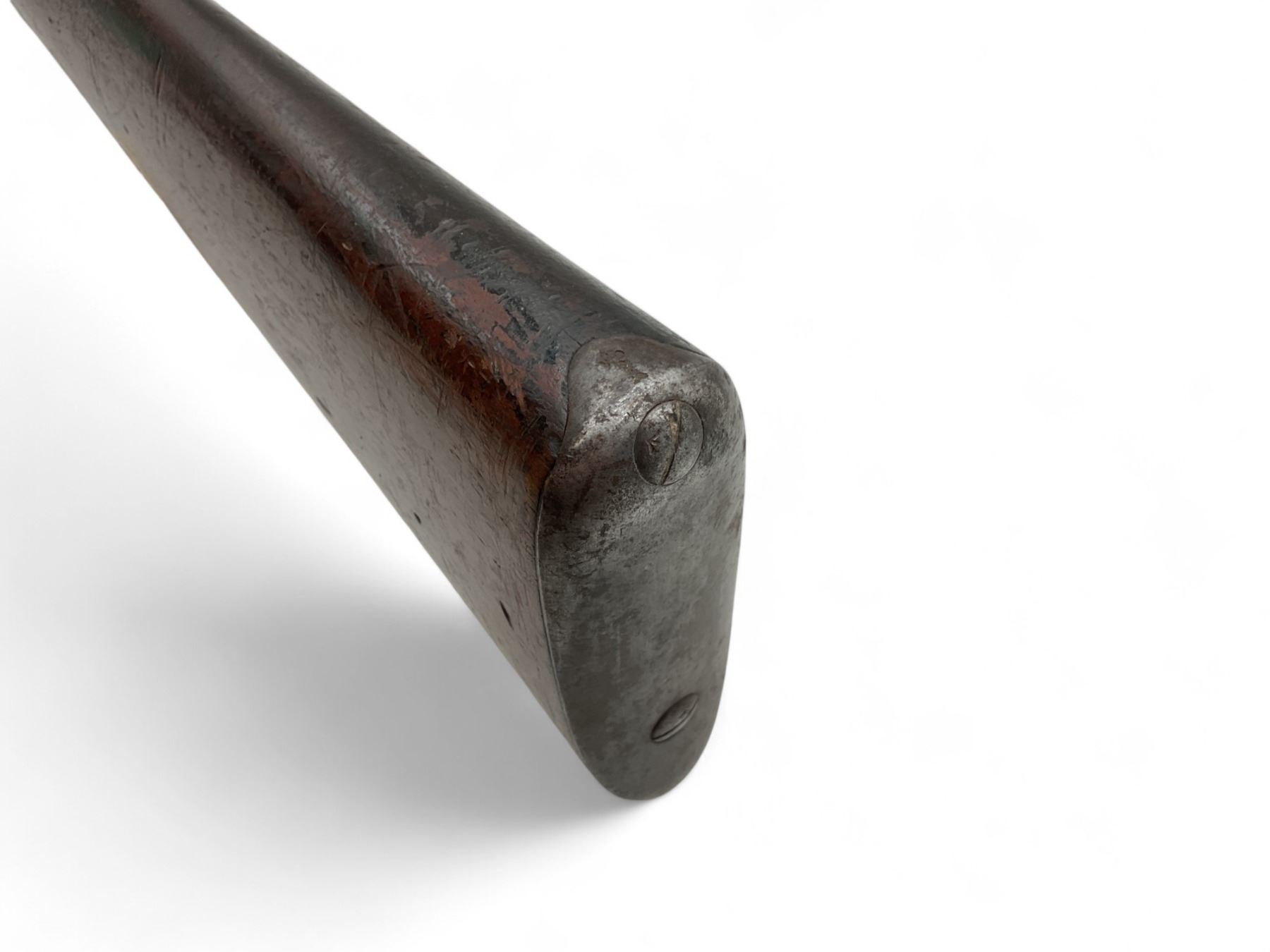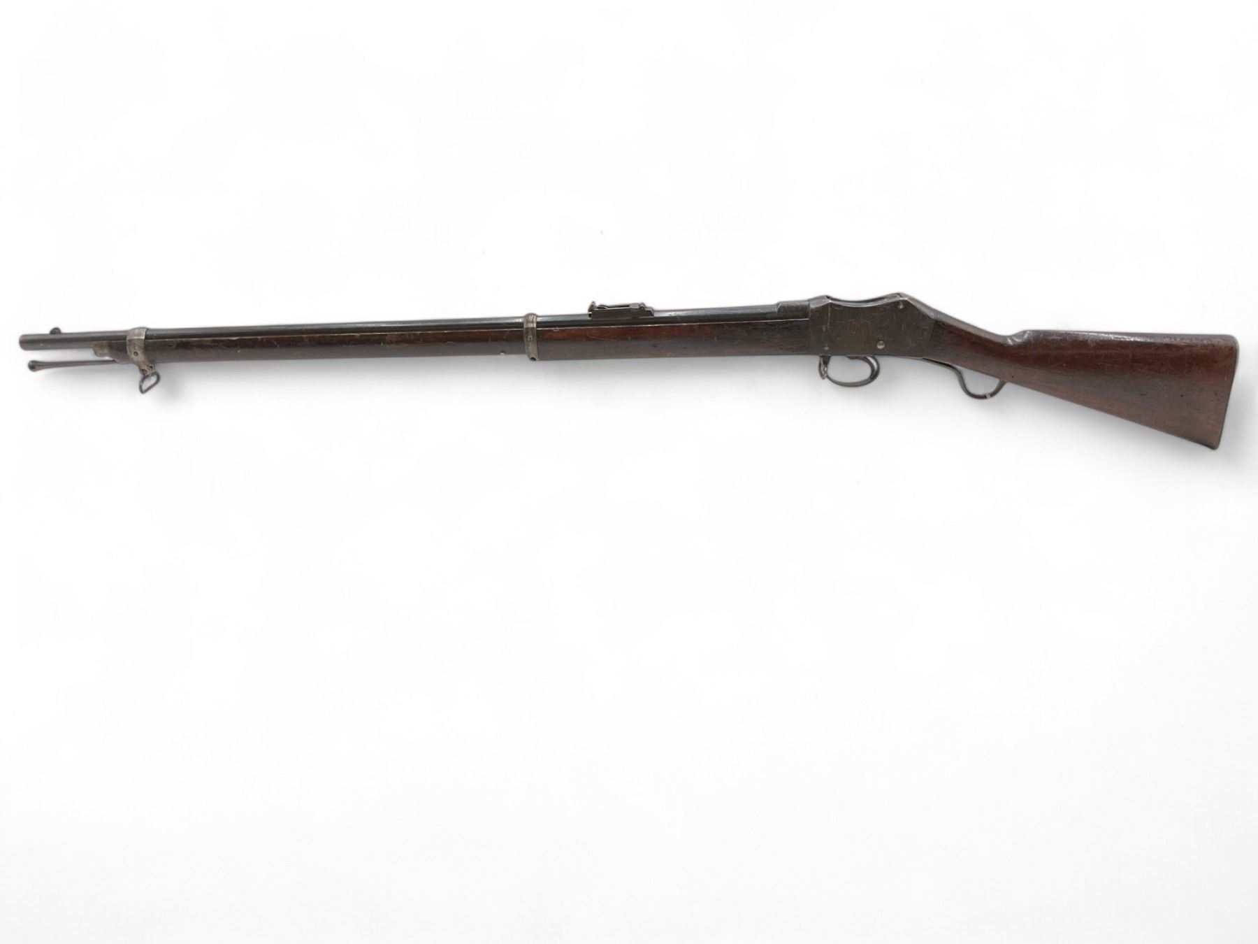 An 1882 Martini-Henry Mark III single-shot rifle chambered in .577/450 Boxer. 33" barrel with good black powder bore. Wood stock with "RMC" marking stamped into the small of the butt. Factory open sights. These were some of the small number of Martini-Henry rifles that were actually issued for use by the Canadian Militia: most Martini-Henry rifles in Canada were used for rifle competition. The Royal Military College of Canada was established in 1876 to train officers for Canada's military.