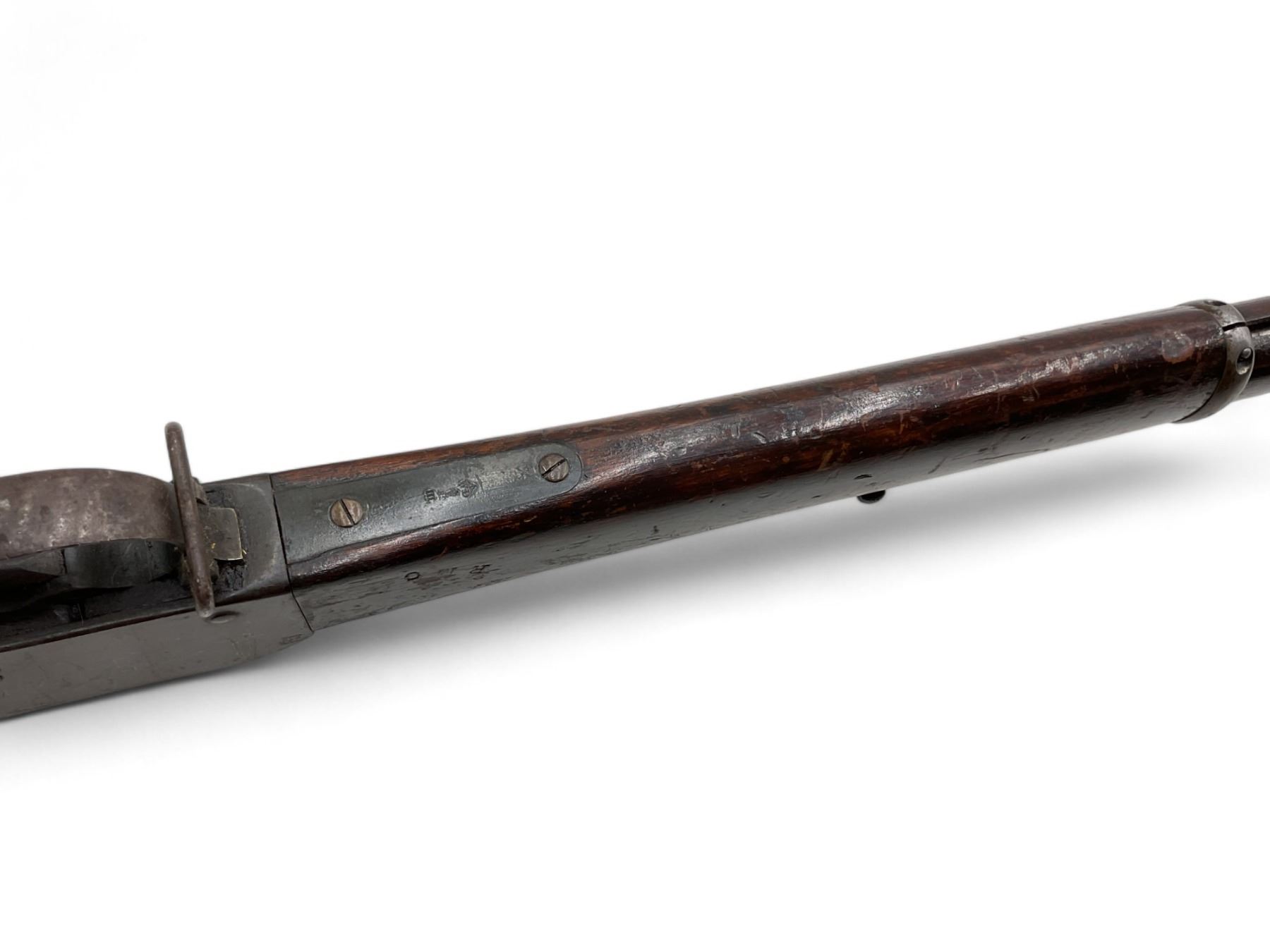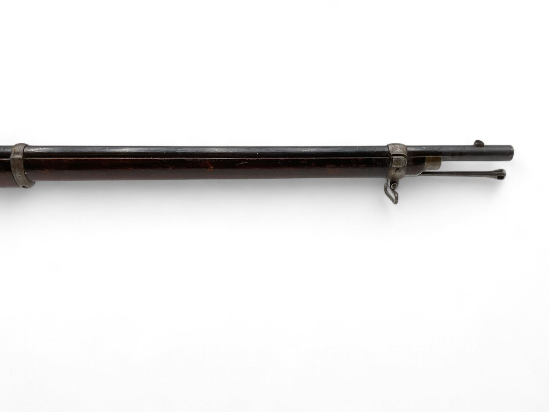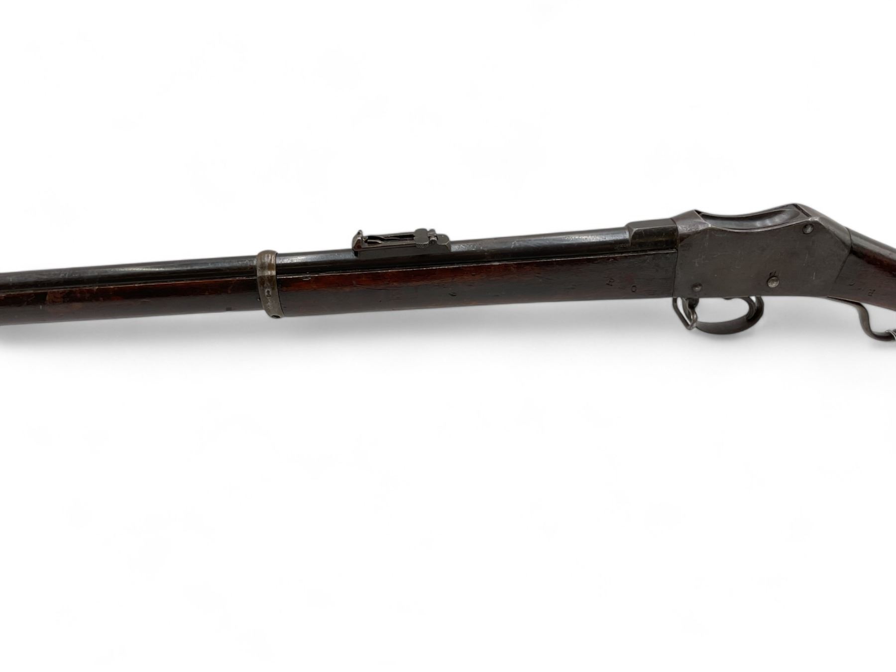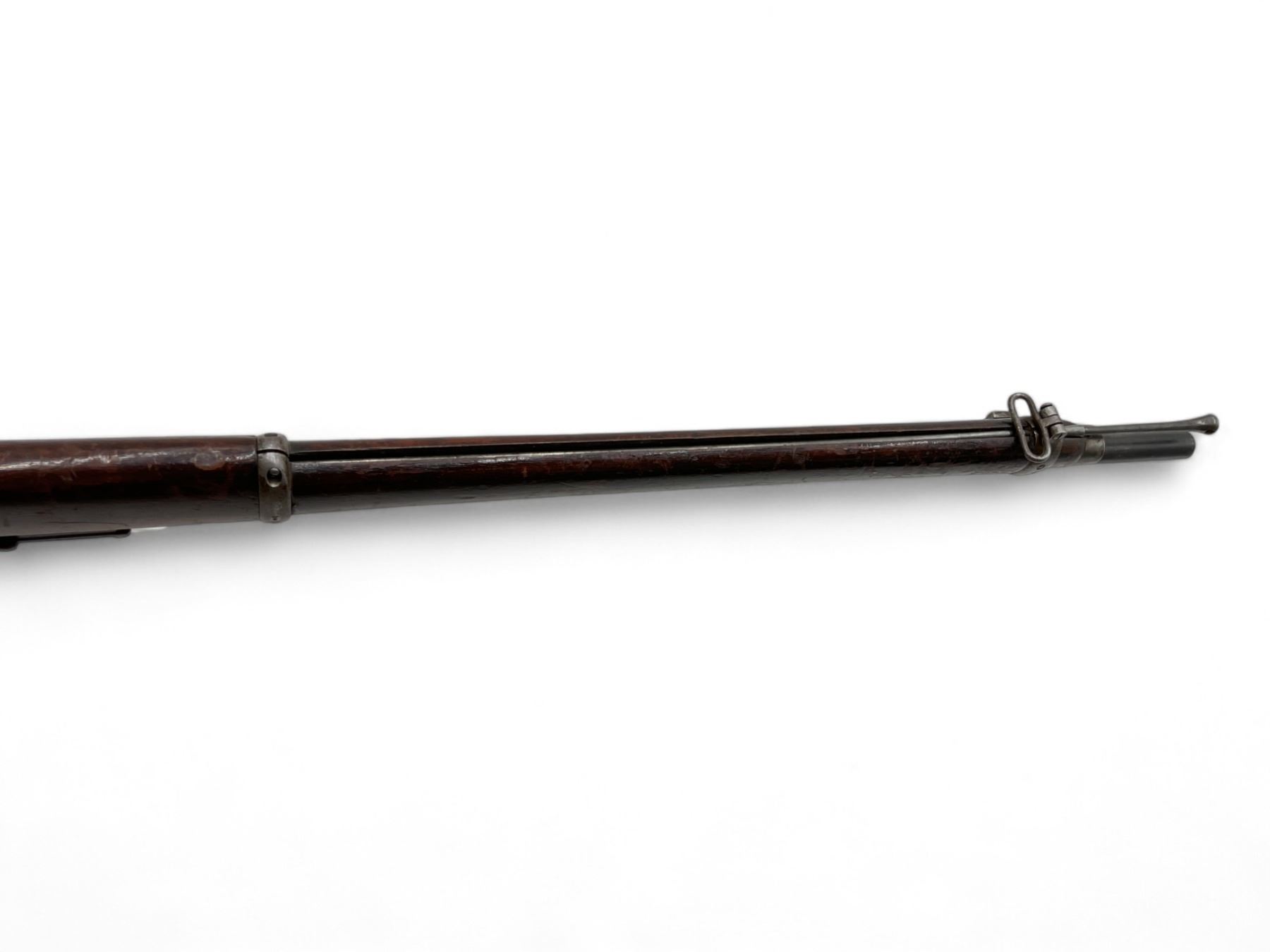 An 1882 Martini-Henry Mark III single-shot rifle chambered in .577/450 Boxer. 33" barrel with good black powder bore. Wood stock with "RMC" marking stamped into the small of the butt. Factory open sights. These were some of the small number of Martini-Henry rifles that were actually issued for use by the Canadian Militia: most Martini-Henry rifles in Canada were used for rifle competition. The Royal Military College of Canada was established in 1876 to train officers for Canada's military.