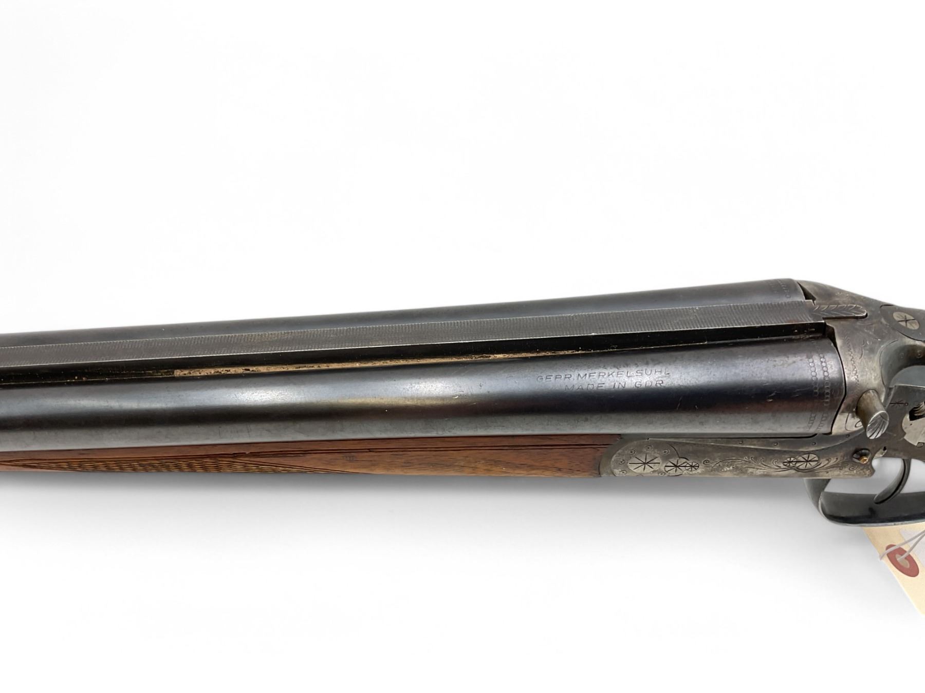 Merkel Side By Side Shotgun 12Ga 2.75" Chambers 28" Barrels No Rear Stock. Bead sight; fixed chokes. Wood forend; double triggers. This is a non-restricted firearm.