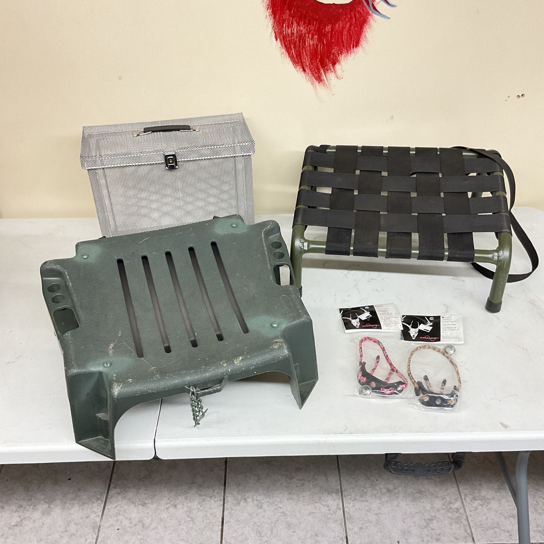 - Stools, 1 Mesh with Strap and One Plastic Stool with Case Underneath for Calls, Etc