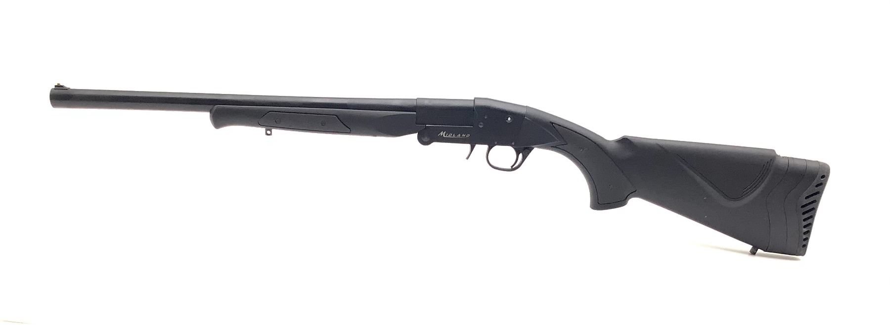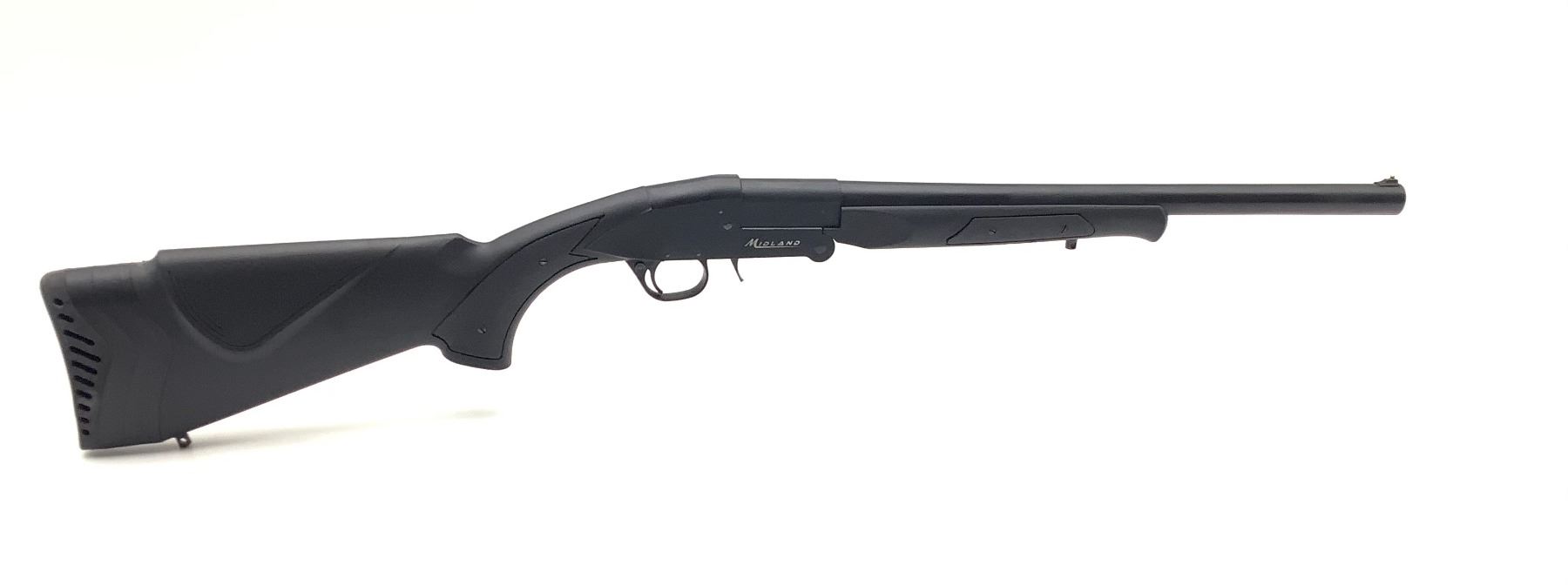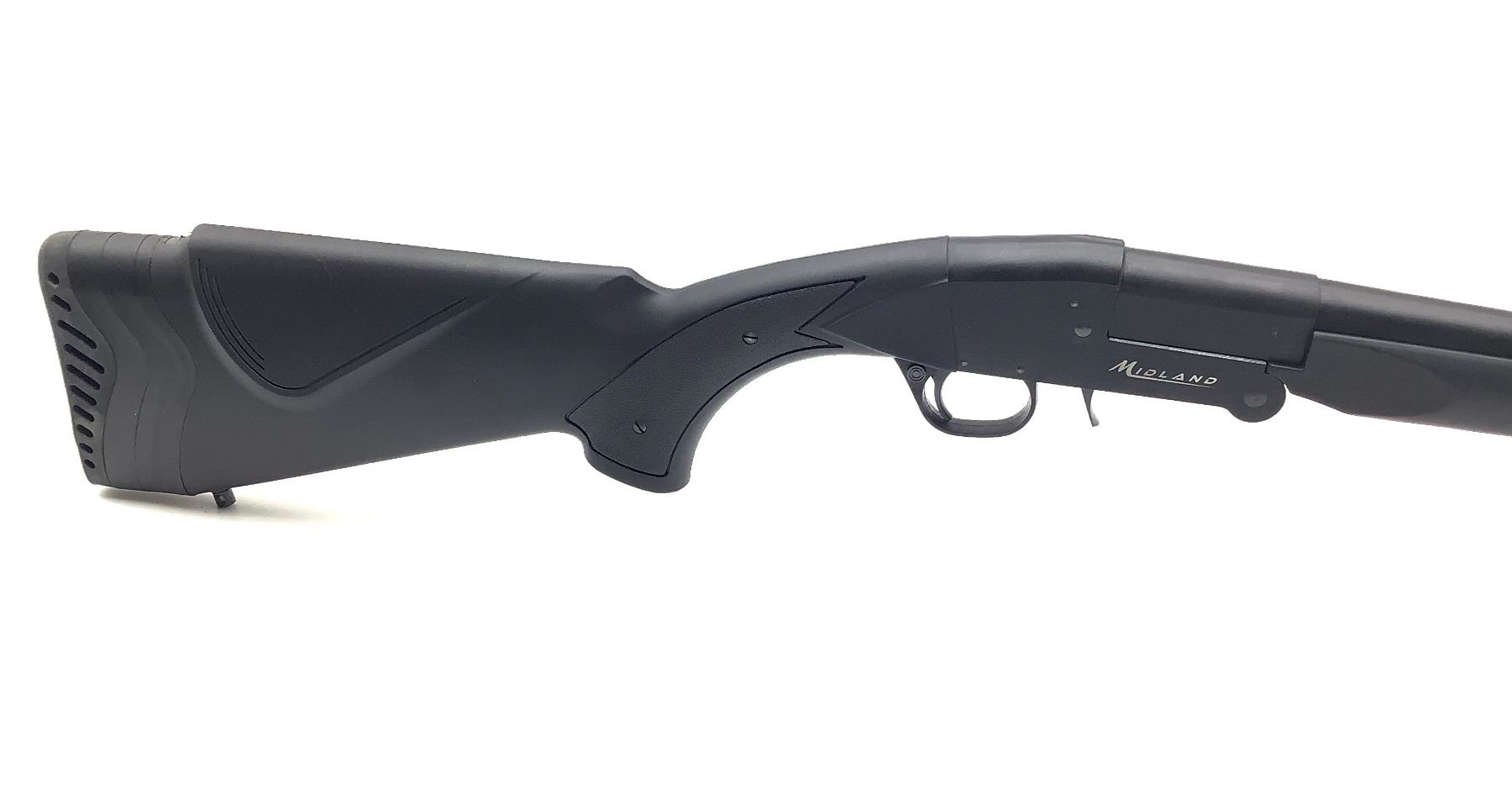 Midland Single Shot 12Ga Shotgun 3" Chamber 18.5" Barrel Black Synthetic Stock. Removable choke, bead sight. Rubber butt pad. This is a non-restricted firearm.