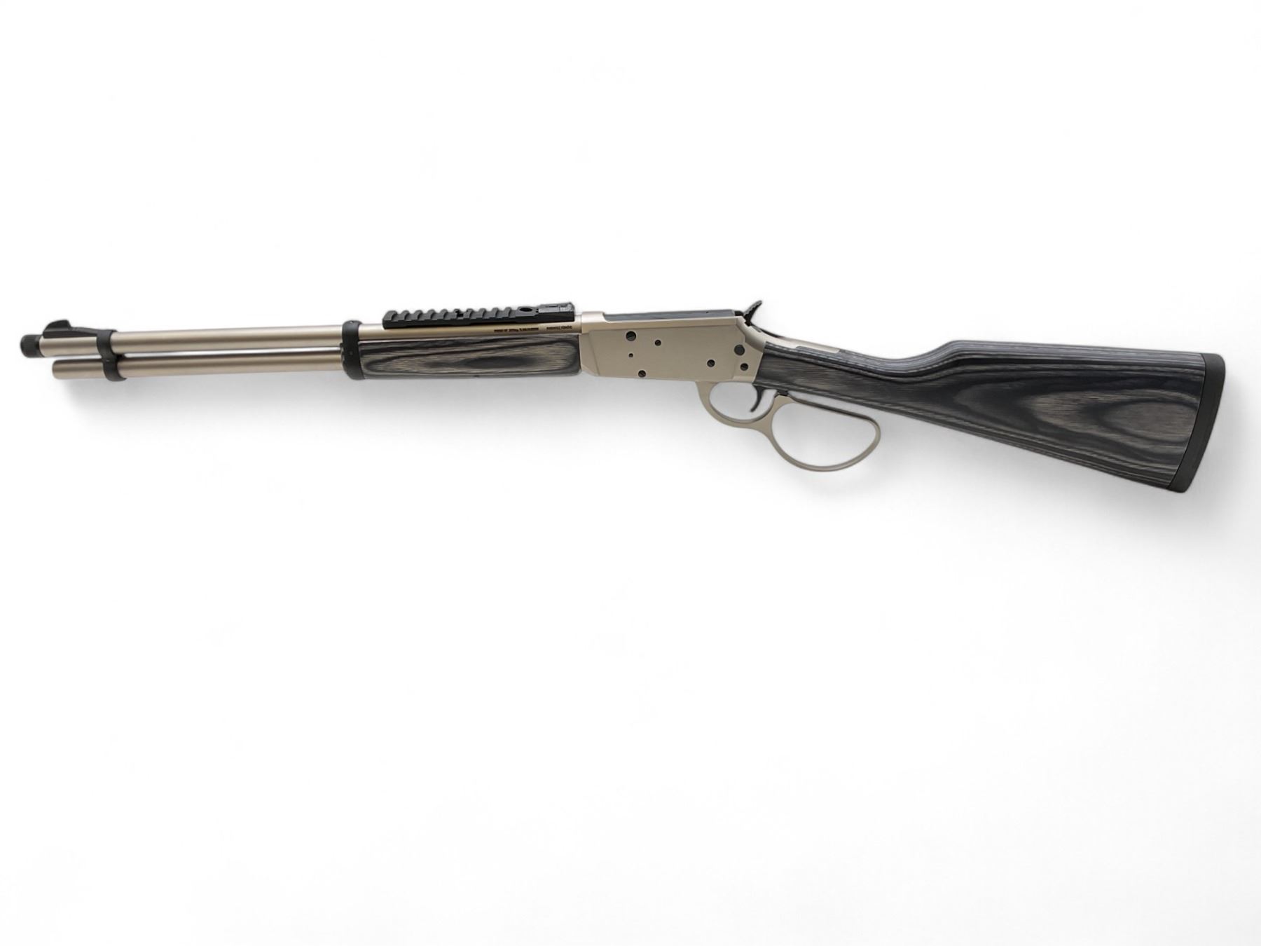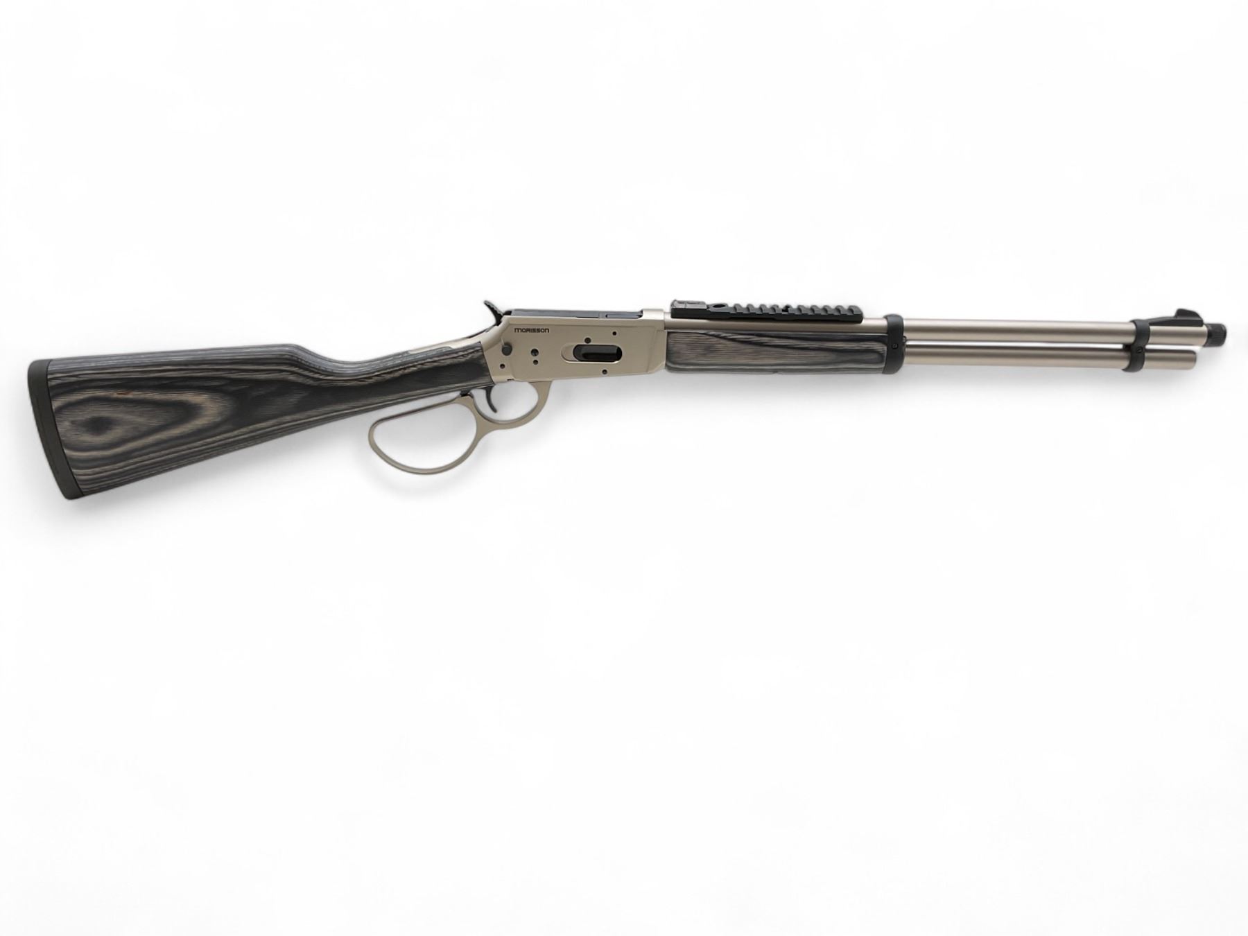 Morisson PRZ357 Lever Action Rifle .357 Magnum 18″ Threaded Barrel Nickle Finish Grey Laminate Stock, New. Tubular magazine; large loop lever. Fixed front sight; scout rail installed on barrel with built in rear sight. This is a non-restricted firearm.