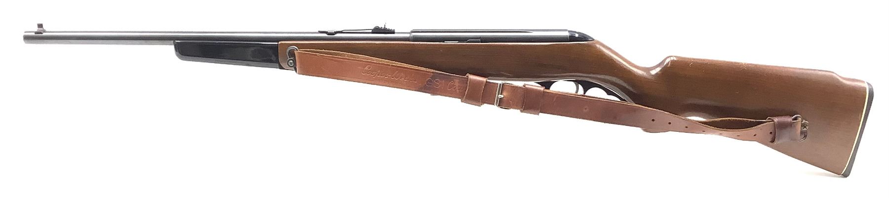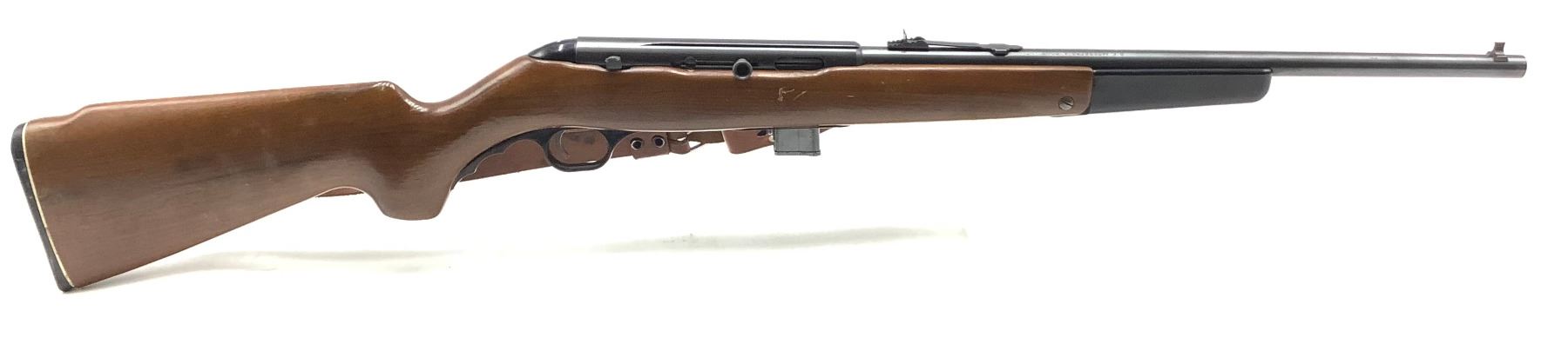 A used Mossberg 325KB semi-automatic rifle chambered in .22 Short High Velocity, - Long and - Long Rifle. Black plastic tip on stock folds down as vertical foregrip. Includes leather sling. Good conditoion overall.