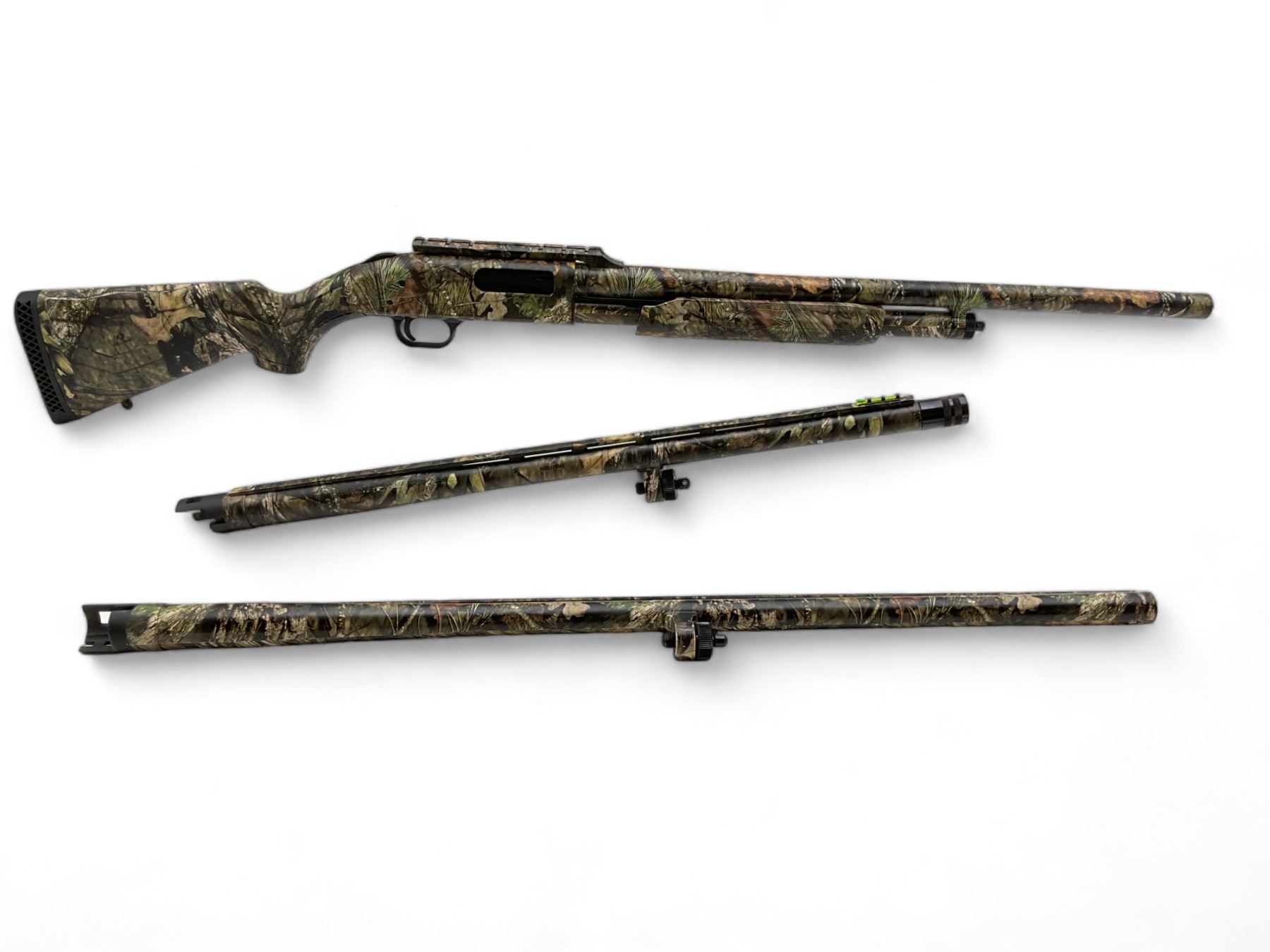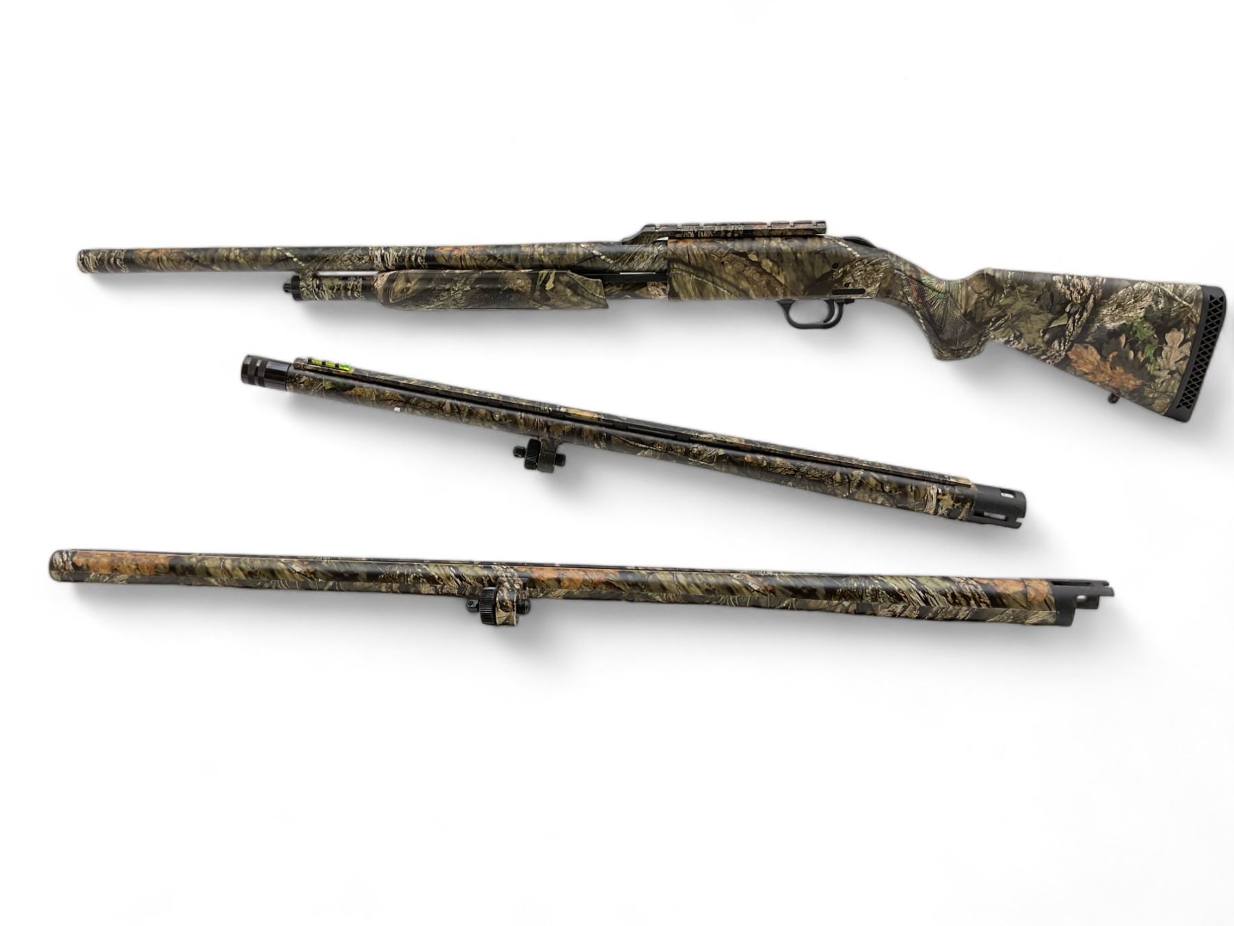 Mossberg 500 Camo Pump Action Shotgun 12Ga 3" Chamber 3 Barrel 28" Waterfowl/24" Turkey/24" Rifled, New. 28" vent rib barrel has removable choke and bead sight. 24" vent rib turkey barrel has removable extended choke and fiber optic sight. 24" fully rifled barrel has cantilever mount. This is a non-restricted firearm.