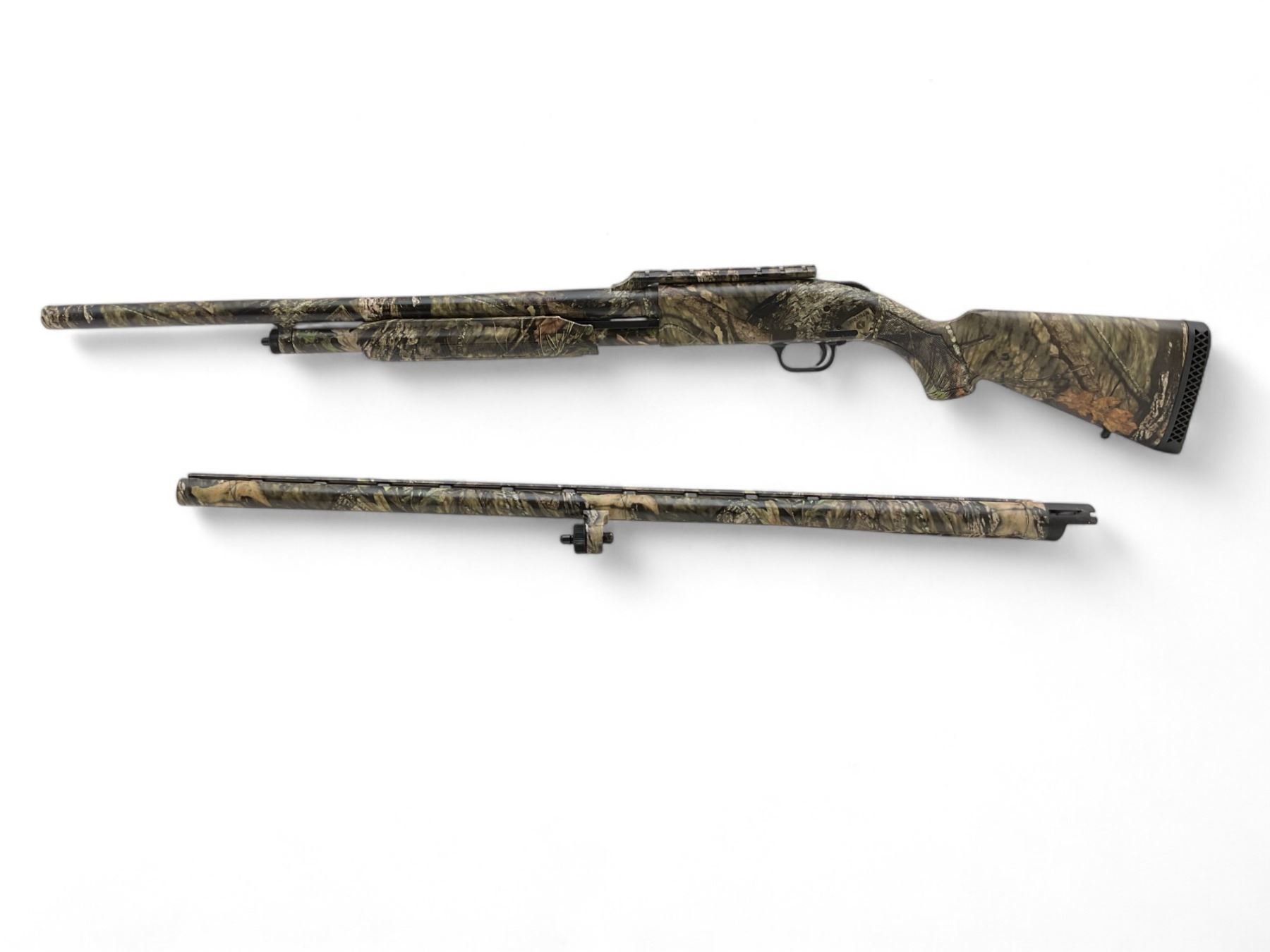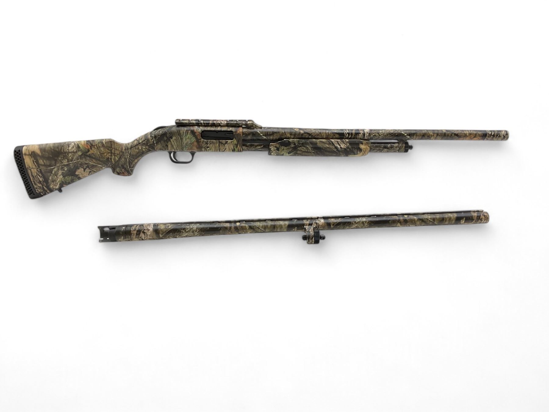 Mossberg 500 Pump Action 12Ga Shotgun 3" Chamber Camo Finish 2 Barrel Combo 24" Slug Barrel And 28" VR Barrel, New. Rifled lug barrel has cantilever mount. 28" barrel has vent rib with dual beads and removable choke. This is a non-restricted firearm.