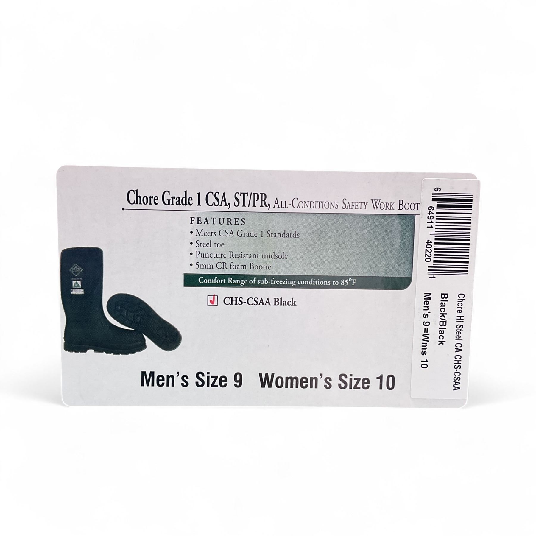 Muck Boots Chore Grade 1, CSA, ST/ PR All Conditions Safety Work Boot, Men's Size:9, Women's Size: 10, Black