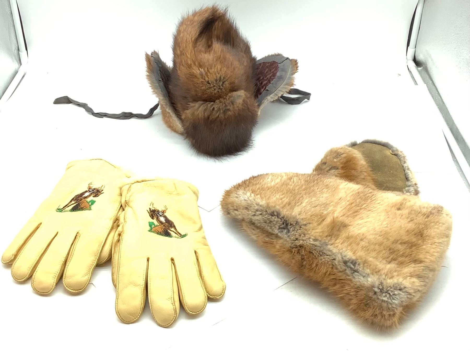 Set of Muskrat Fur Gloves, Leather Embroidered Winter Doe Skin Gloves and Muskrat Fur Trapper Hat, all Men's Size Large