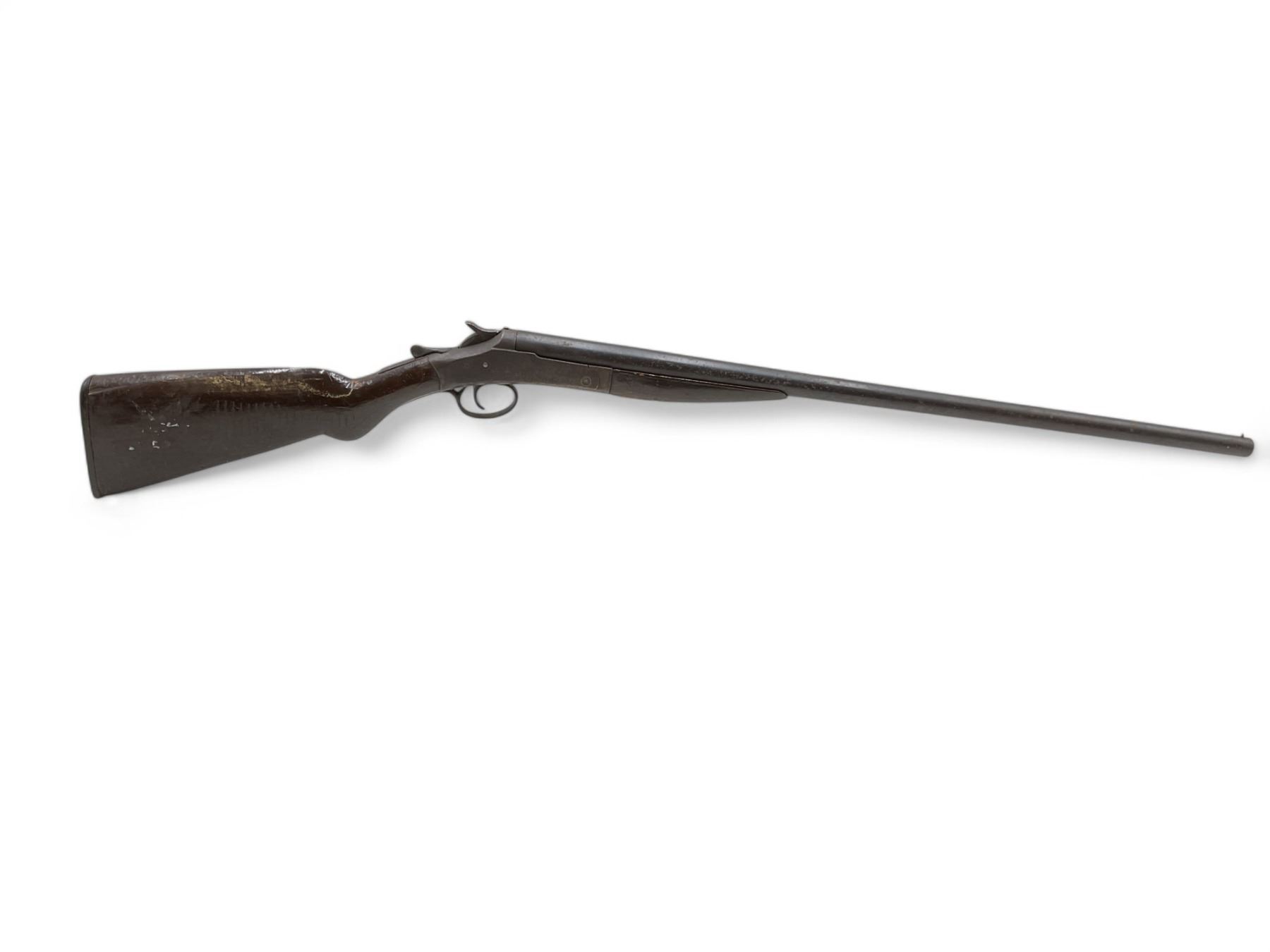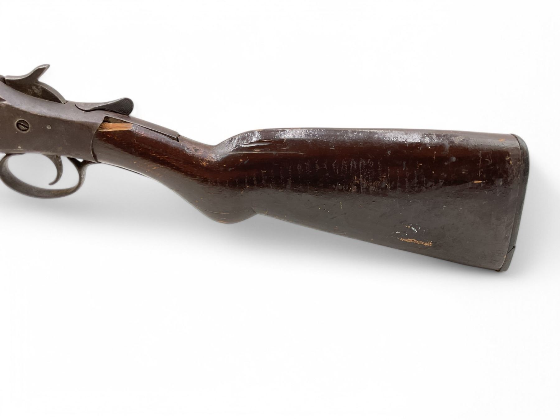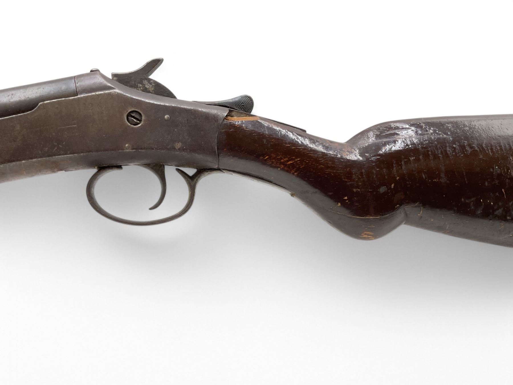 New Victor Single Shot Shotgun 12Ga 30" Barrel Wood Stock. Bead sight; fixed choke. Rear stock cracked and chipped. Plastic butt plate is cracked. Action is loose; lock up lever is loose and does not return to closed position. This is a non-restricted firearm.