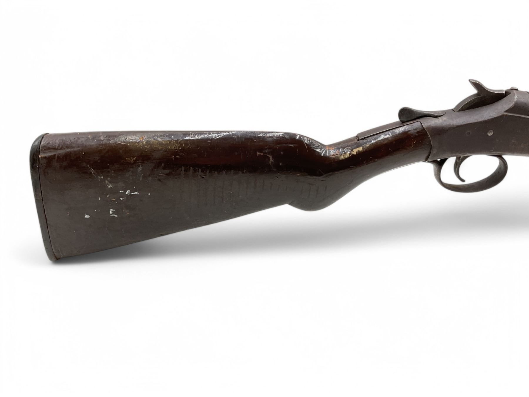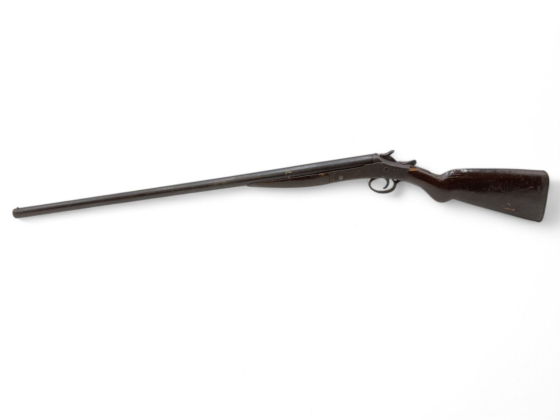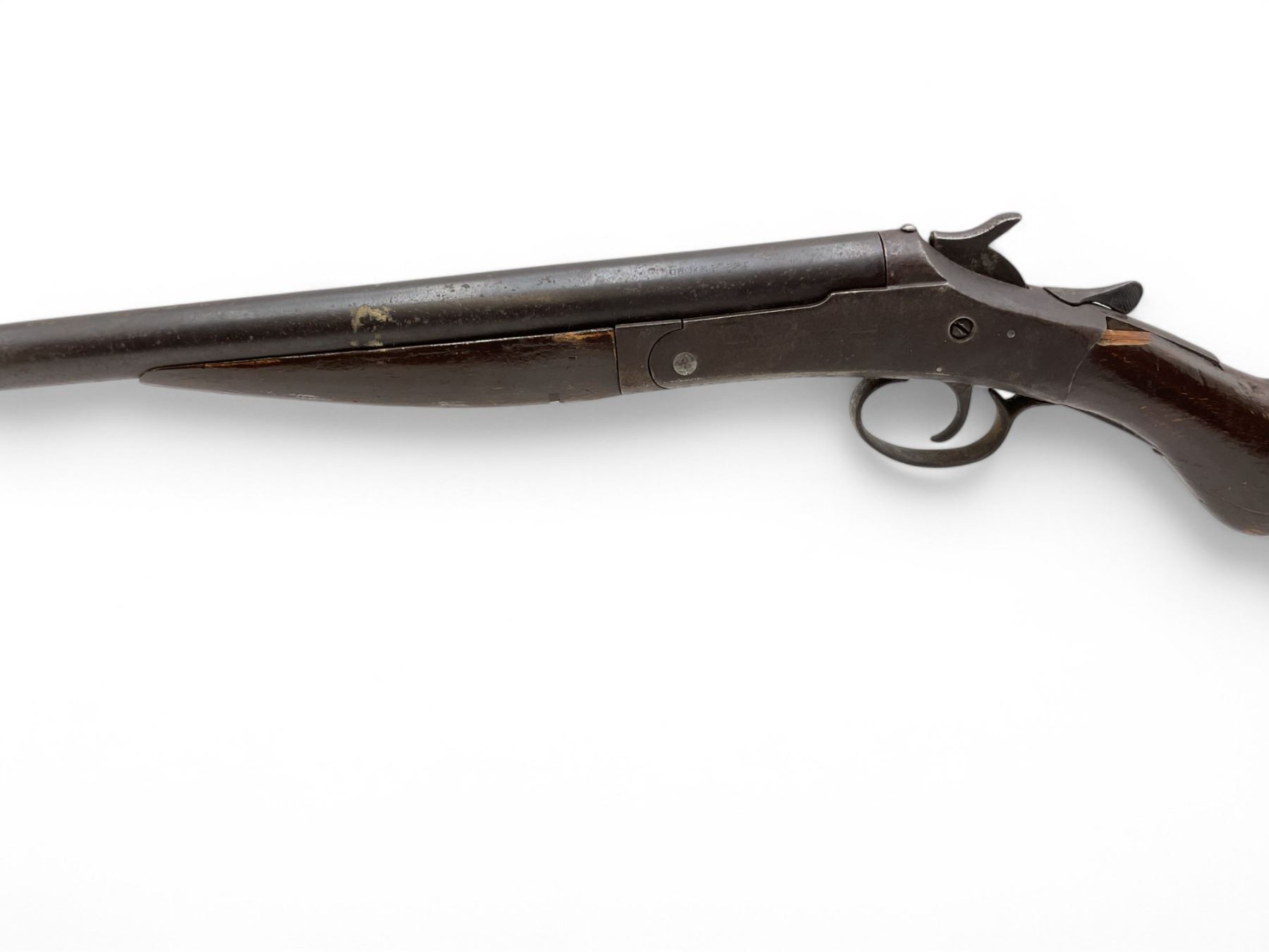 New Victor Single Shot Shotgun 12Ga 30" Barrel Wood Stock. Bead sight; fixed choke. Rear stock cracked and chipped. Plastic butt plate is cracked. Action is loose; lock up lever is loose and does not return to closed position. This is a non-restricted firearm.
