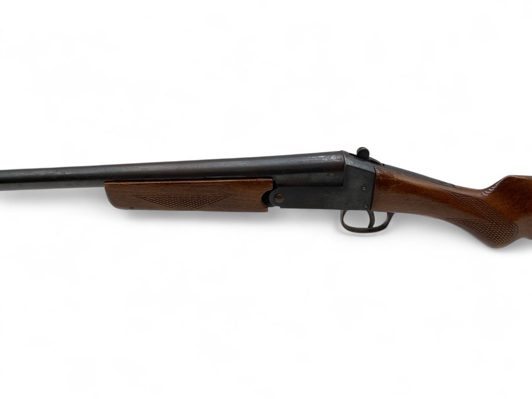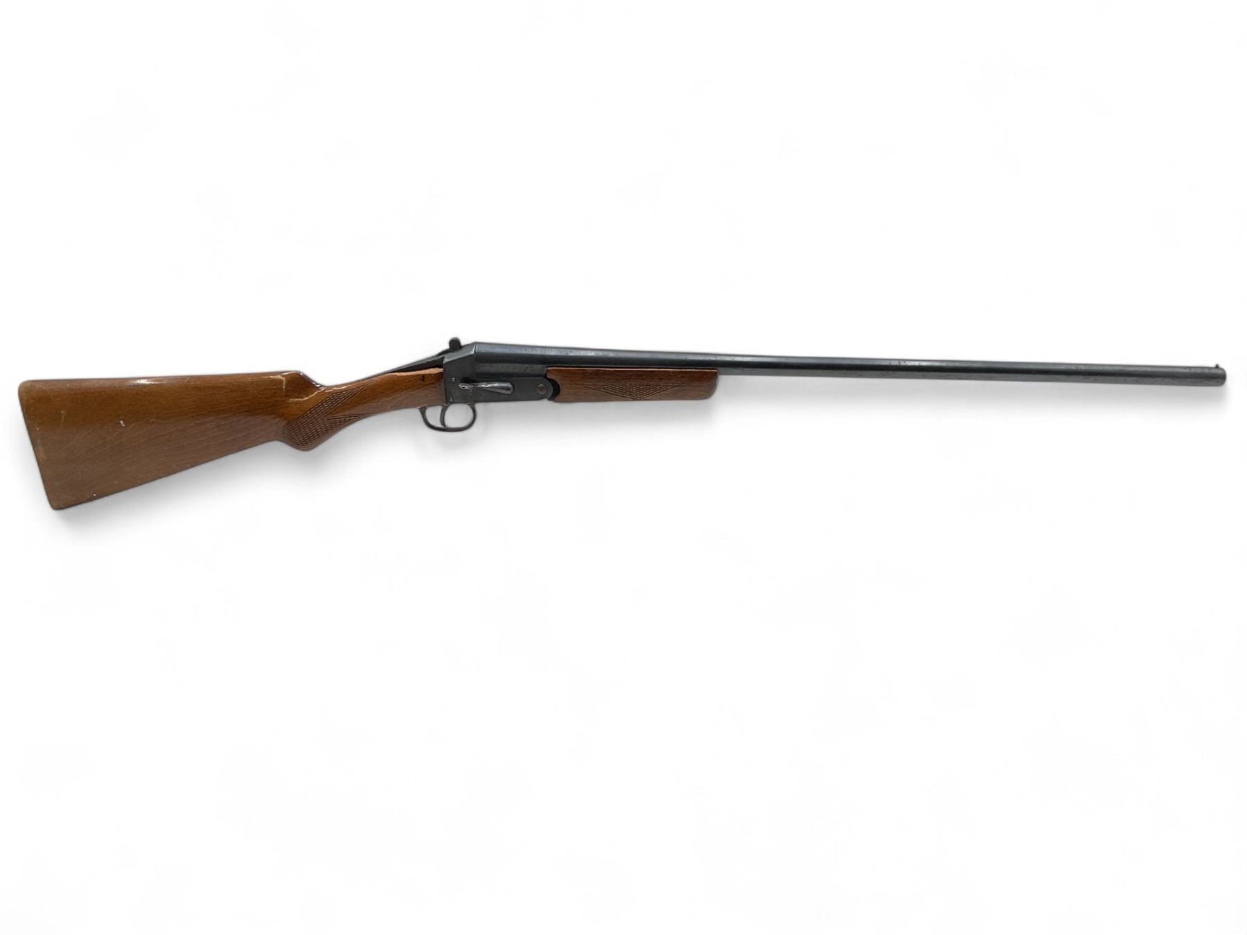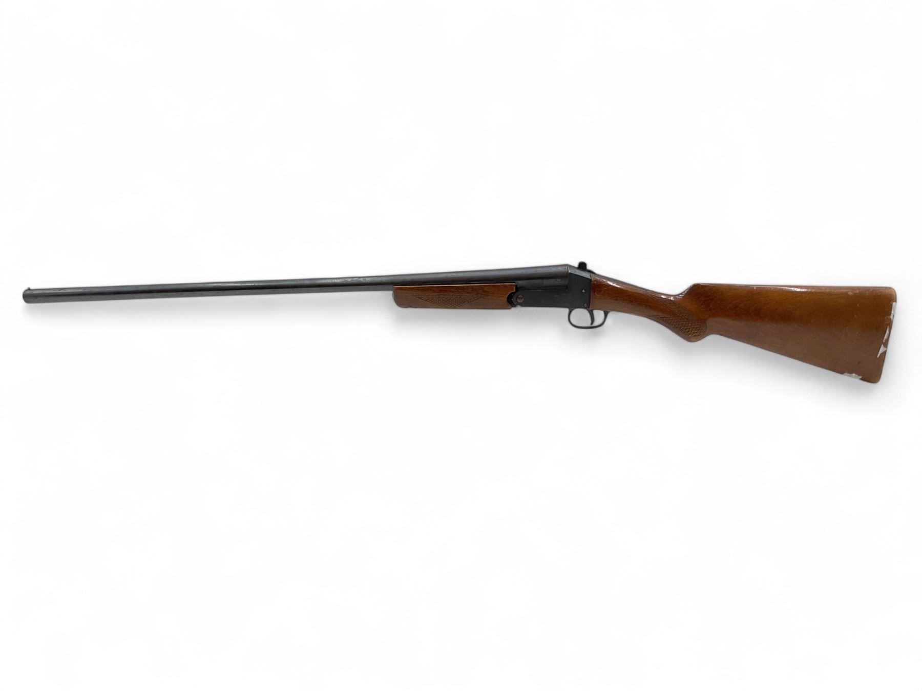Norica Single Shot Shotgun 20Ga 28" Barrel Wood Stock. Bead sight, fixed choke. Wood forend does not fit correctly; rear stock broke and missing piece by right side rear receiver. No butt pad present. This is a non-restricted firearm.