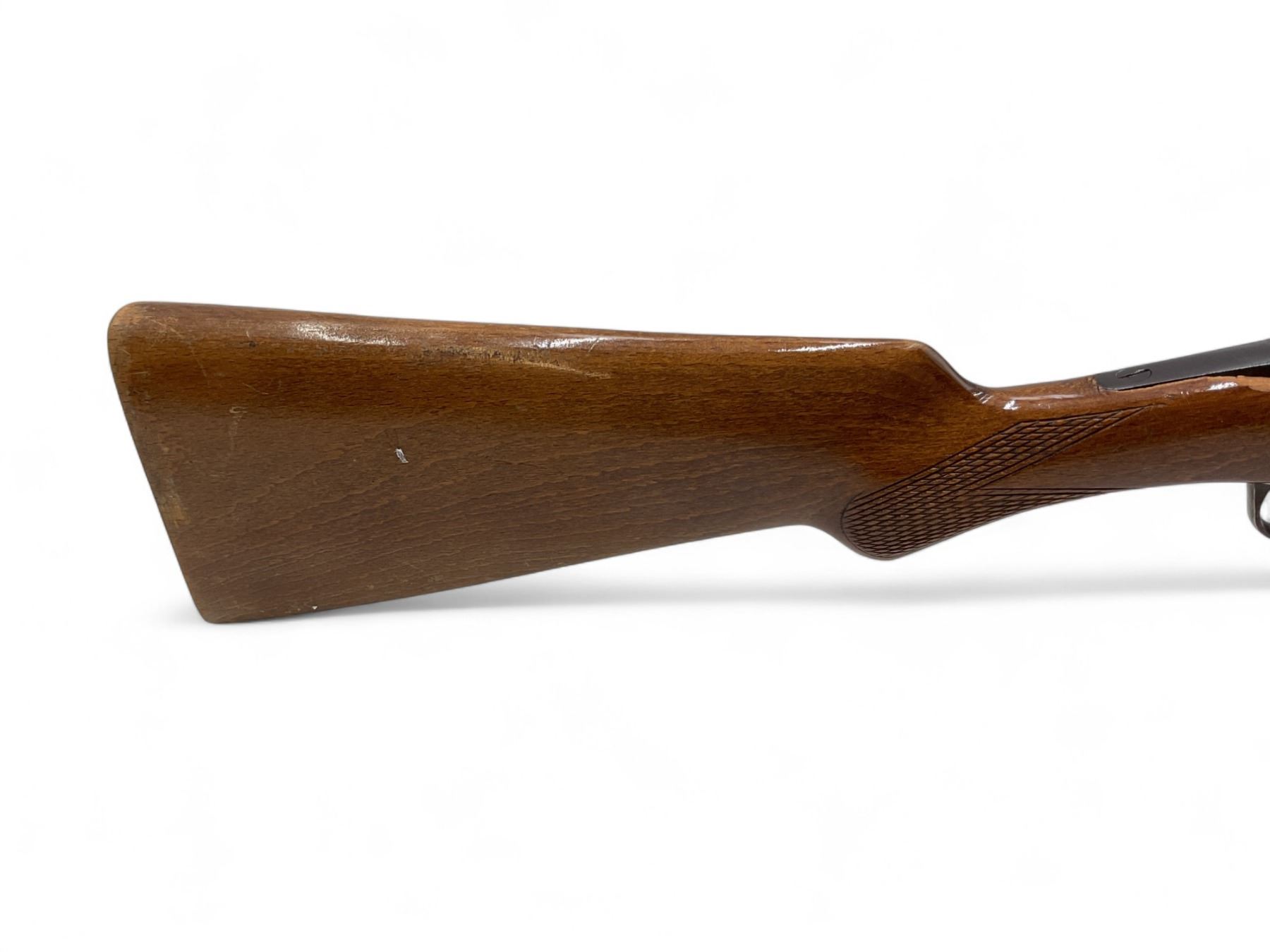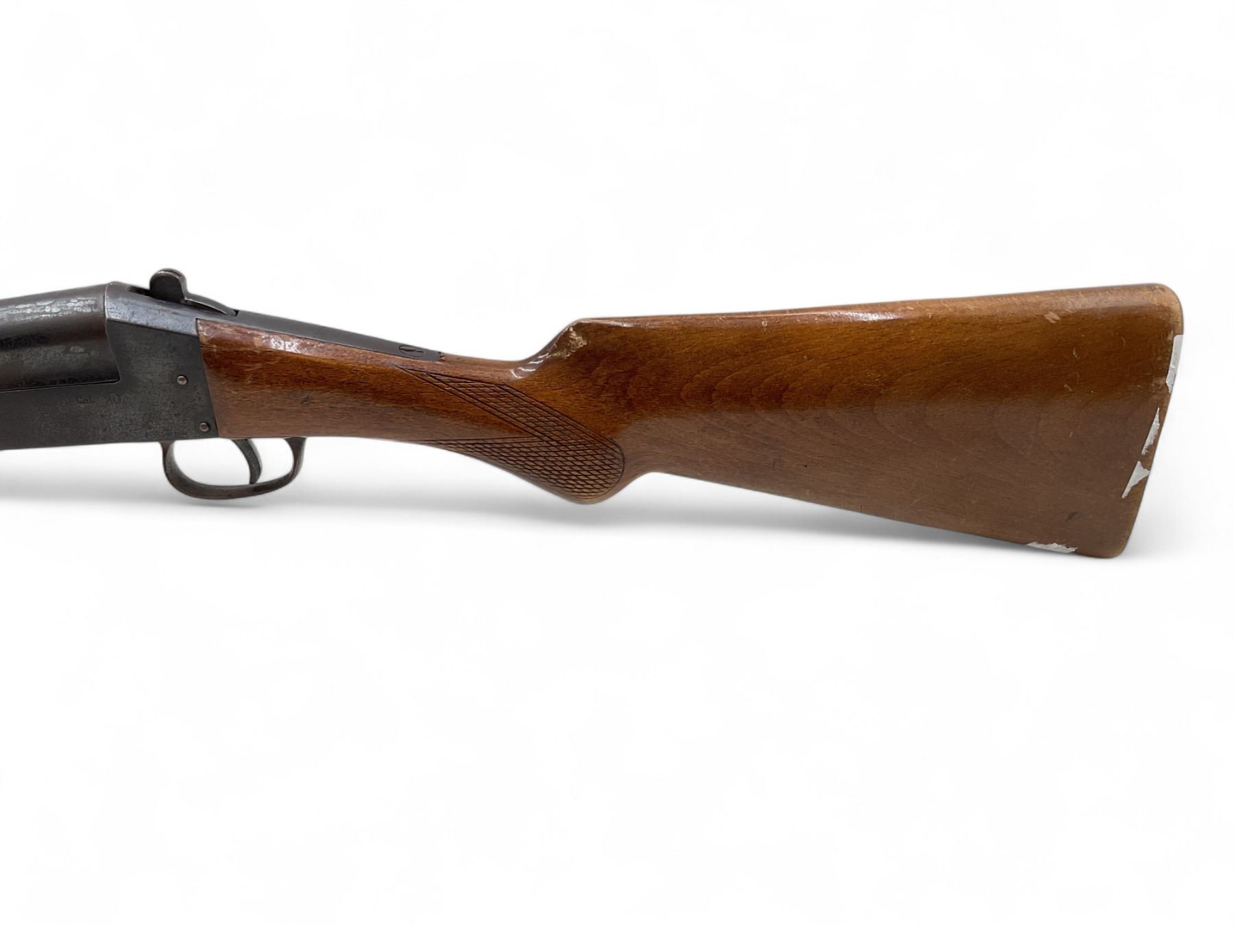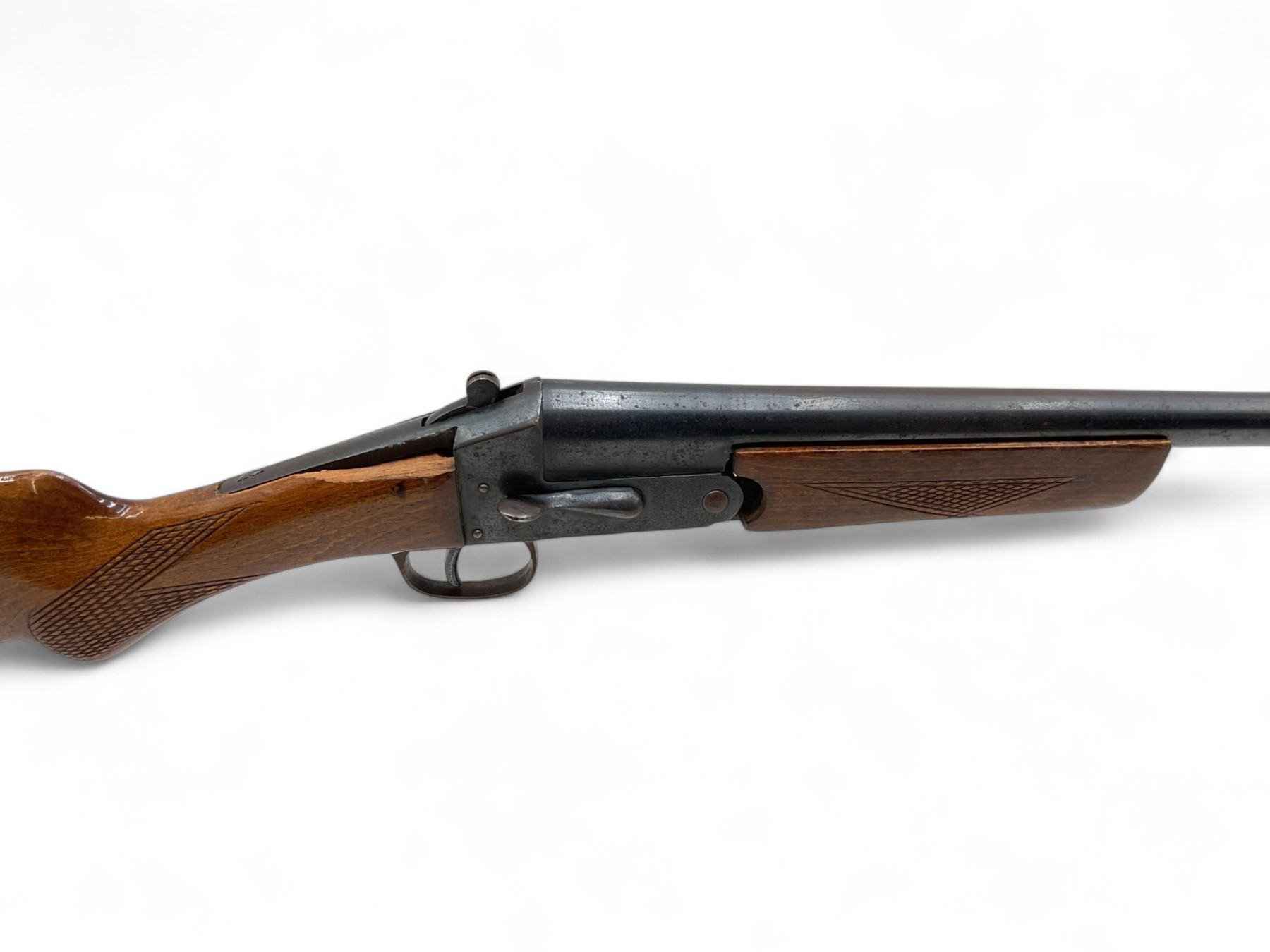 Norica Single Shot Shotgun 20Ga 28" Barrel Wood Stock. Bead sight, fixed choke. Wood forend does not fit correctly; rear stock broke and missing piece by right side rear receiver. No butt pad present. This is a non-restricted firearm.