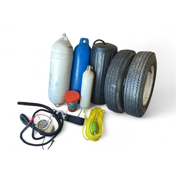 Boating Lot.. Includes Bilge Pump, Fenders, Rope, Safety Kit, Boat Winch Strap and Tires1502 - Boating Lot.. Includes Bilge Pump, Fenders, Rope, Safety Kit, Boat Winch Strap and Tires
