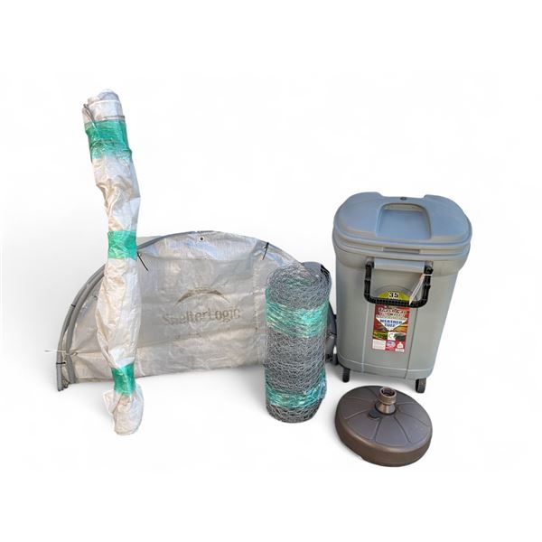 Garden Lot.. Mighty Tuff 35 Gallon Garbage Can, Chicken Wire Approx 2' X 25', Shelter Logic Garden Cover/ Shelter 4' X 4', Umbrella ...