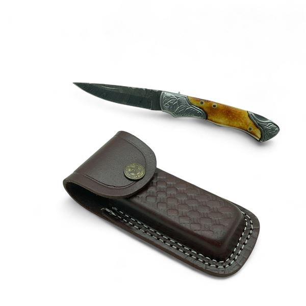 Folding 2 1/2" Blade Pocket Knife with Bone Handle, Leather Pouch