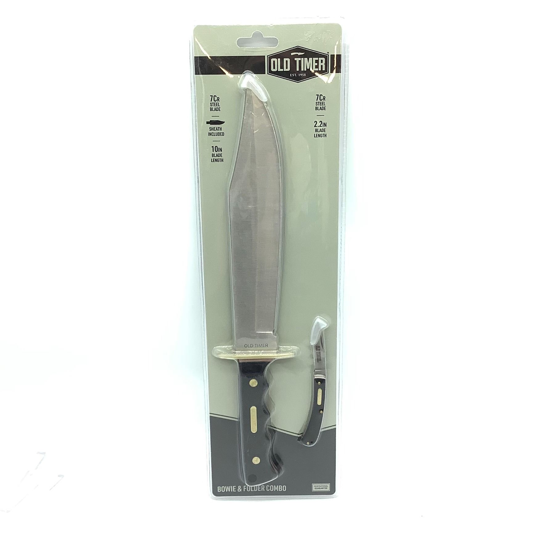 Old Timer 10" Fixed Blade Bowie Knife with Sheath and 2.2" Folder Combo, New
