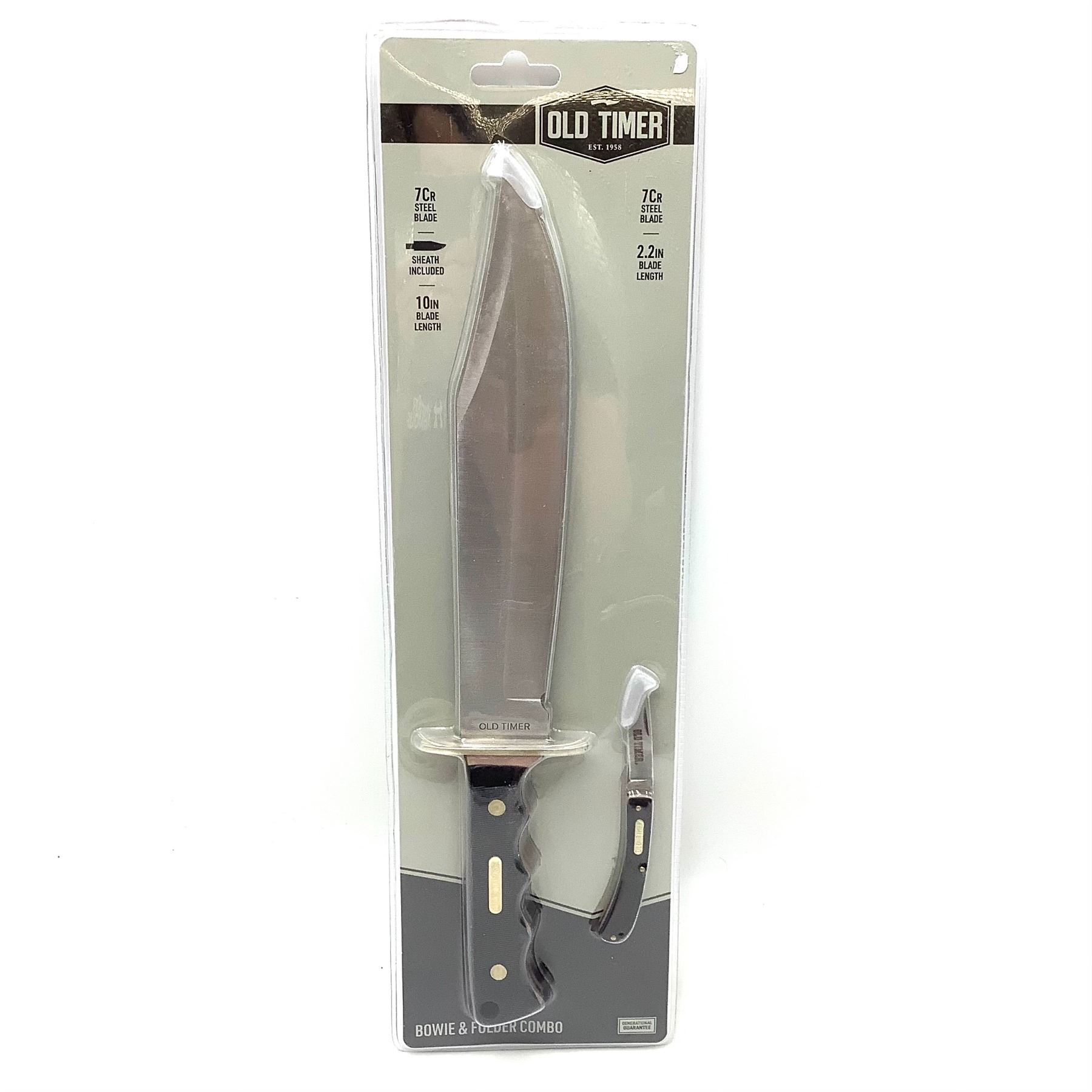 Old Timer 10" Fixed Blade Bowie Knife with Sheath and 2.2" Folder Combo, New