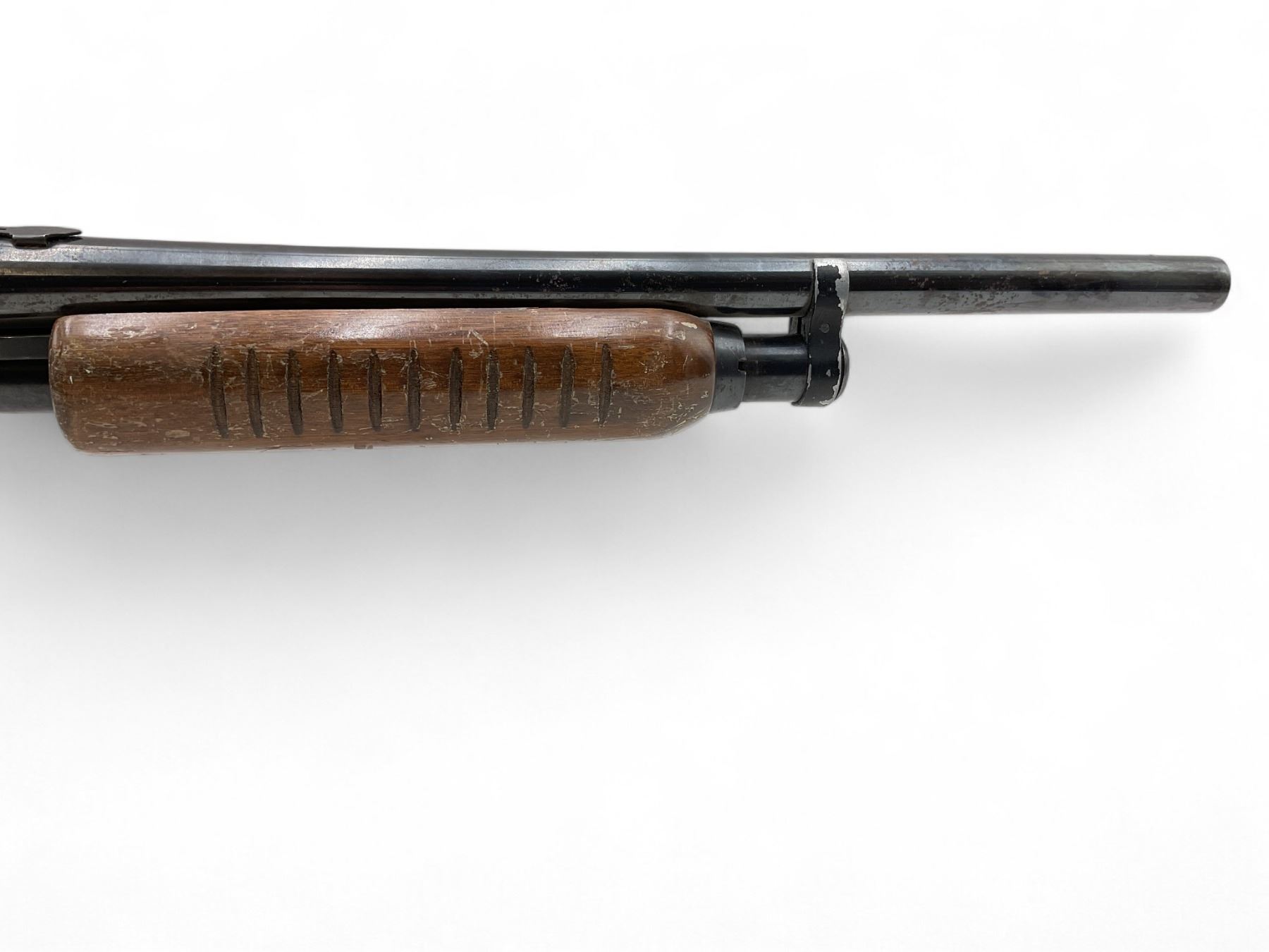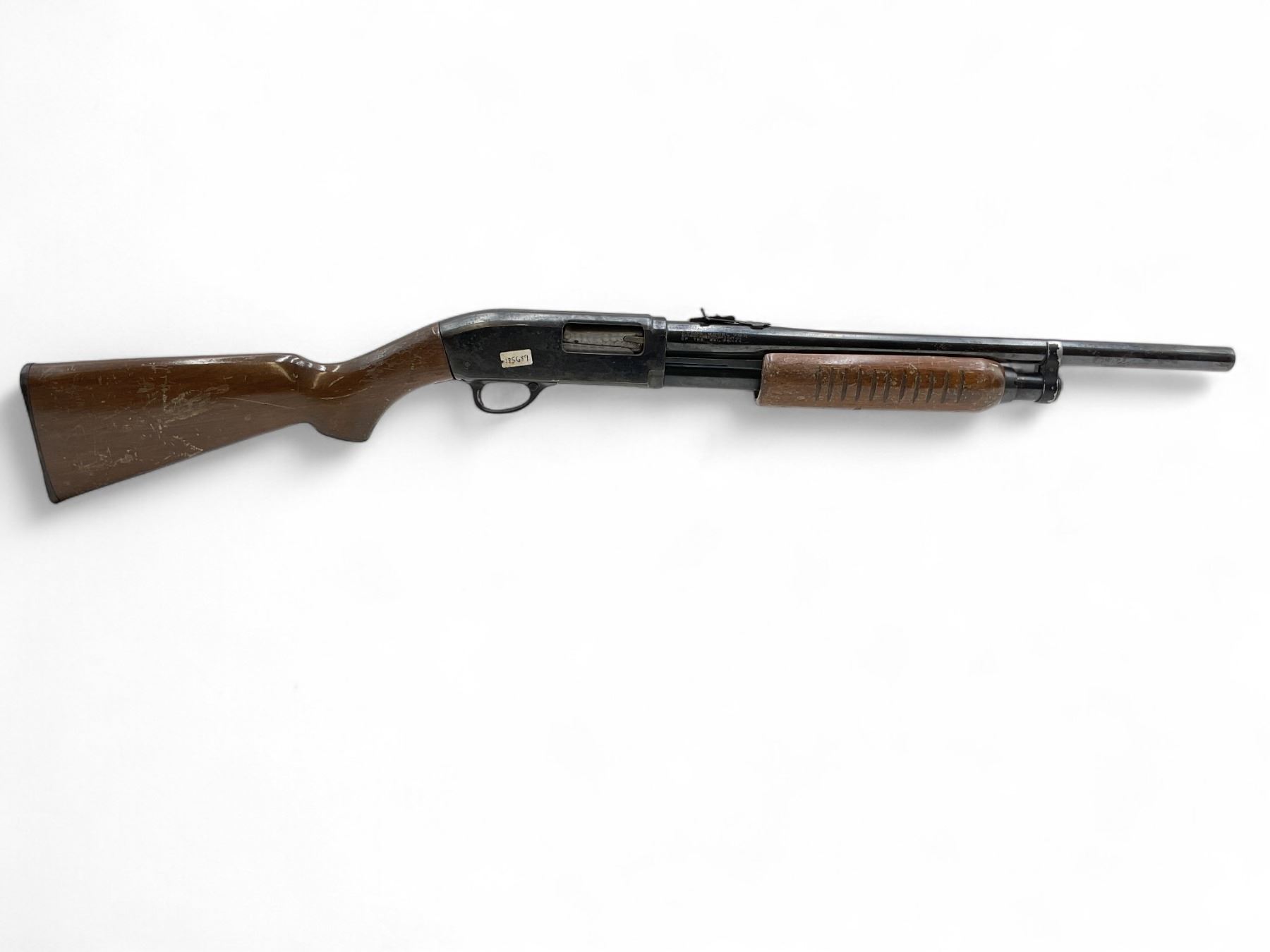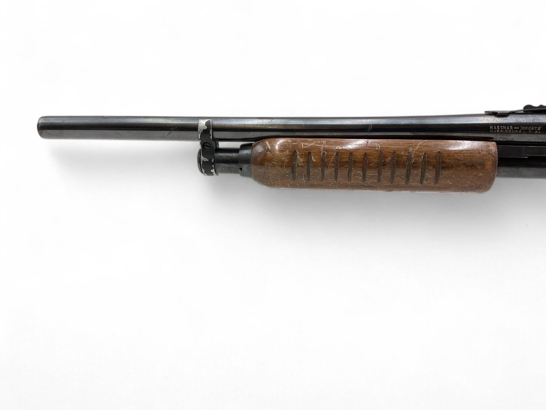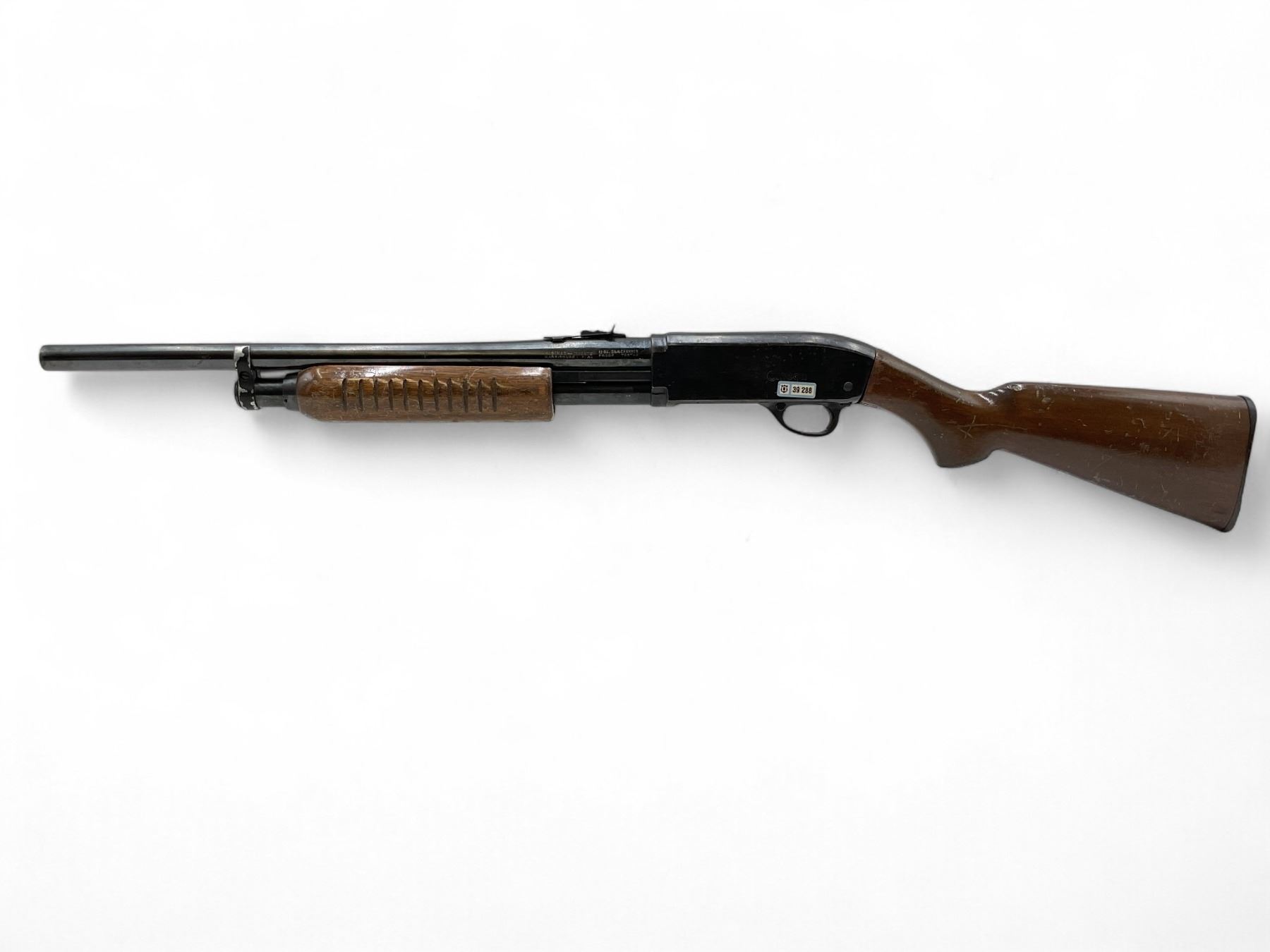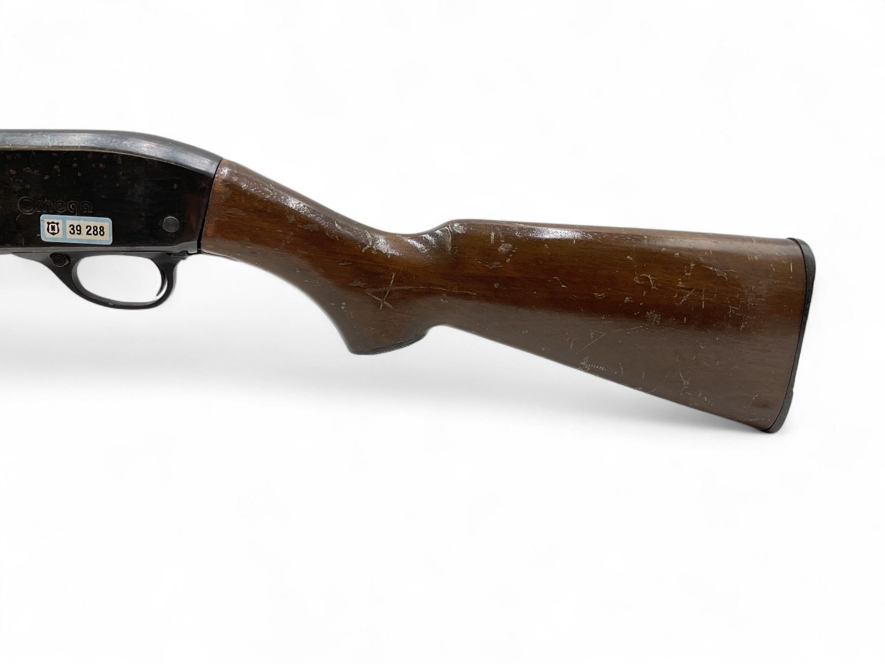 Omega Model 30R Pump Action Shotgun 12Ga 2.75" Chamber 20" Barrel Wood Stock. Barrel appears to have been shortened; missing front sight, adjustable rear sight. Rear stock is loose; action will only open part way and jams. Trigger is jammed and does not move. May be missing pieces. Includes hard plastic case. This is a non-restricted firearm.