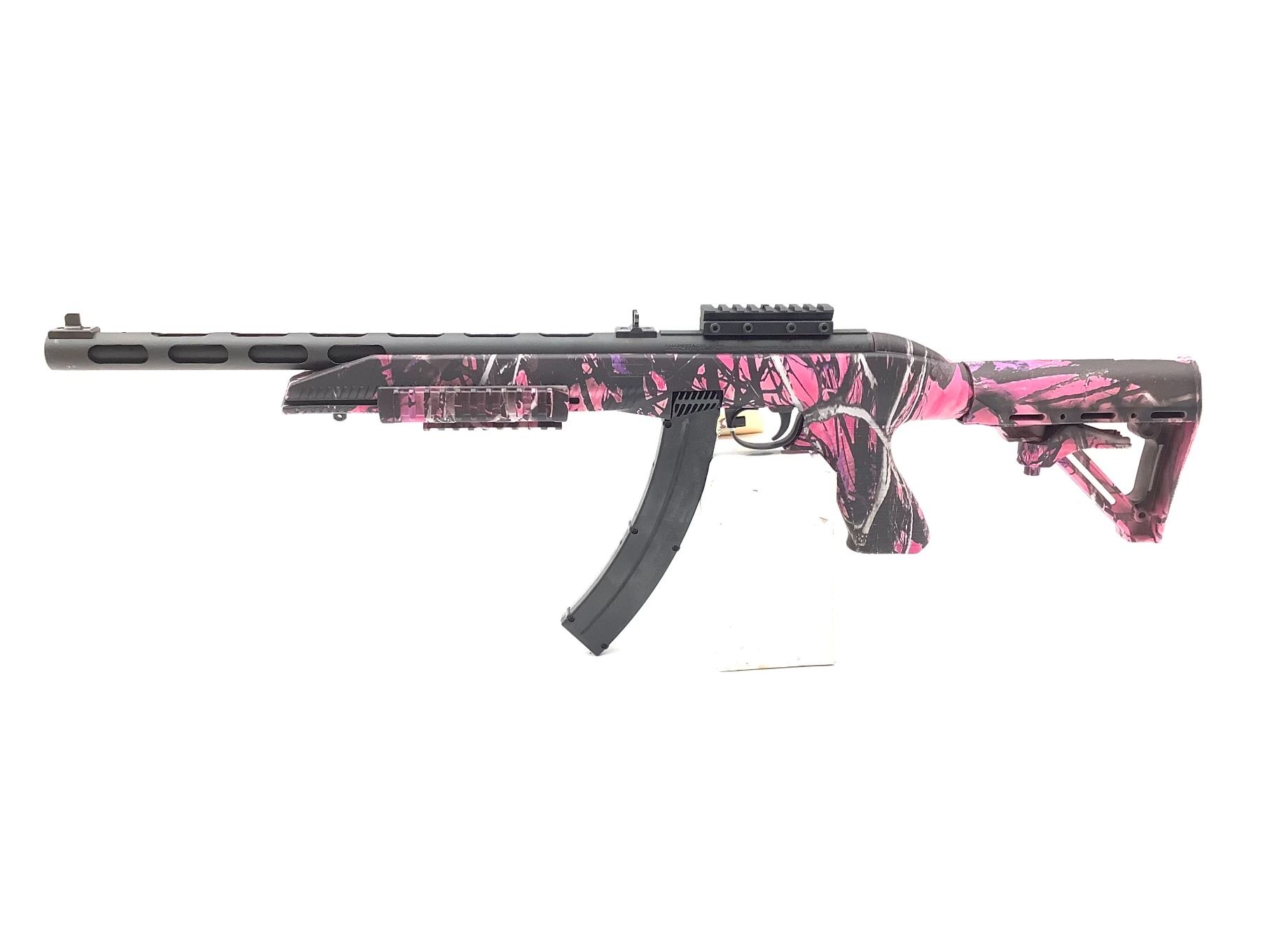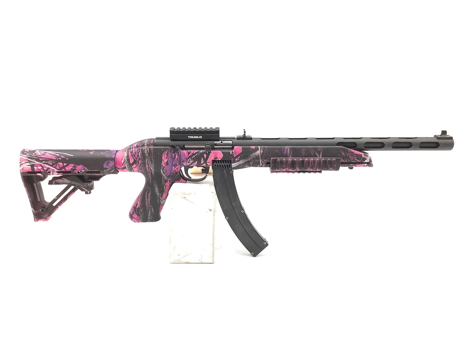 A used Pietta PPS50 semi-automatic rifle chambered in .22 Long Rifle. Muddy Girl synthetic stock. Tru-Glo elevated scope rail. Comes with one magazine.