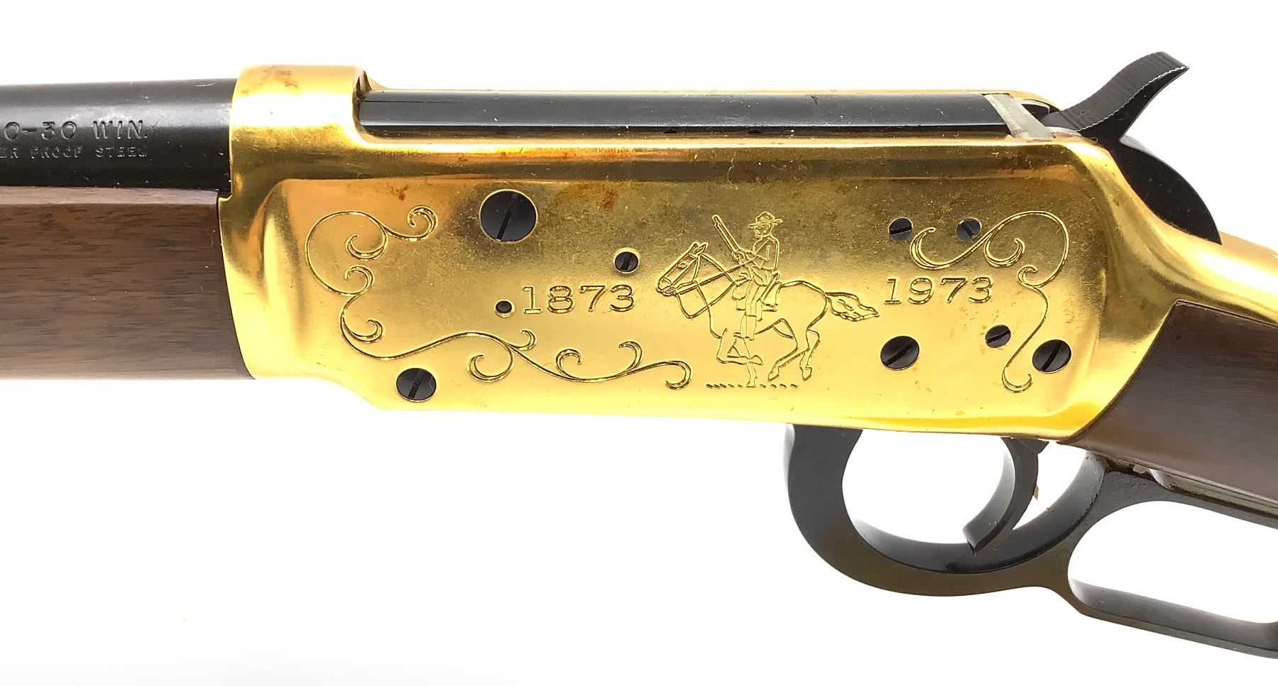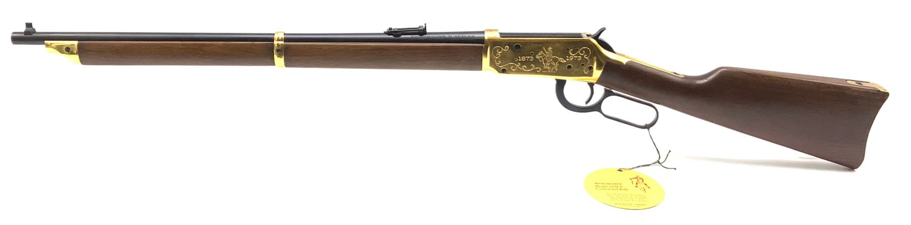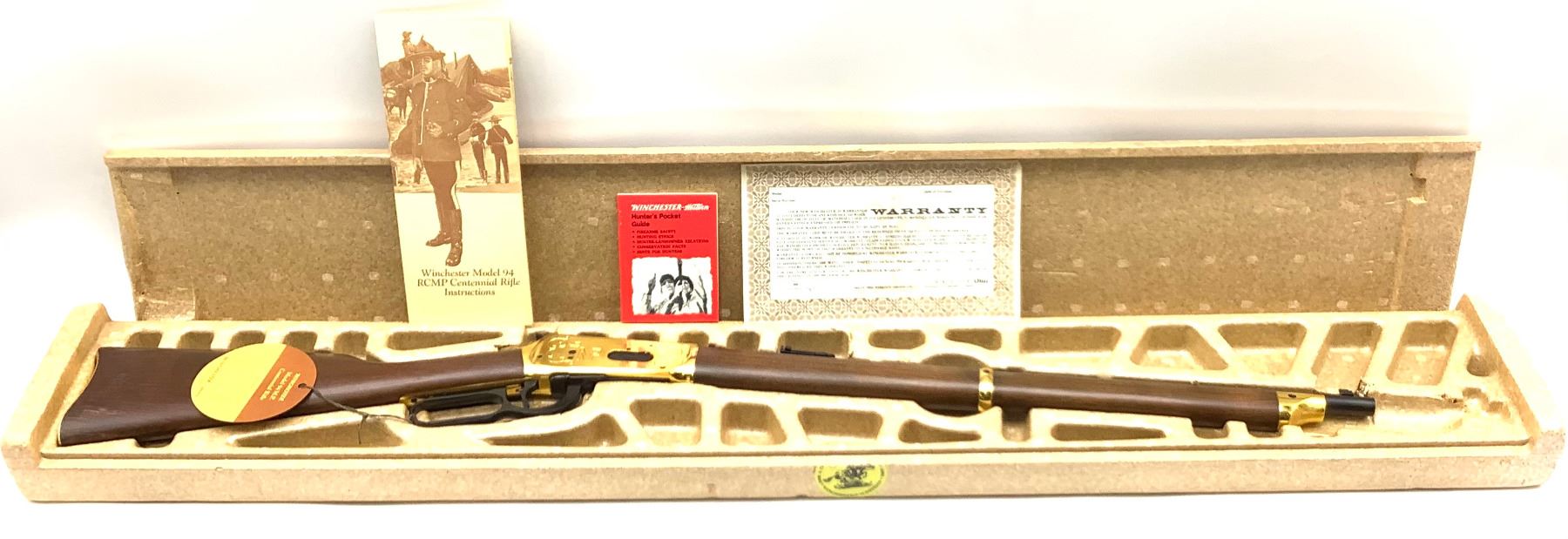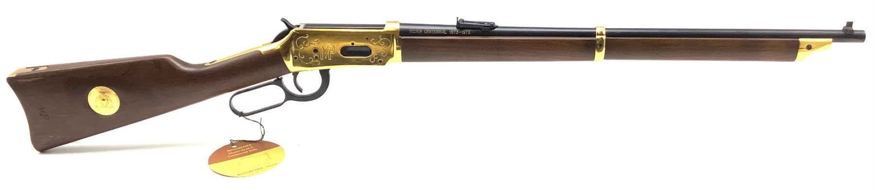 An unfired Centennial Winchester 94 lever-action rifle, 22" barrel chambered in .30-30 Winchester. This rifle has some water damage evident on the buttstock (photos) and rust blistering under the gold finish by the ejection port. The paper sleeve is worn and torn (photos). Otherwise appears to be in good condition.